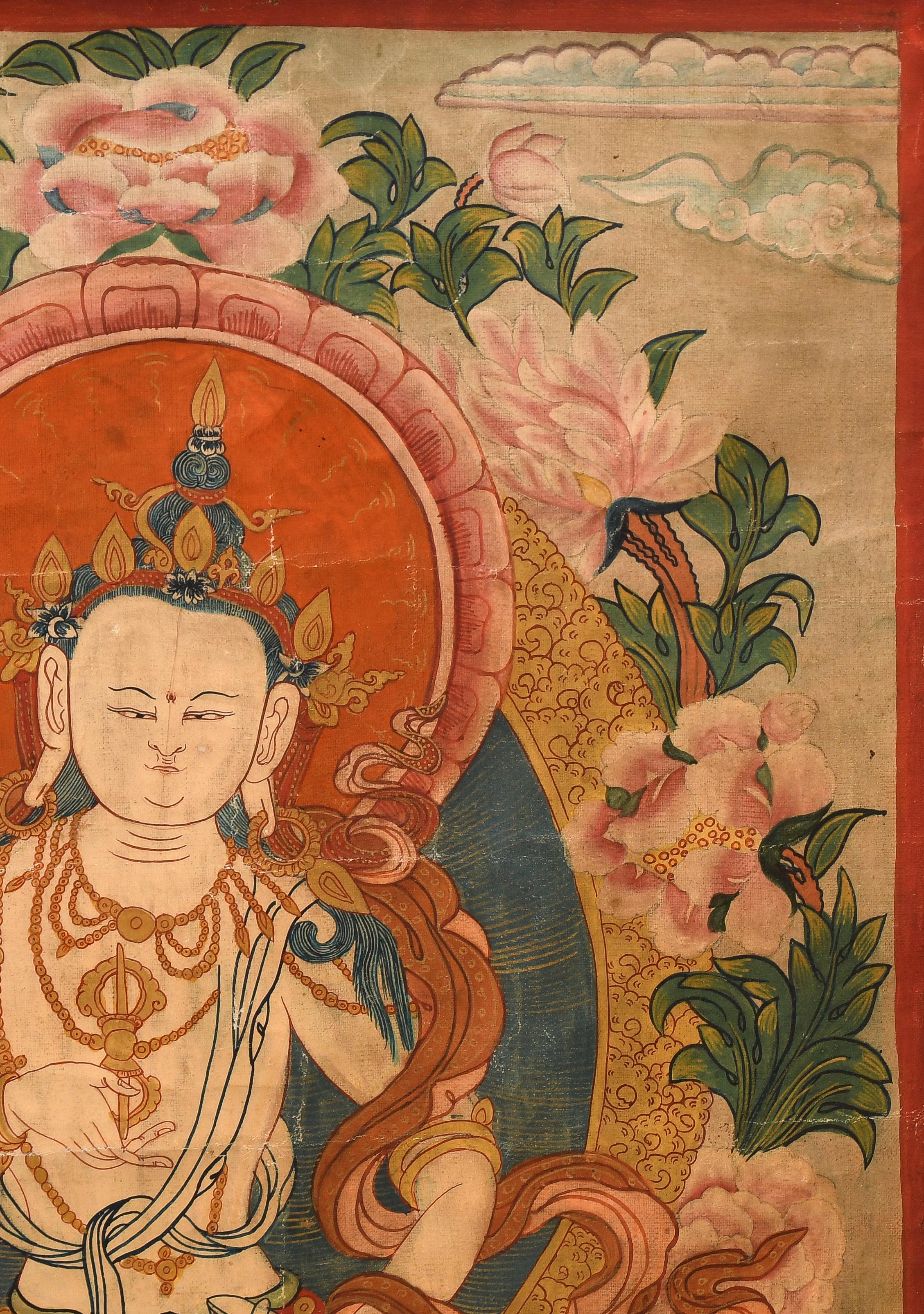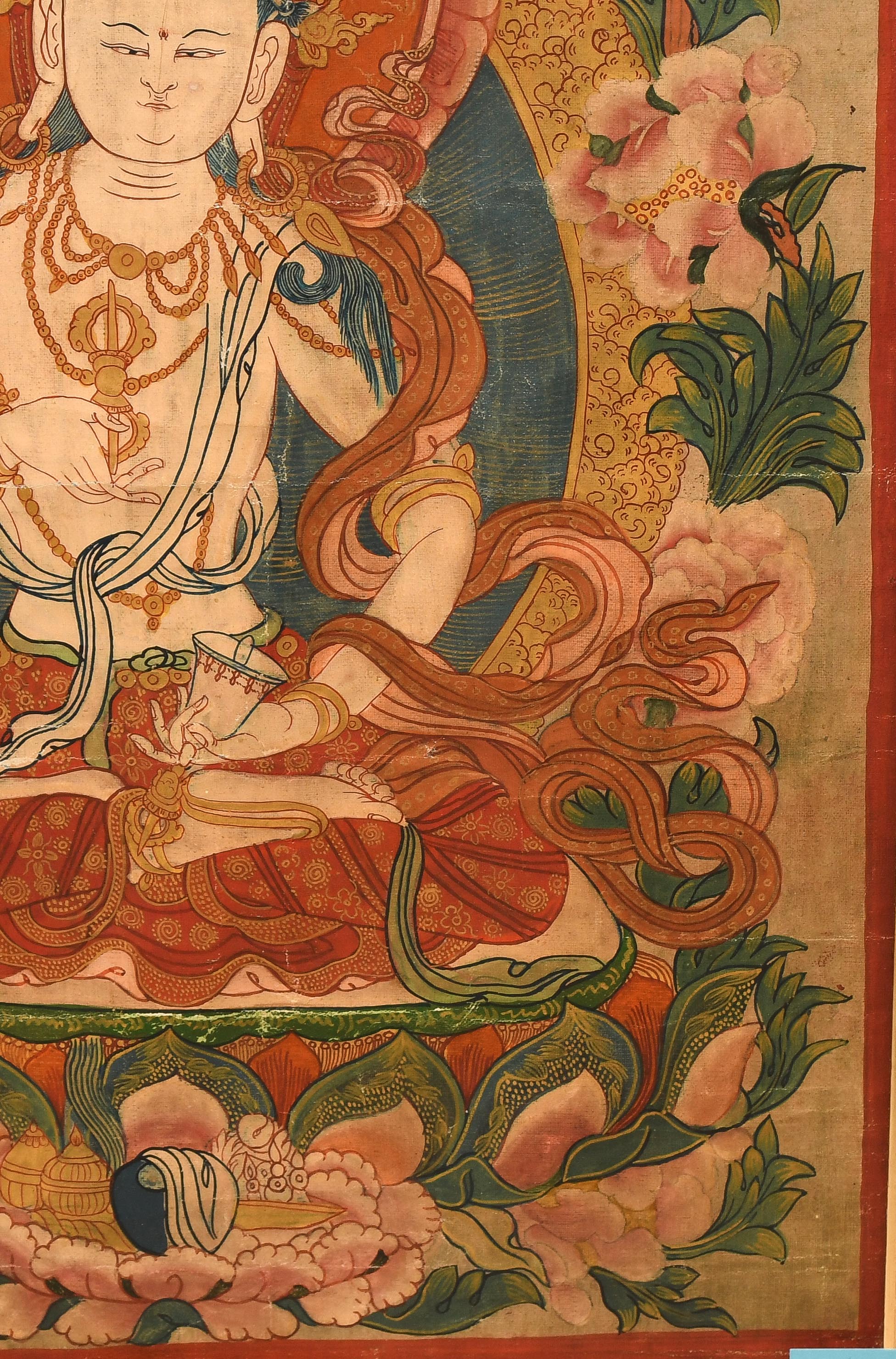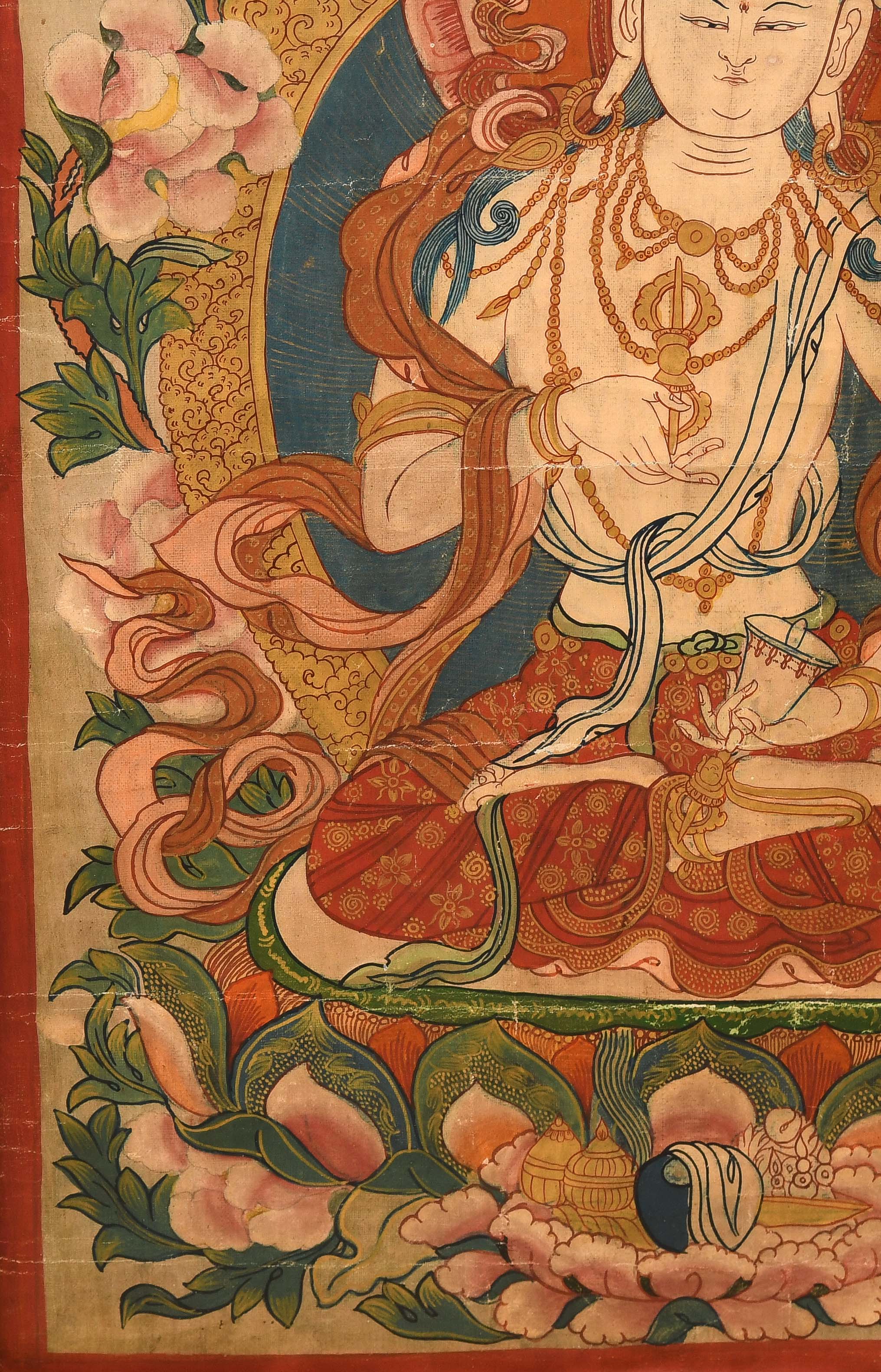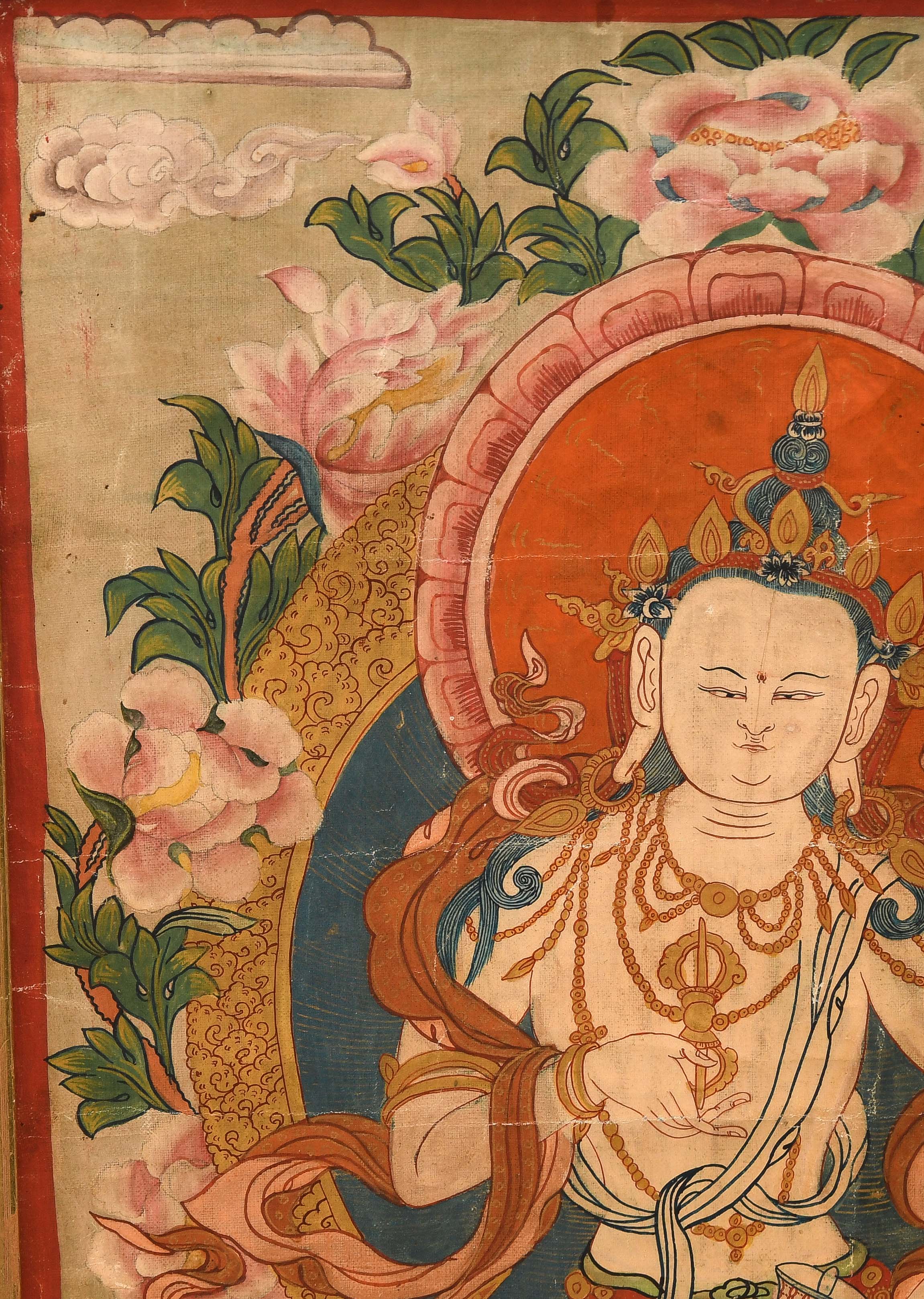 Sinotibetisch, 19.Jh. Gouache auf Stoff. Sitzende Darstellung der Vajrasattva mit Gantha und Vajra in den Händen. Gerahmt. 36,5x26 cm. - Beschnitten.