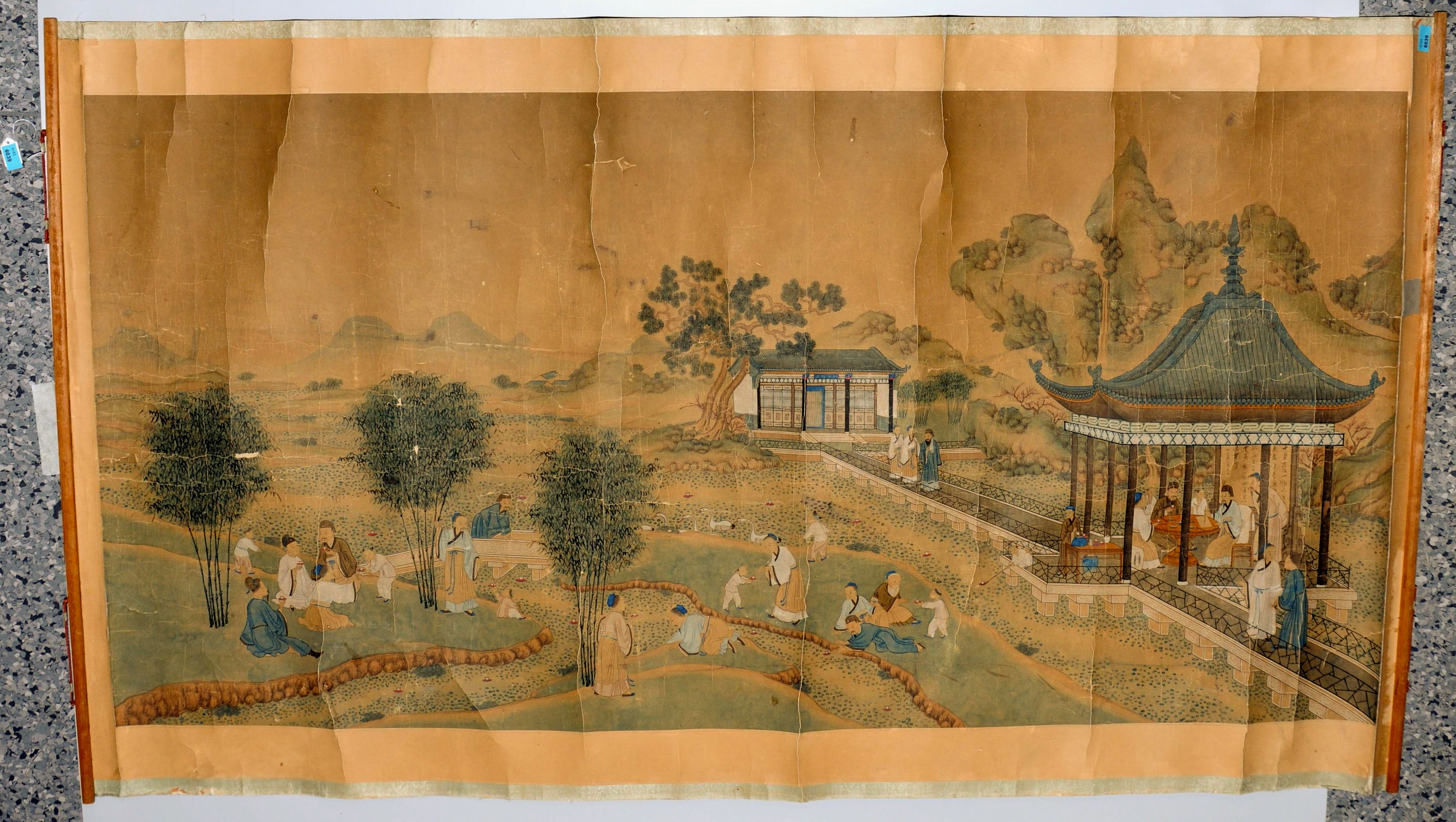 China, 20.Jh. Tusche und Farben auf Papier. Gruppe von Gelehrten in Gartenanlage mit Pavillons, Wein trinkend und sich unterhaltend. 64x130 cm. Aufgezogen.