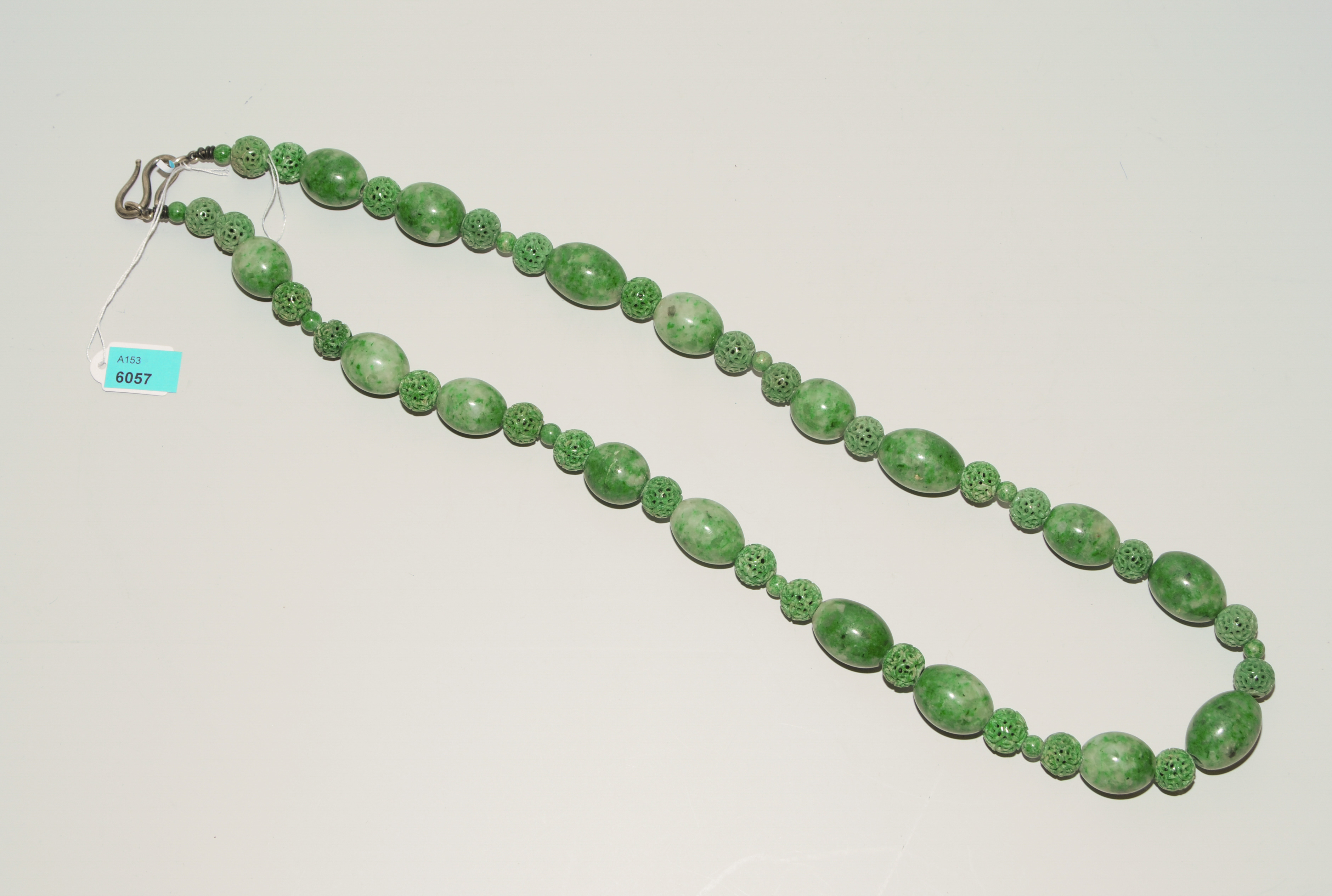 China, 20.Jh. Jade. 17 ovalförmige Jadeperlen, 28 durchbrochen gearbeitete Jadekugeln sowie 10 kleine Jadeperlen zur Kette aufgezogen. Metallverschluss. L 85 cm.