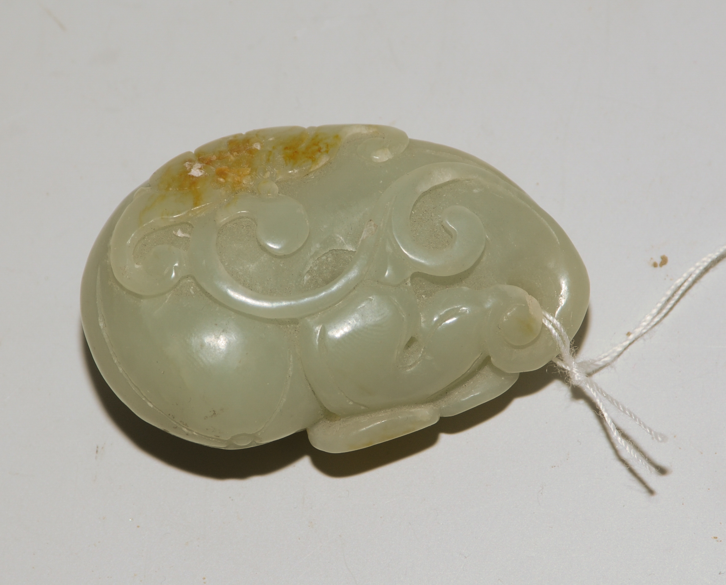 China, 20.Jh. Celadonfarbene Jade mit rostroten Zonen. Kürbis mit reliefierter Fledermaus und Lingzhi-Pilz. L 5,5 cm.