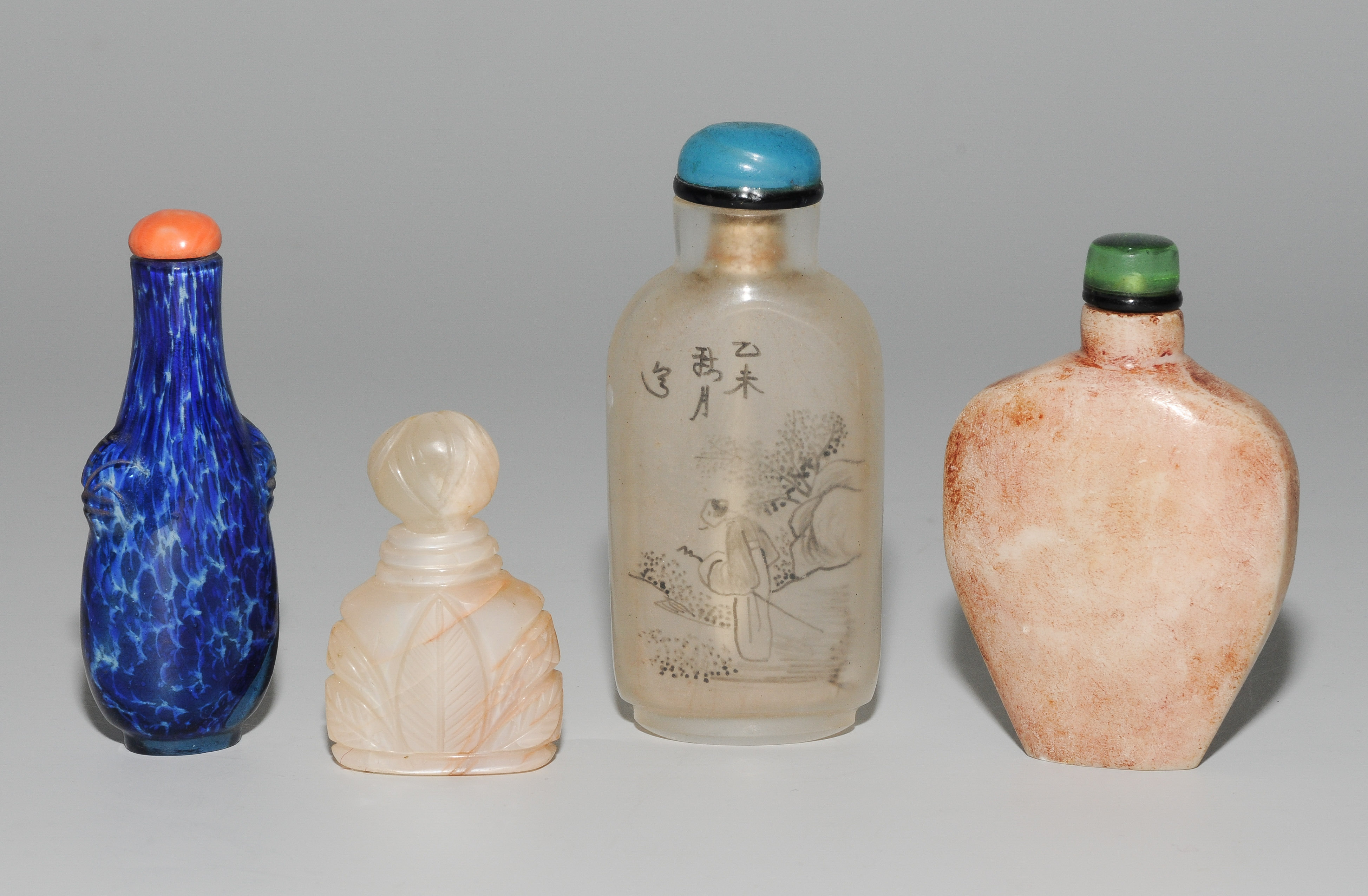 China, 20.Jh. Drei Snuffbottles aus Glas und ein kleiner Suffbottle aus Perlmutt. H 4,3–7,5 cm.