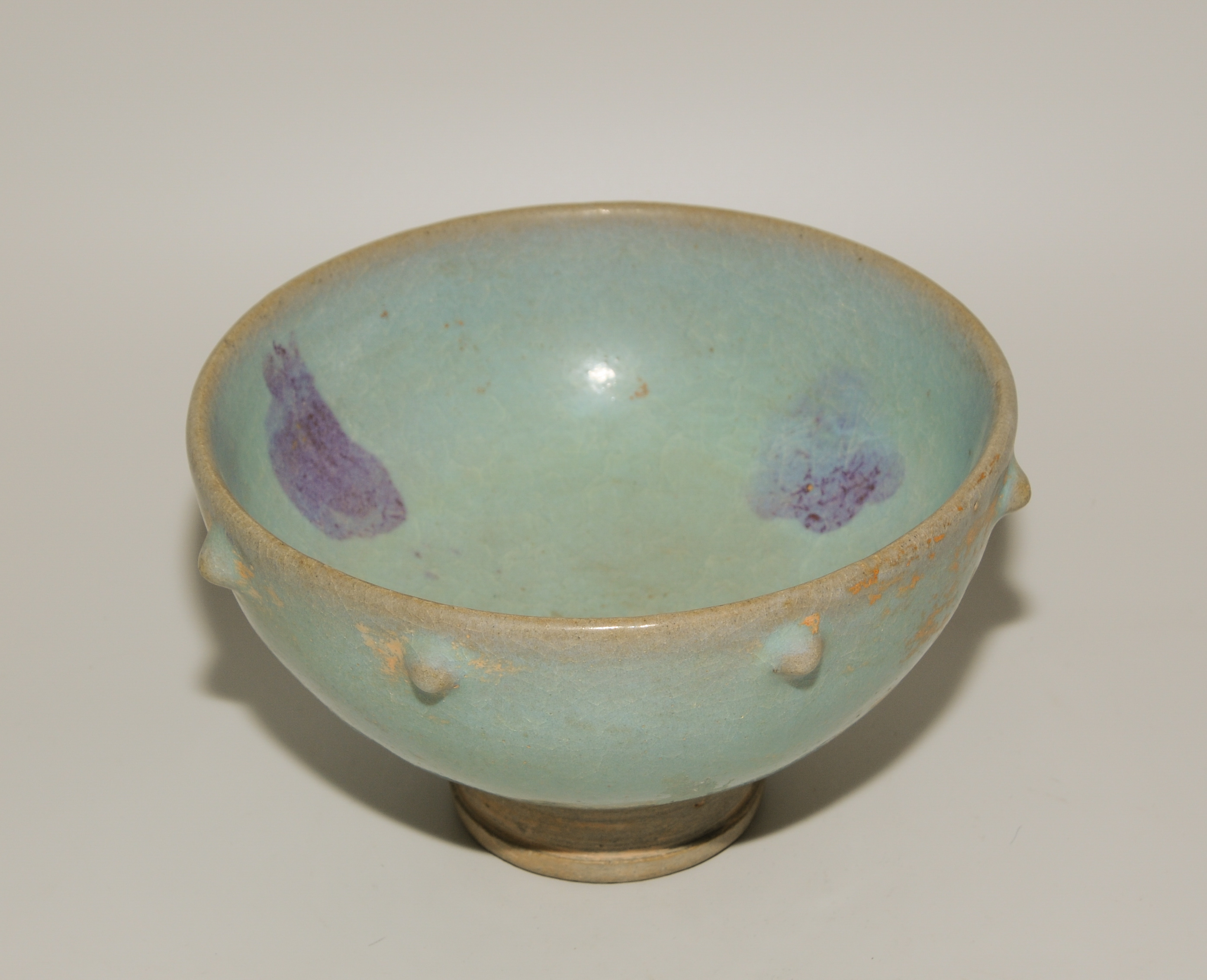China. Keramik mit Junyao imitierender Glasur. Schale auf Standring. Unter dem Rand verziert mit Noppen. H 11,5, D 17,3 cm.