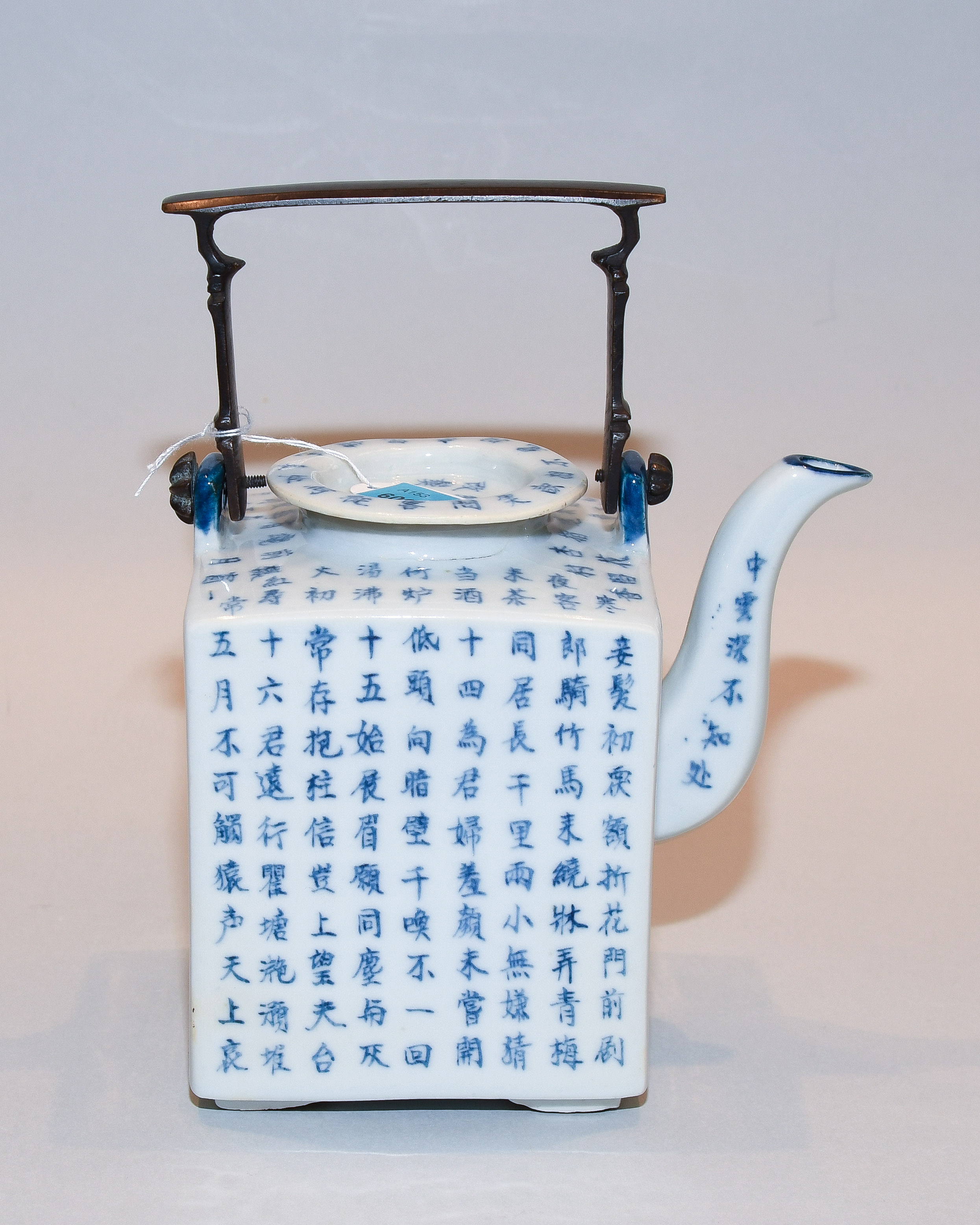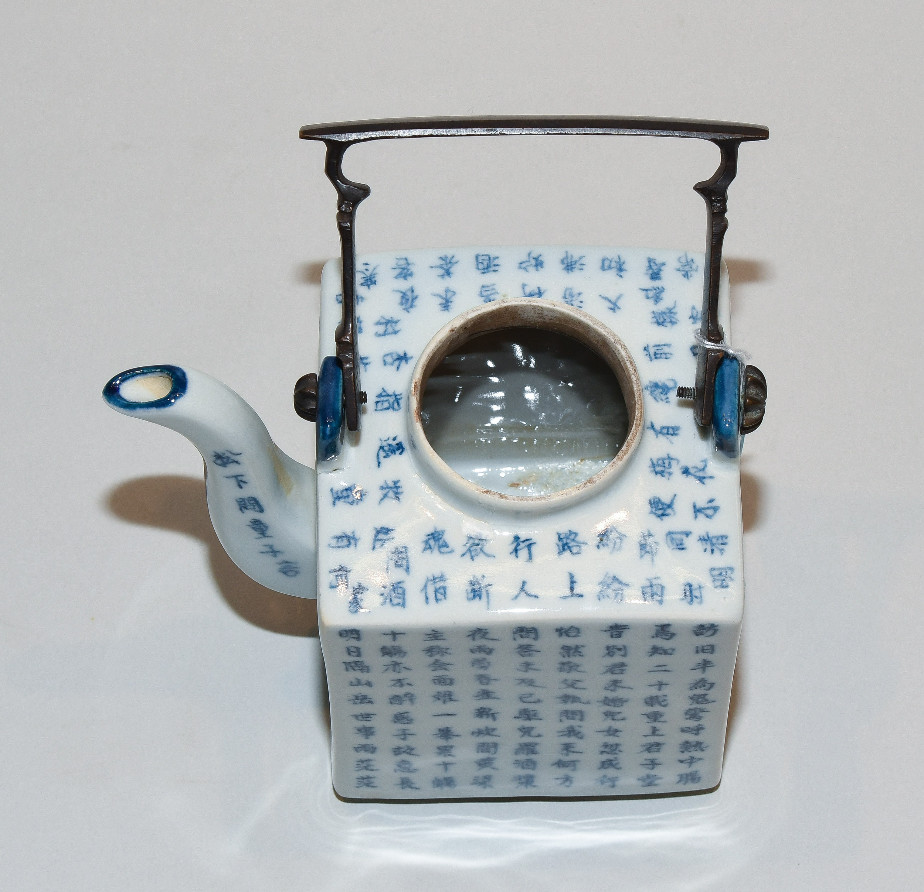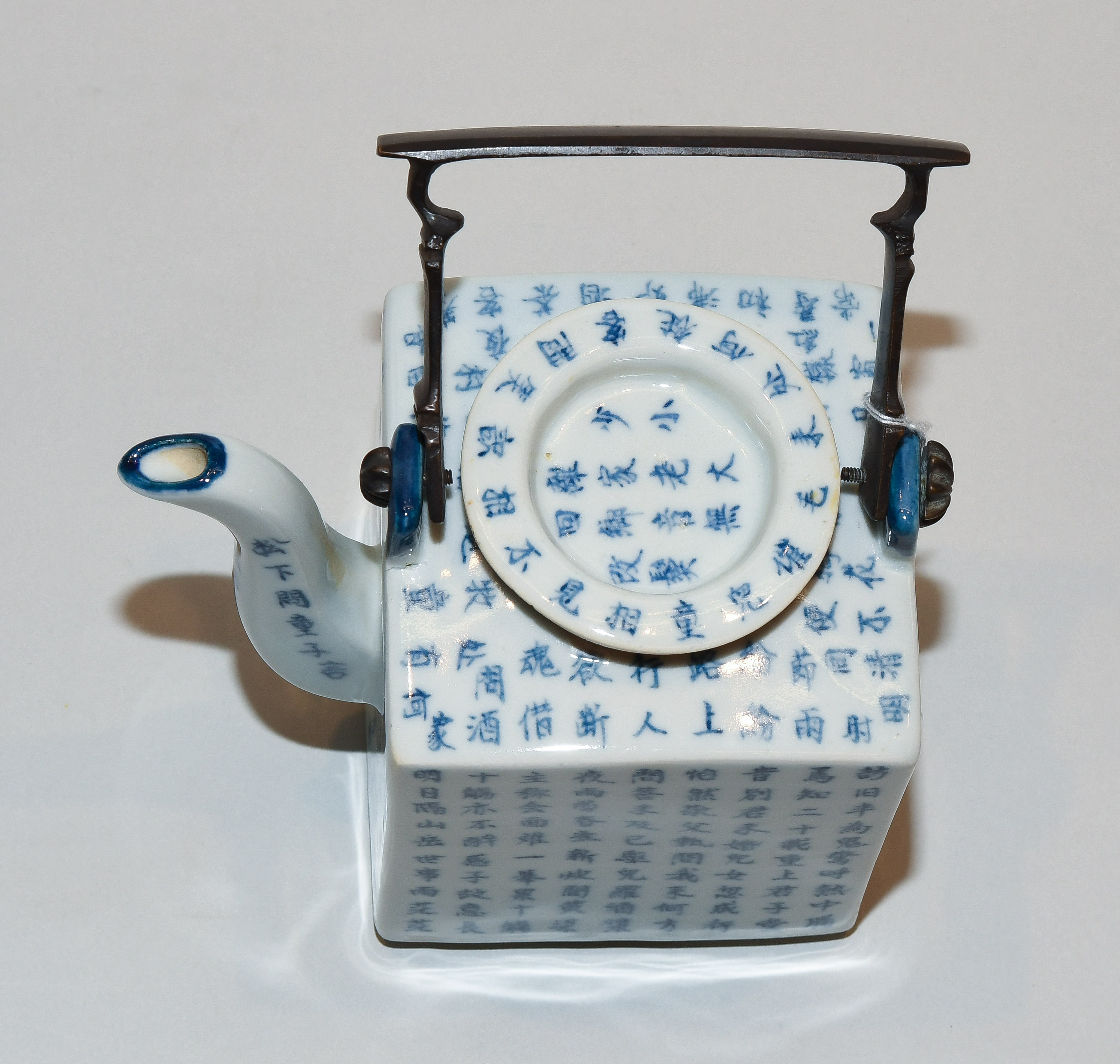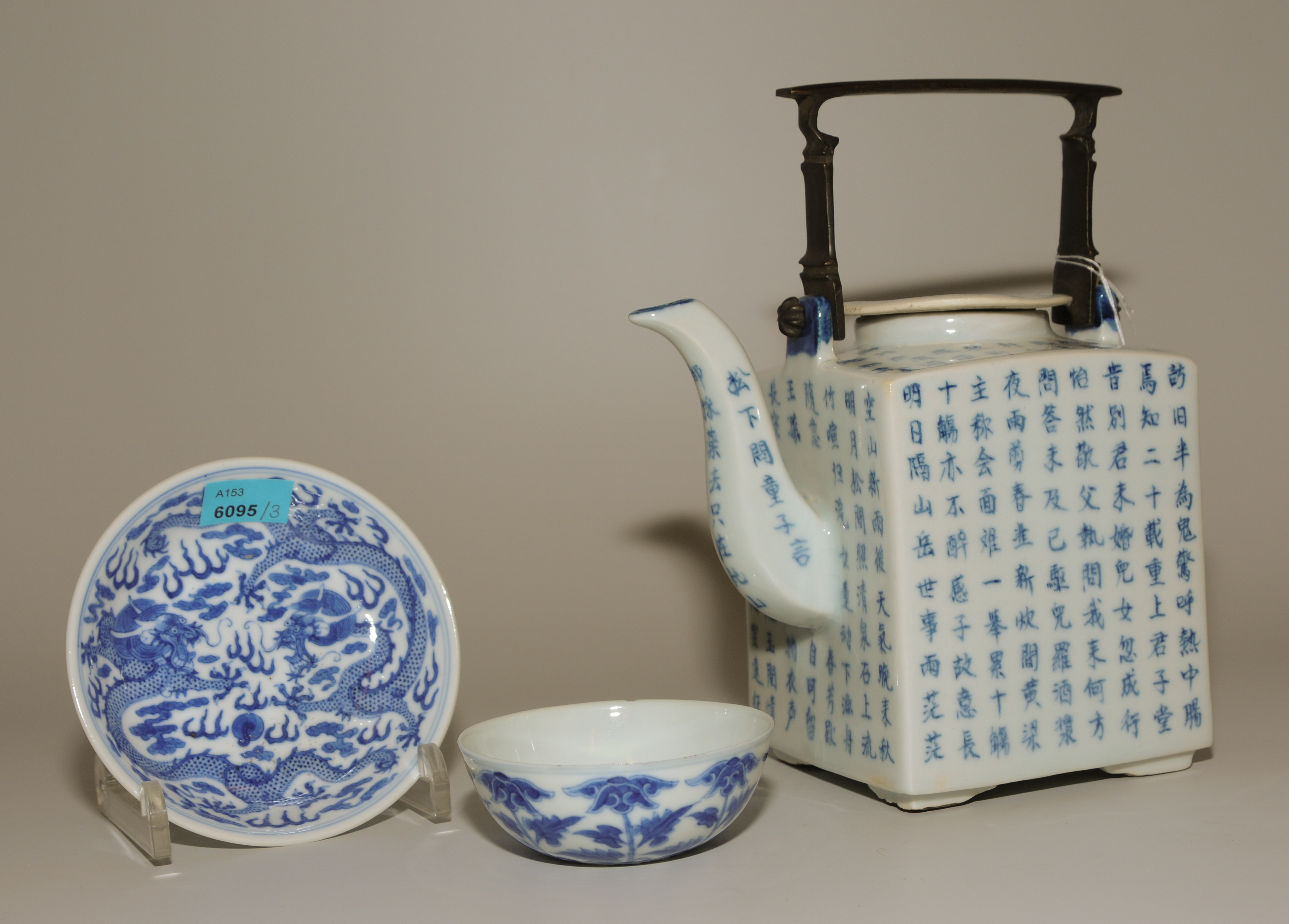 China, 20.Jh. Blau-Weiss-Porzellan. Quadratische Teekanne allseitig verziert mit dem Gedicht "Herbstabend in den Bergen" von Wang Wei. Henkel aus Metall. Boden mit Ren Shen Zhencang-Marke. H 13. / Zwei kleine Schalen mit Lotosdekor bzw. Drachenpaar. Beide mit Sechs-Zeichen Guangxu-Marke. D 8 und 10,5 cm. - Kleine Schale am Rand bestossen.