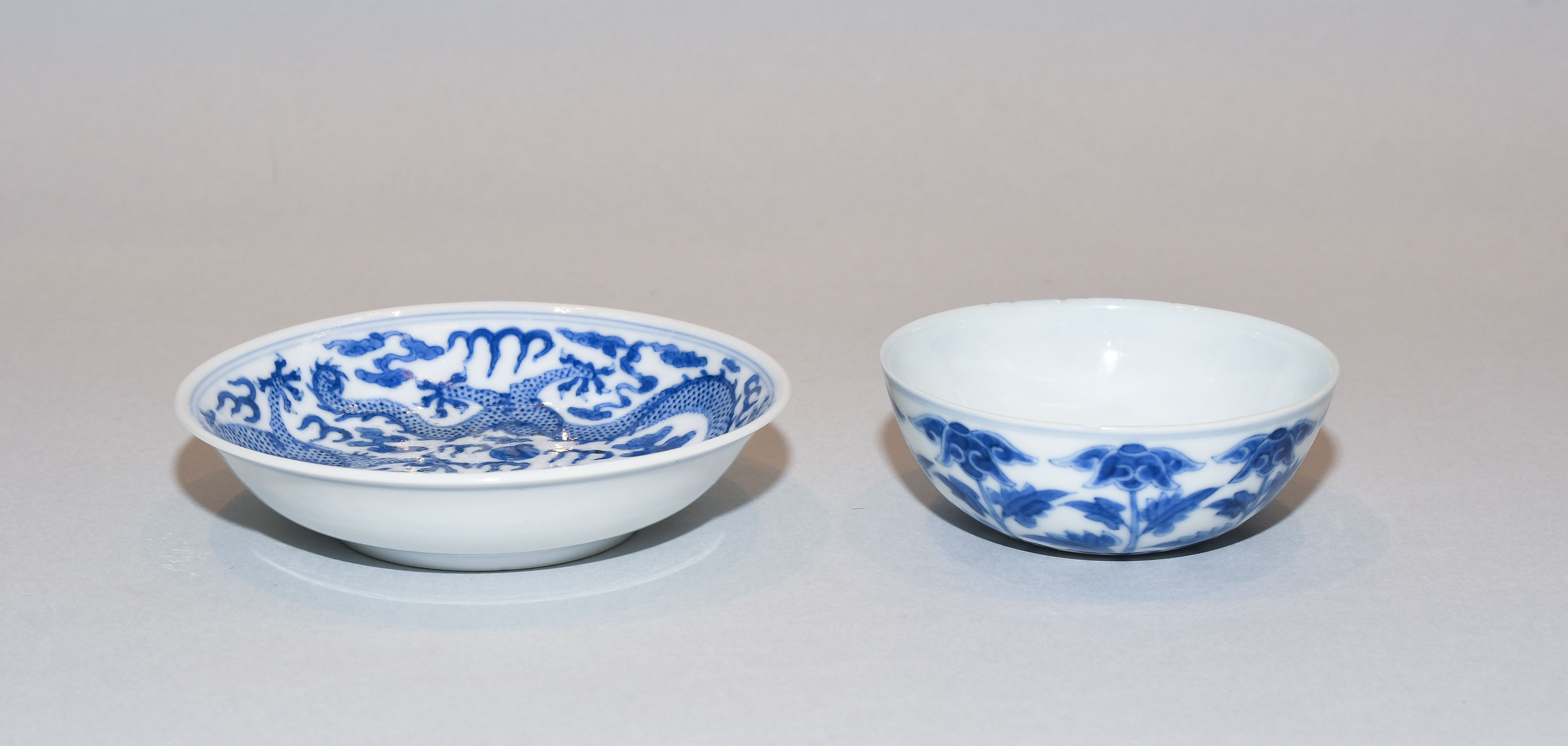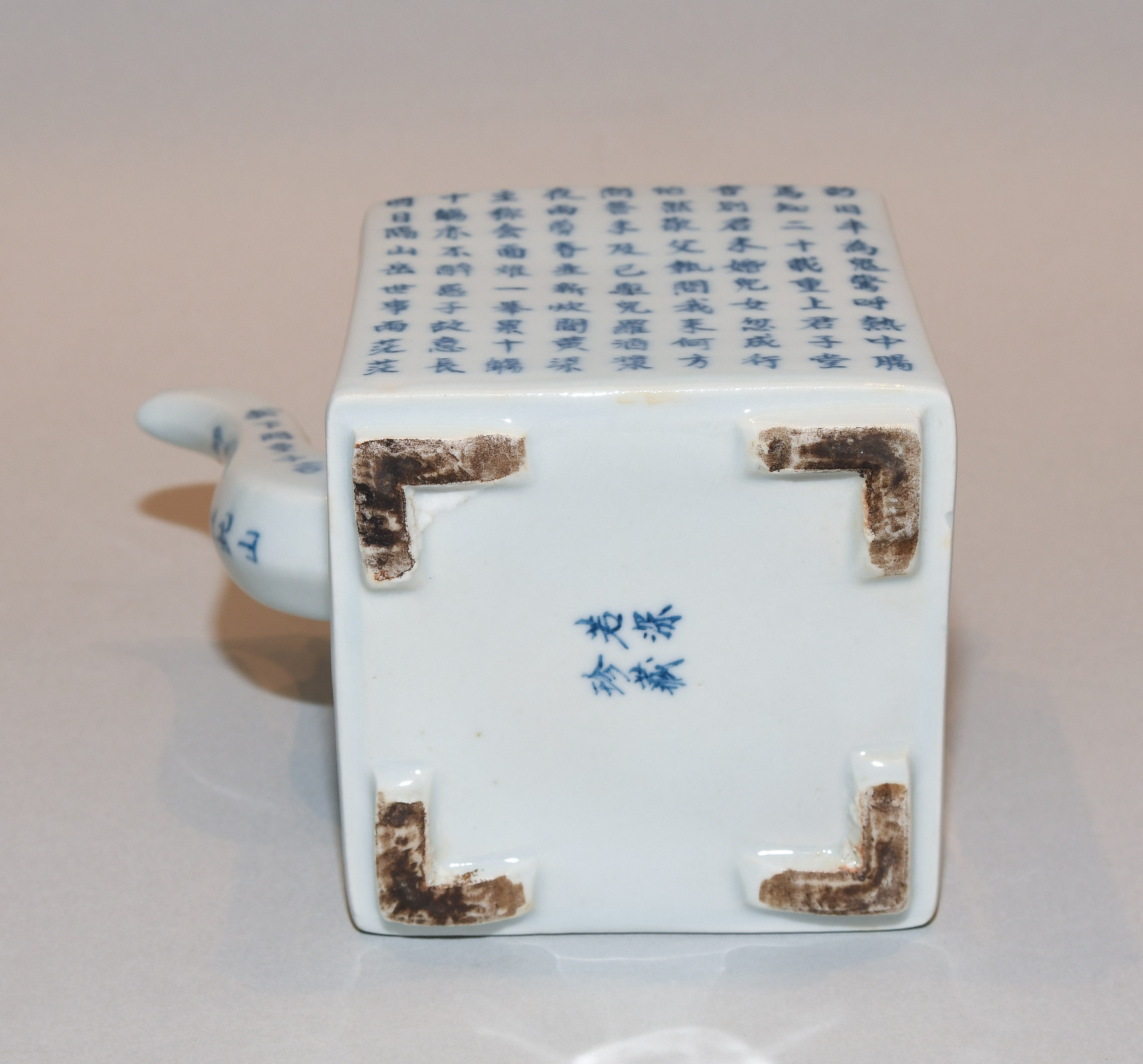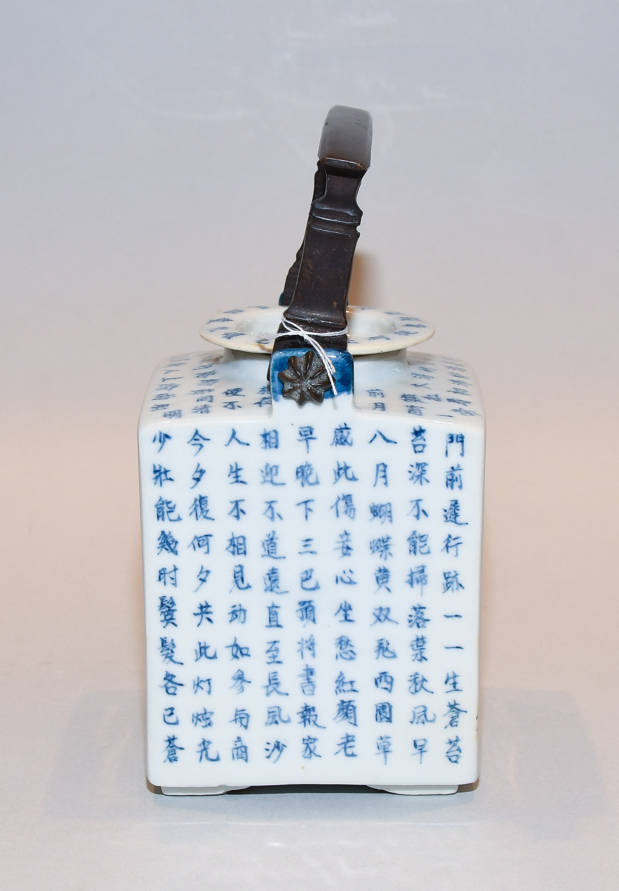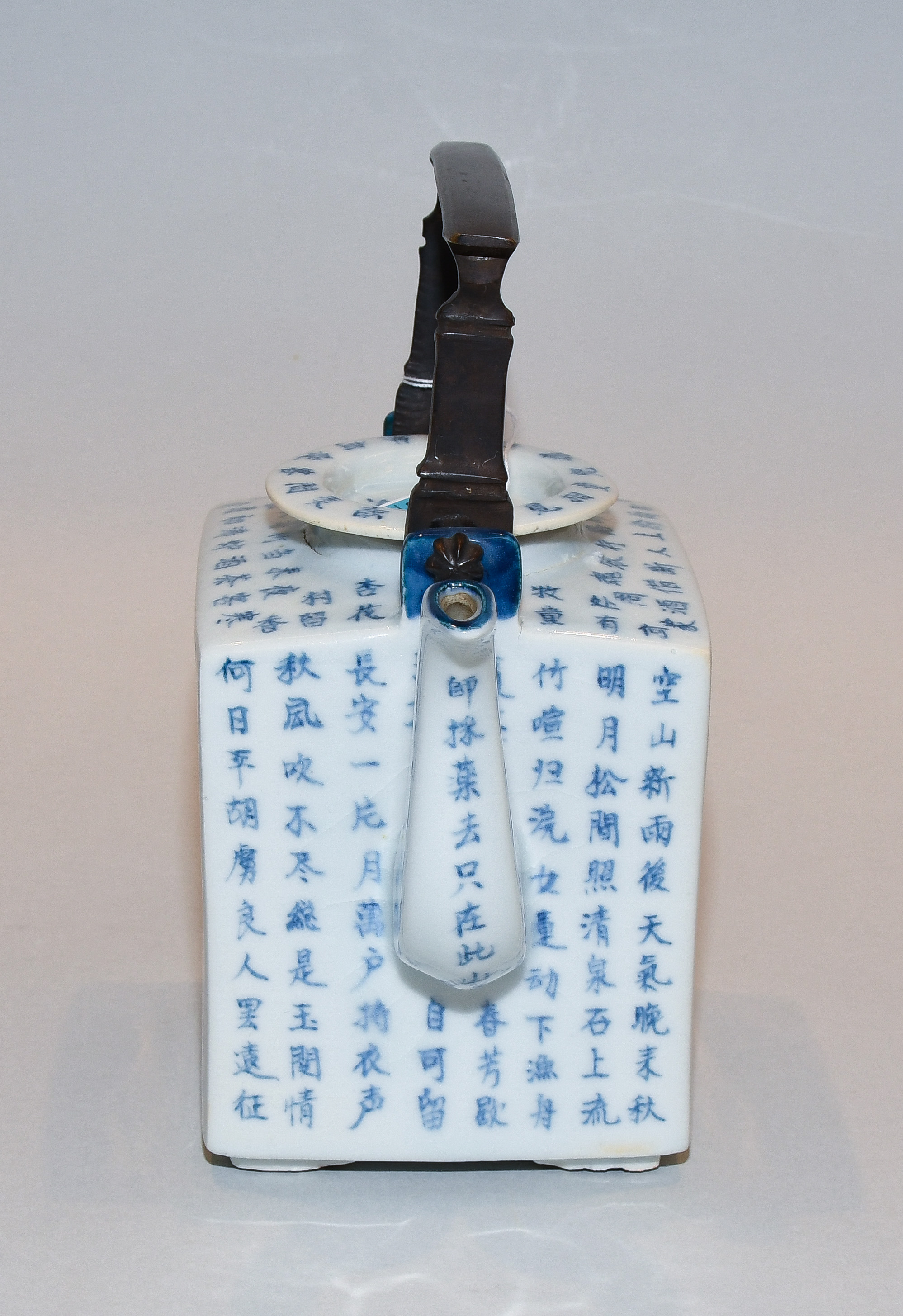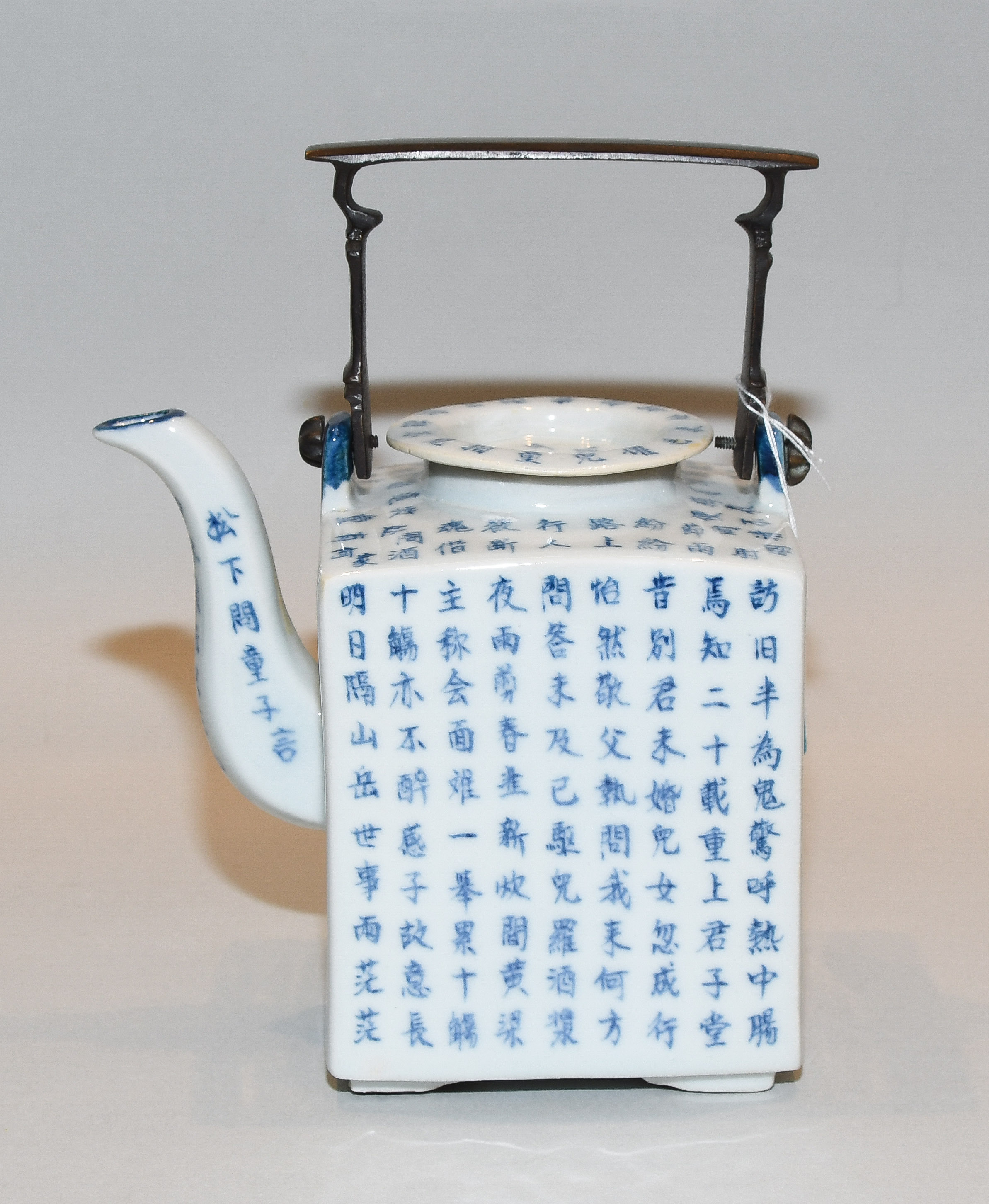 China, 20.Jh. Blau-Weiss-Porzellan. Quadratische Teekanne allseitig verziert mit dem Gedicht "Herbstabend in den Bergen" von Wang Wei. Henkel aus Metall. Boden mit Ren Shen Zhencang-Marke. H 13. / Zwei kleine Schalen mit Lotosdekor bzw. Drachenpaar. Beide mit Sechs-Zeichen Guangxu-Marke. D 8 und 10,5 cm. - Kleine Schale am Rand bestossen.