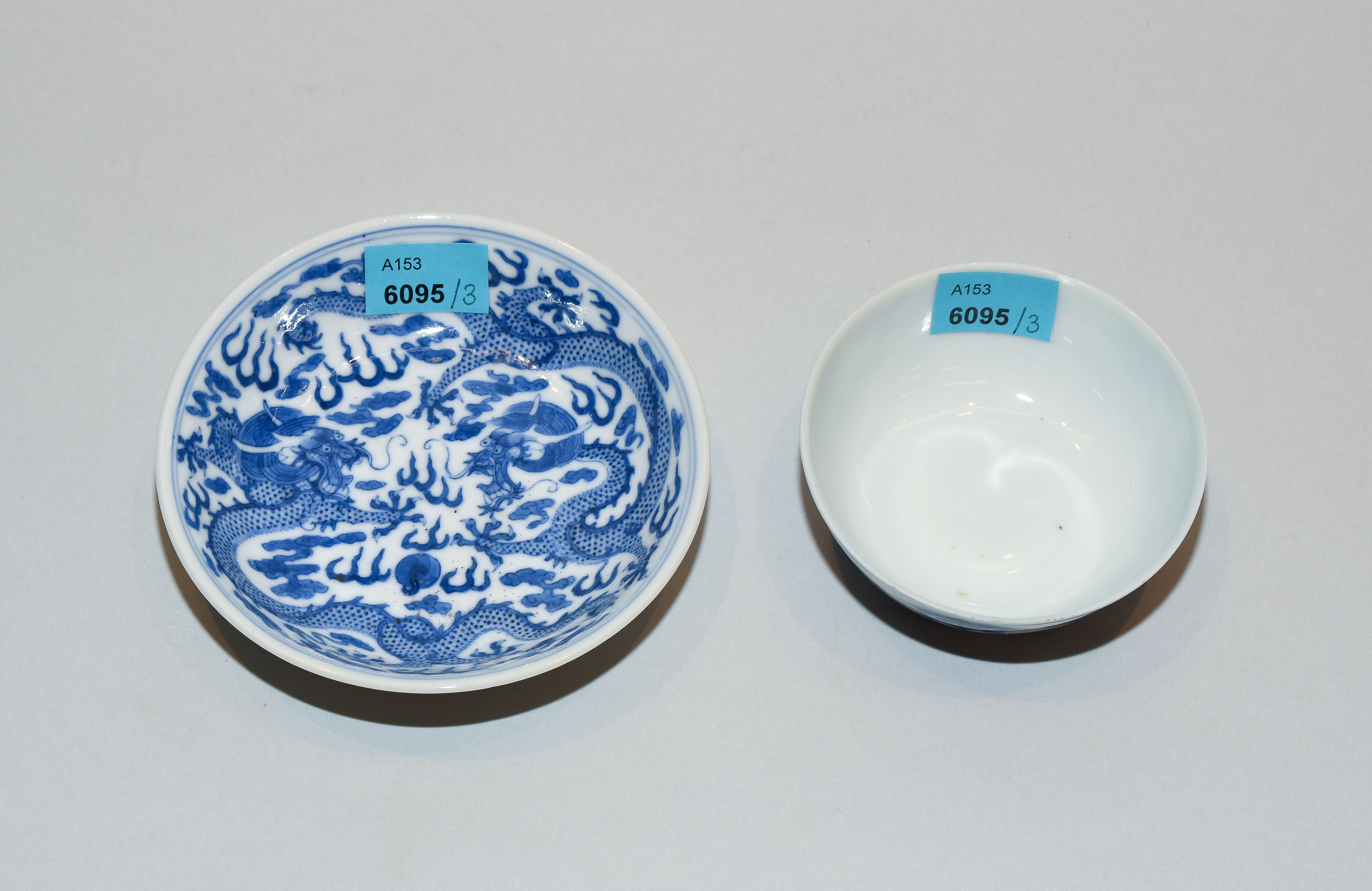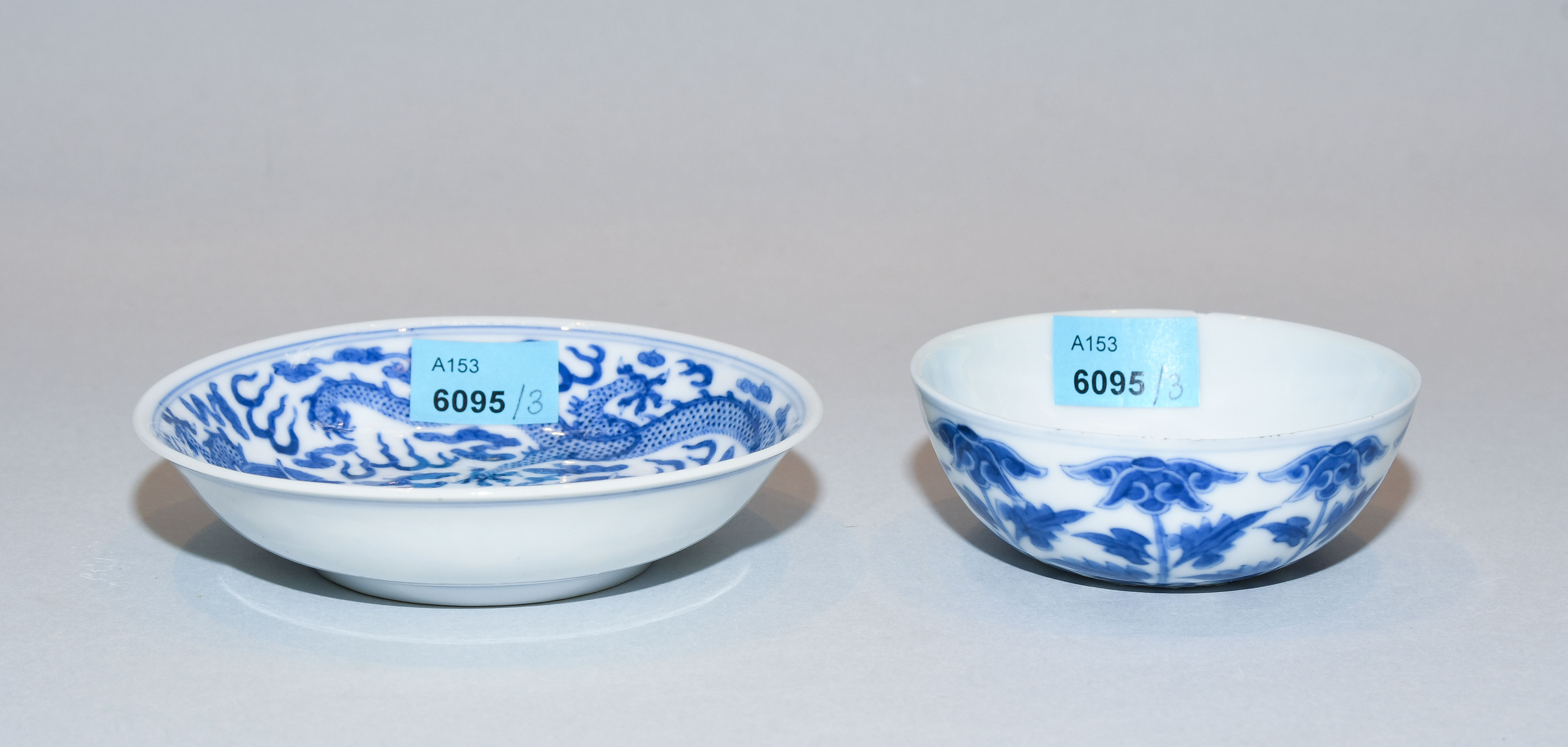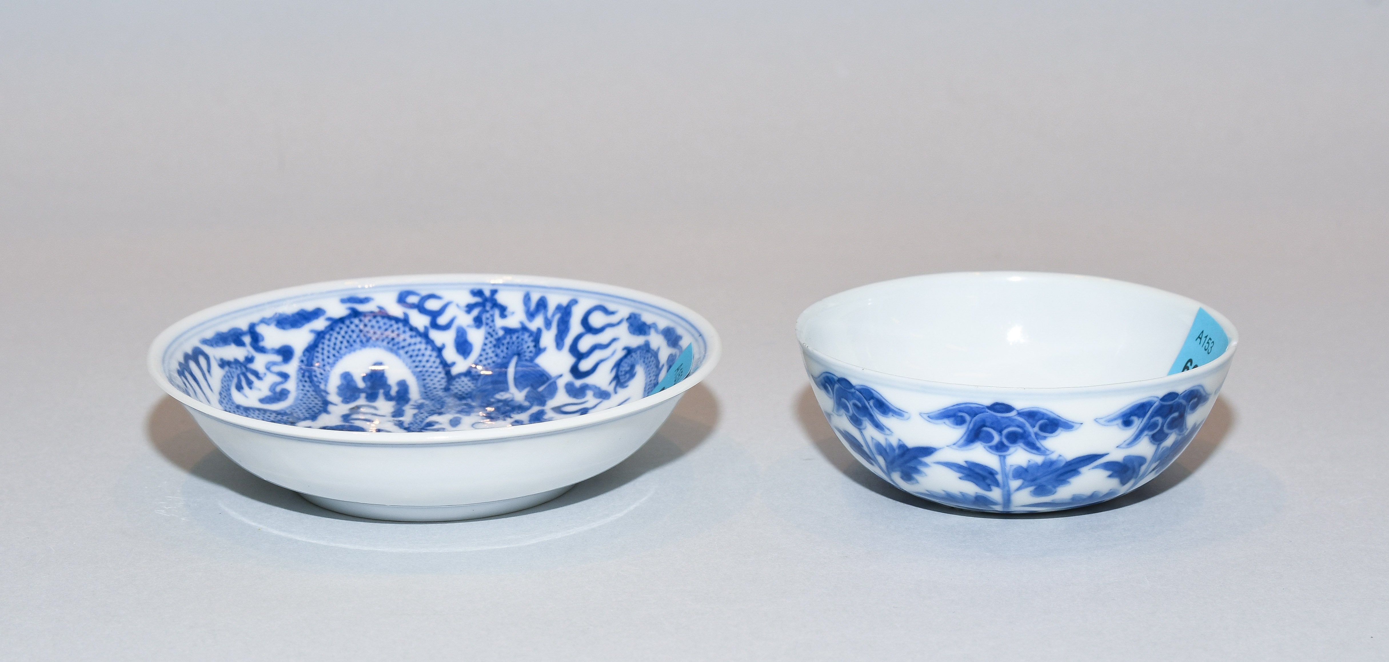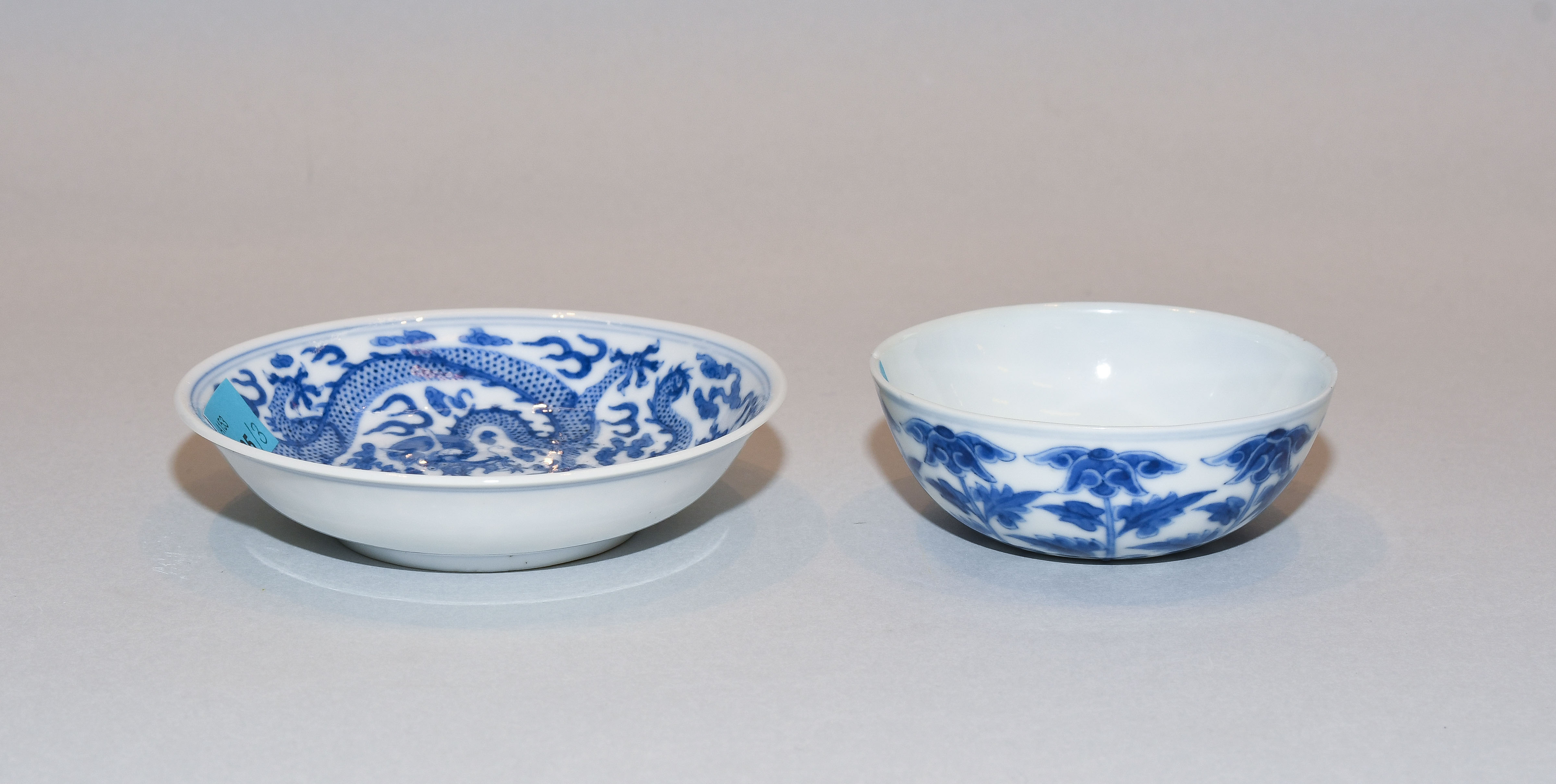China, 20.Jh. Blau-Weiss-Porzellan. Quadratische Teekanne allseitig verziert mit dem Gedicht "Herbstabend in den Bergen" von Wang Wei. Henkel aus Metall. Boden mit Ren Shen Zhencang-Marke. H 13. / Zwei kleine Schalen mit Lotosdekor bzw. Drachenpaar. Beide mit Sechs-Zeichen Guangxu-Marke. D 8 und 10,5 cm. - Kleine Schale am Rand bestossen.