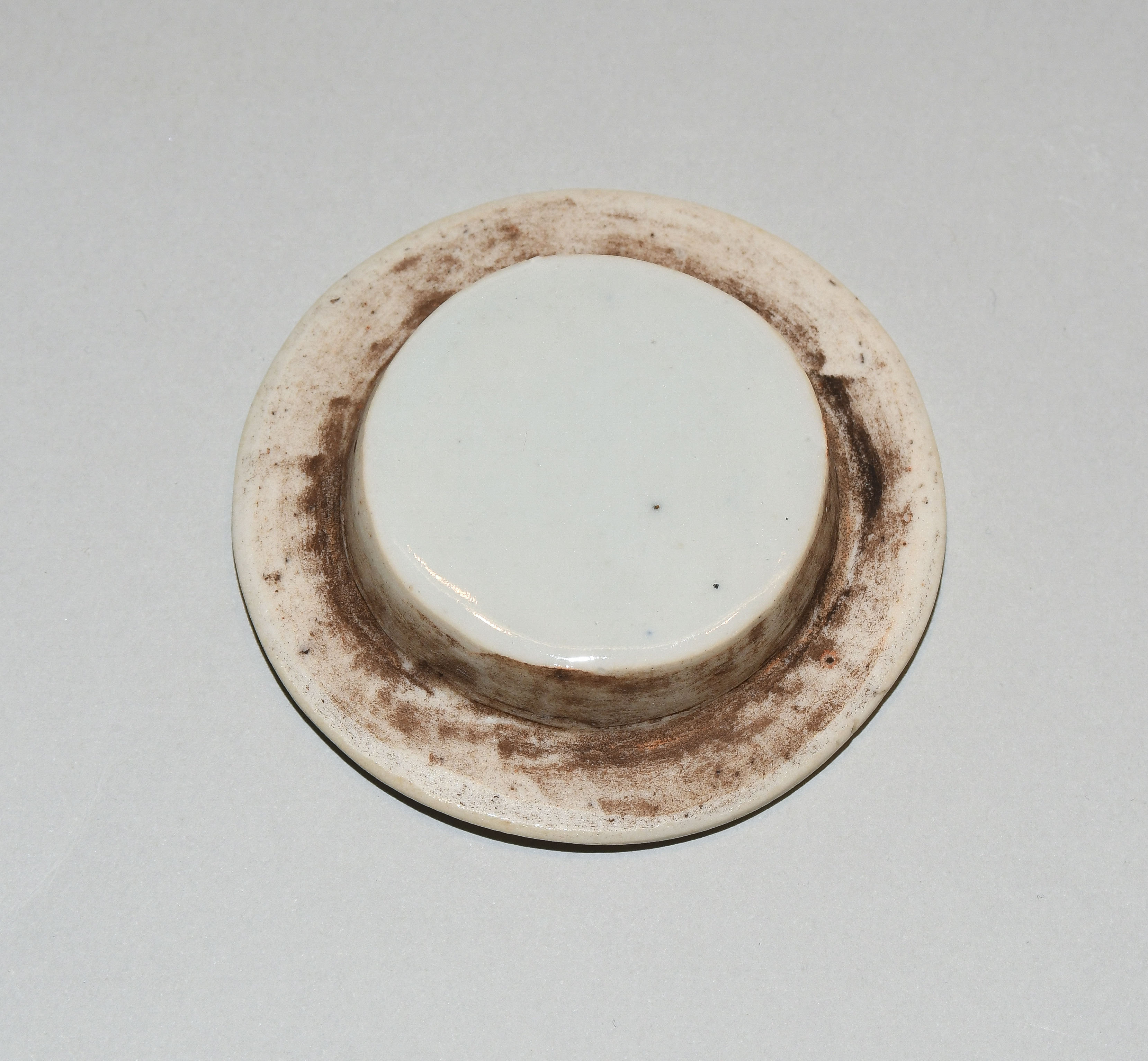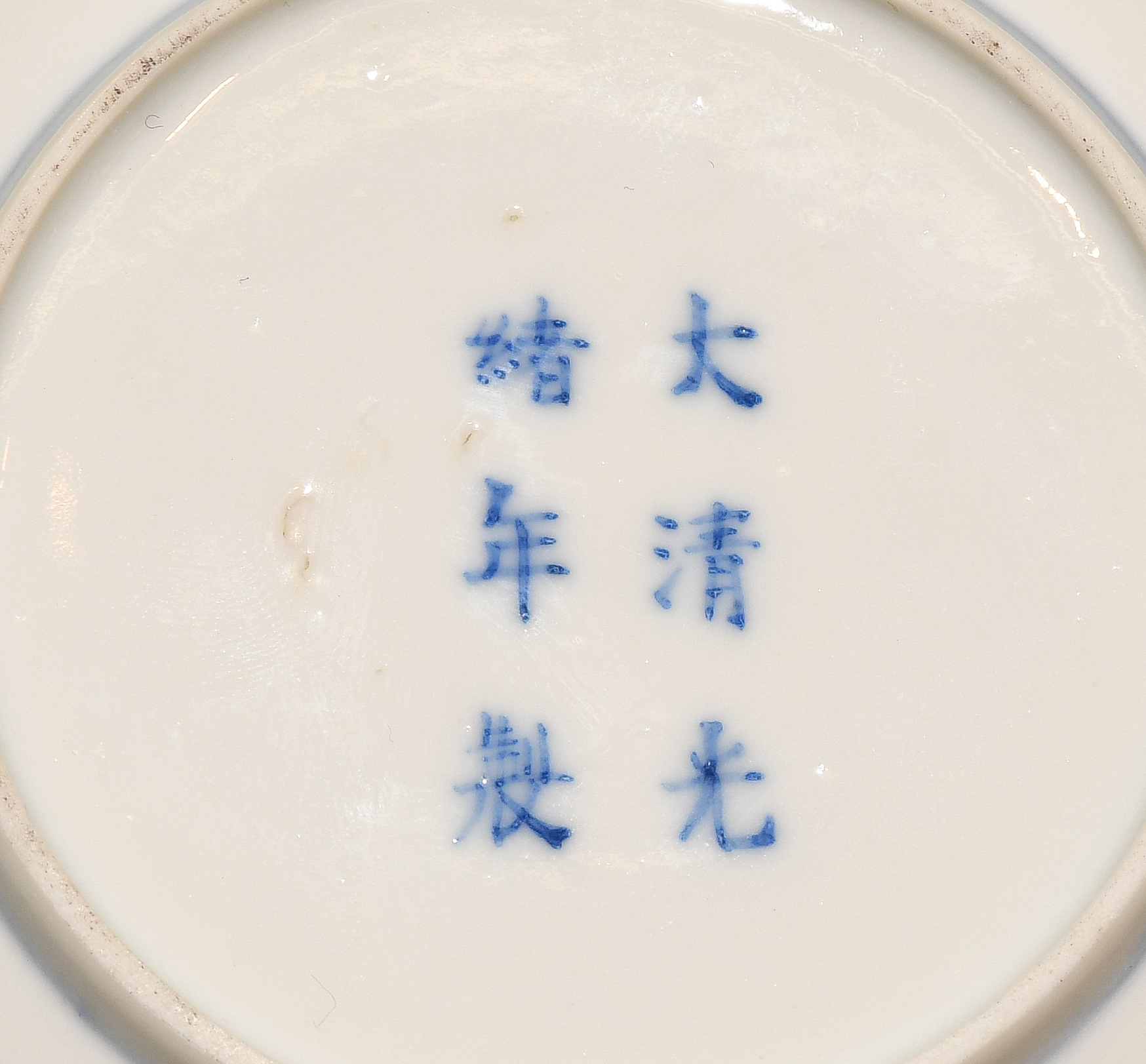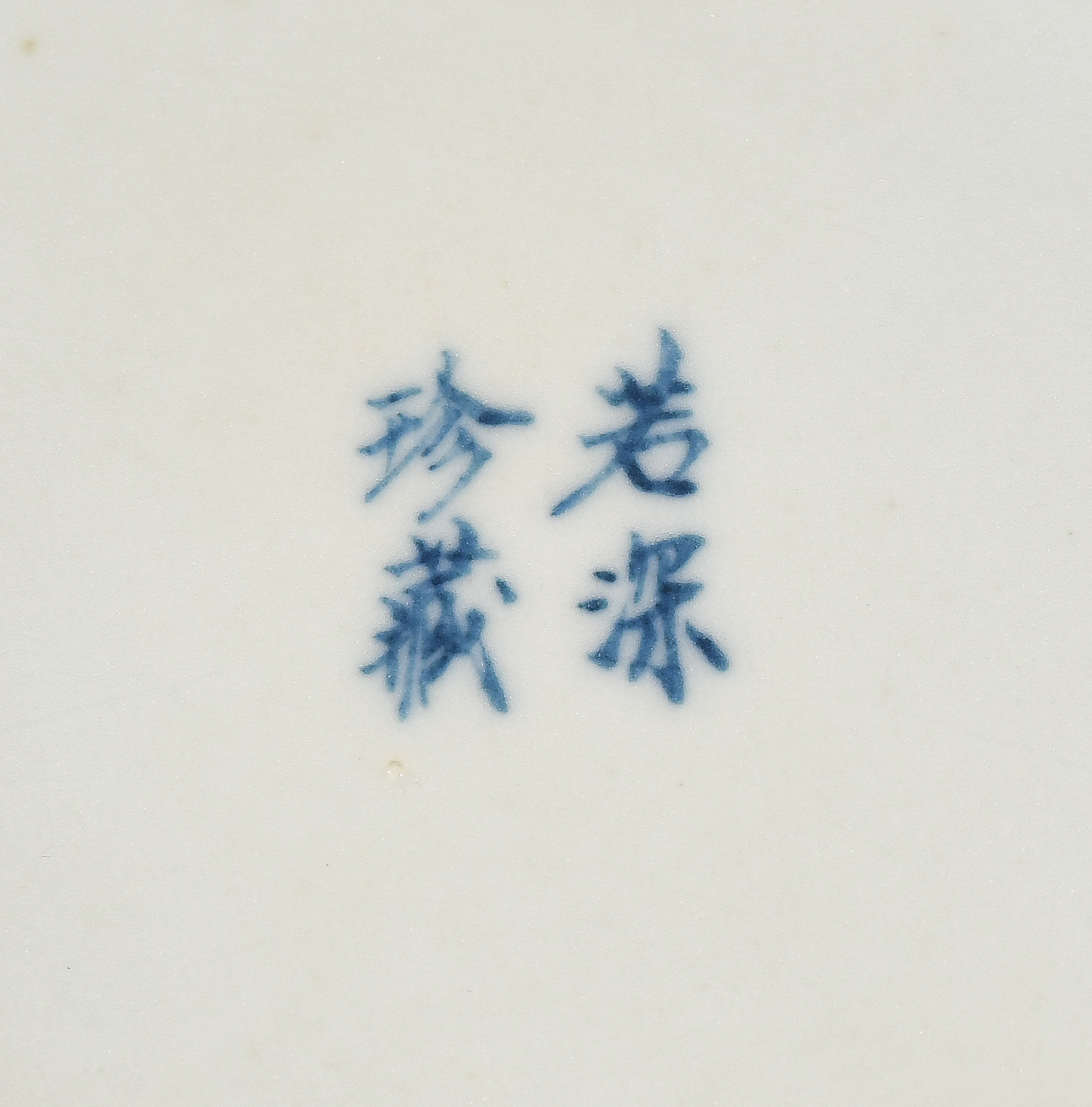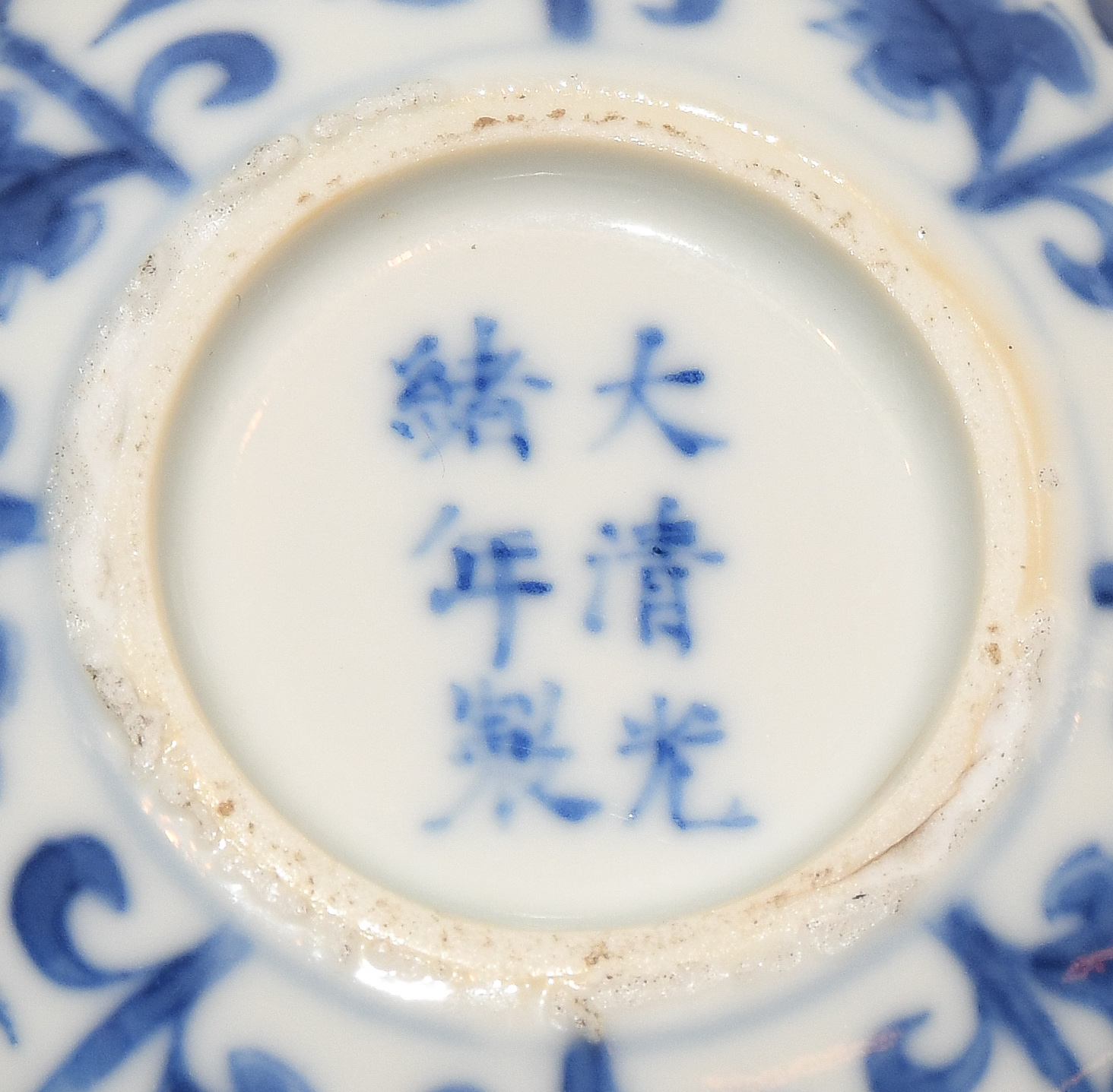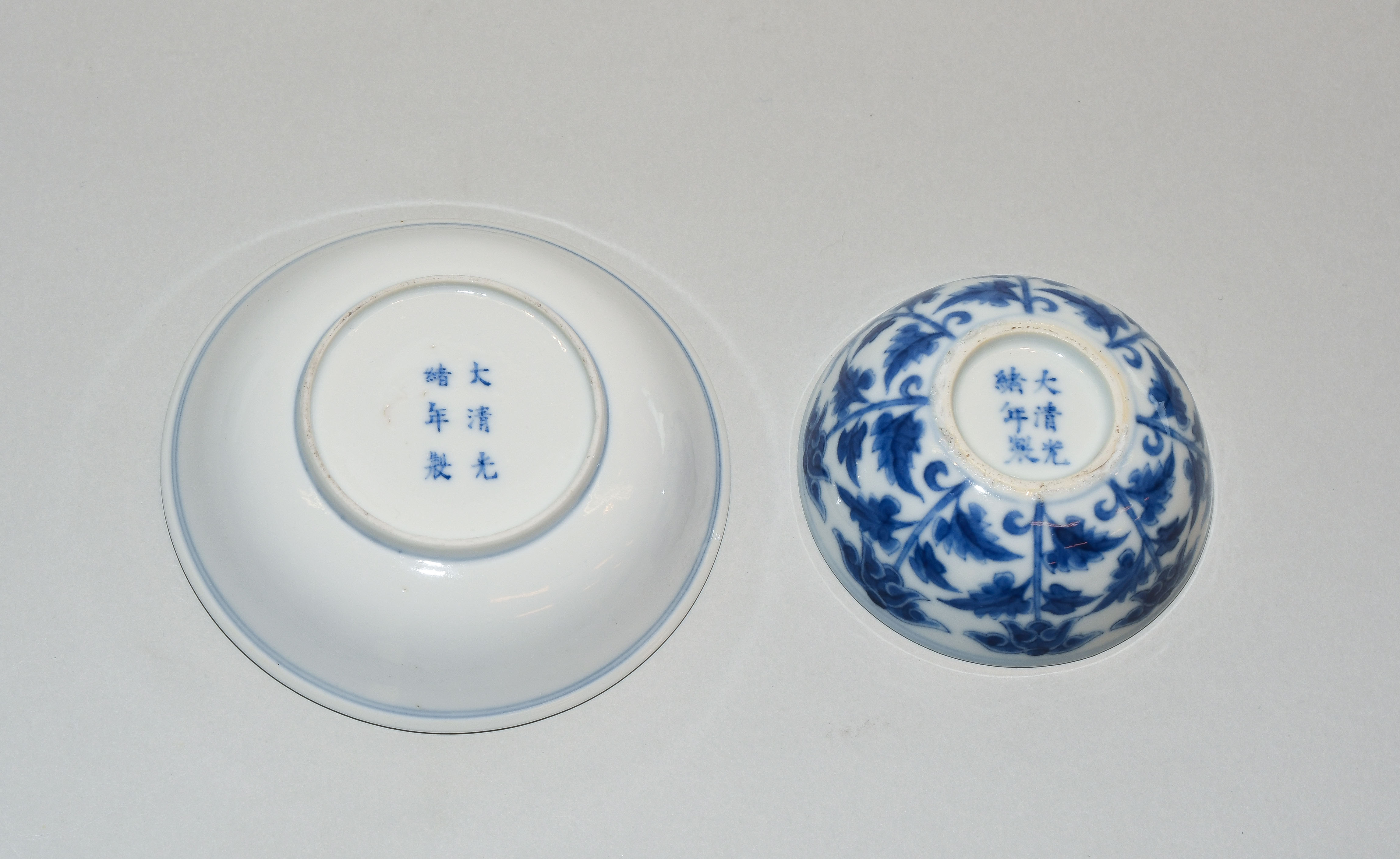 China, 20.Jh. Blau-Weiss-Porzellan. Quadratische Teekanne allseitig verziert mit dem Gedicht "Herbstabend in den Bergen" von Wang Wei. Henkel aus Metall. Boden mit Ren Shen Zhencang-Marke. H 13. / Zwei kleine Schalen mit Lotosdekor bzw. Drachenpaar. Beide mit Sechs-Zeichen Guangxu-Marke. D 8 und 10,5 cm. - Kleine Schale am Rand bestossen.