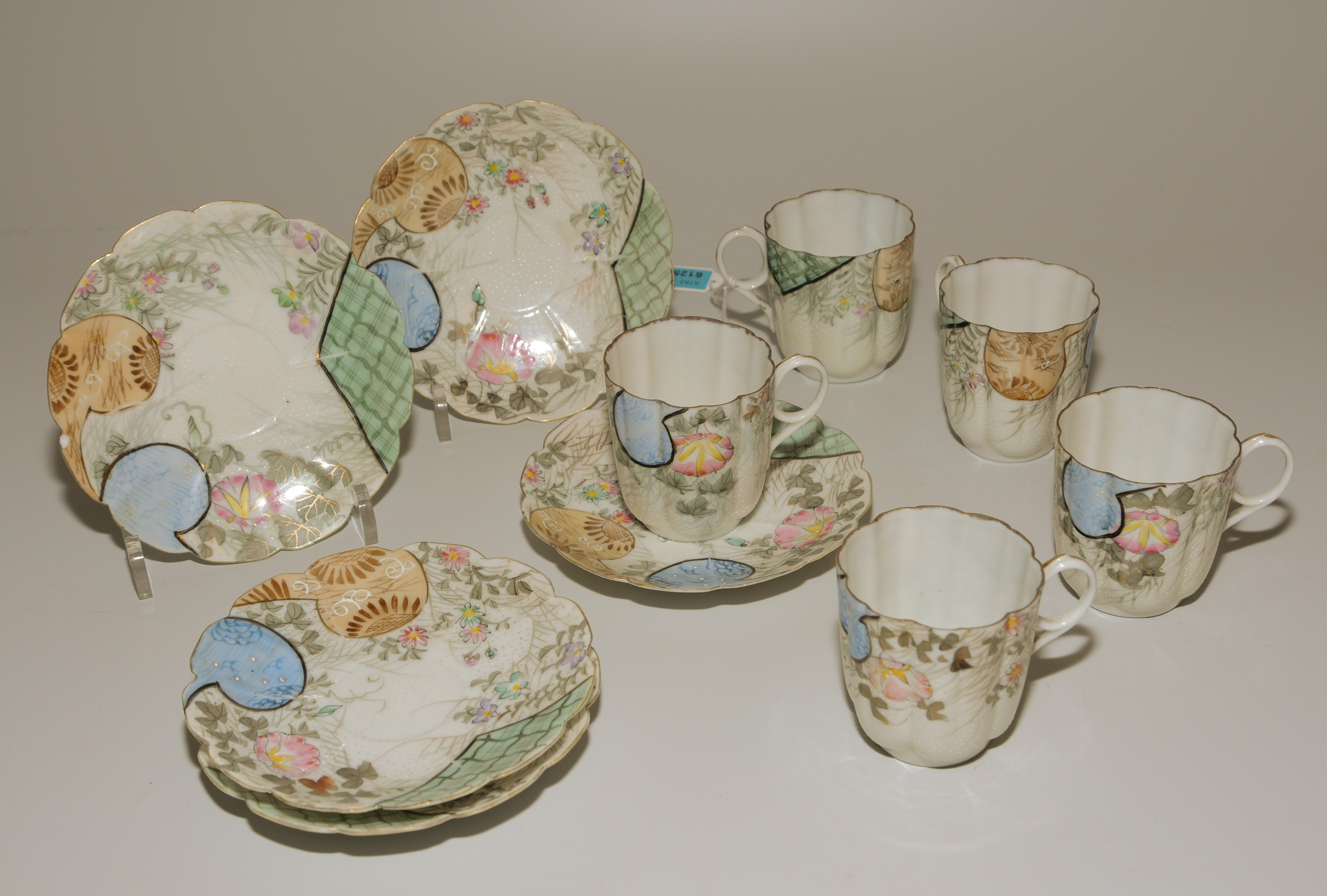 Japan, Anfang 20.Jh. Eierschalen-porzellan. Tassen und U'tassen in Form von Chrysanthemen, polychrom bemalt mit Blumen und Ornamenten. H 6 (Tasse), D 11,5 cm. - Haarriss, ein U'tasse bestossen.