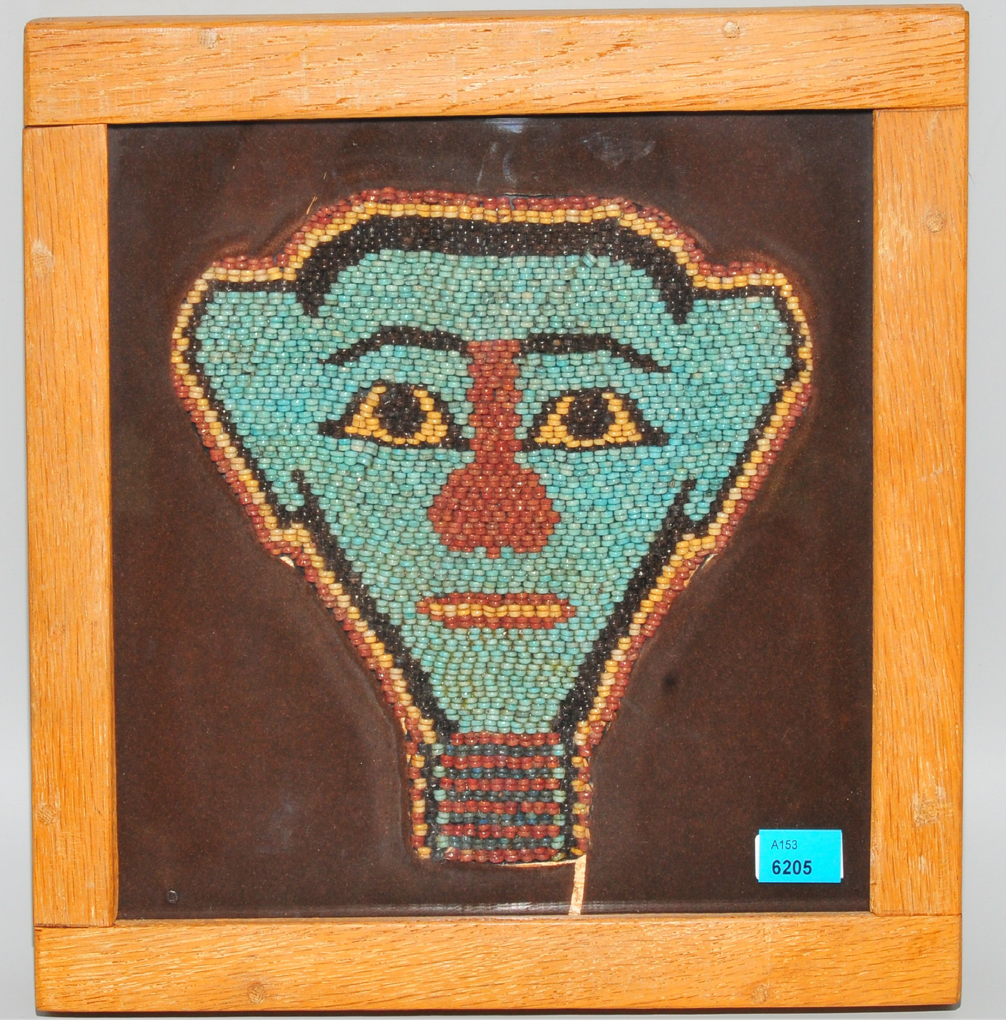 Spätzeit bis ptolemäische Zeit. 300–200 v.C. Mumien-Gesichtsmaske aus zahlreichen blauen, weissen, schwarzen und purpurfarbenen Fayenceperlen. H 18,5 cm. Hinter Glas gerahmt. 28x28 cm.