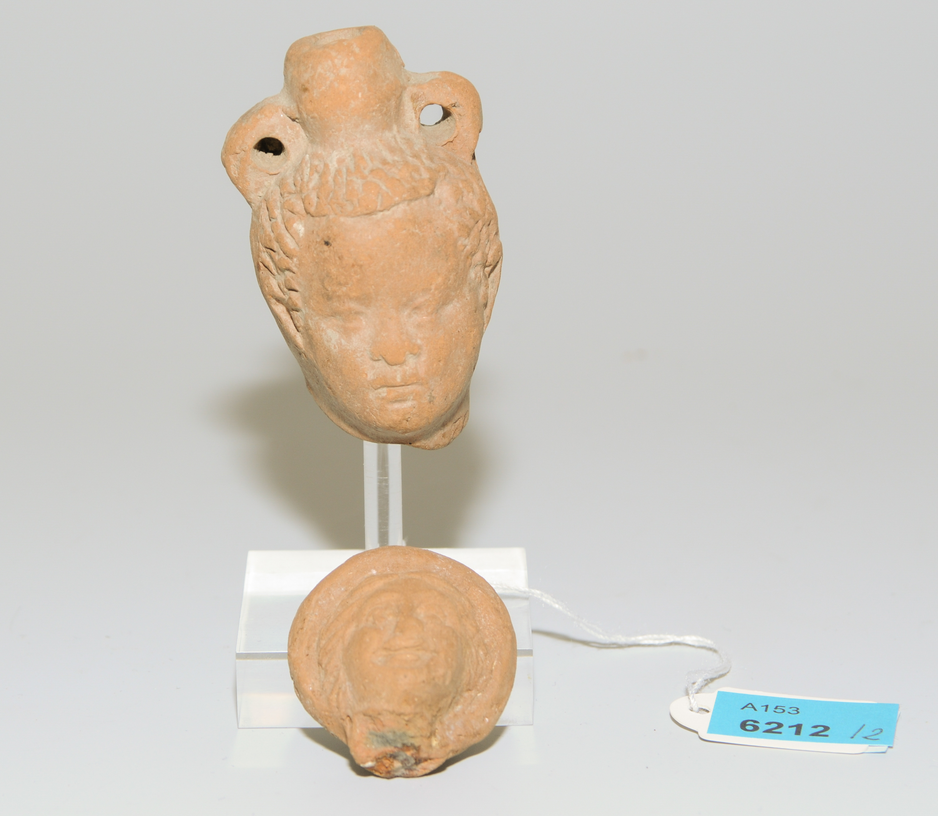 Aegypten, 1.Jh. v.–1.Jh. n.C. Alexandrinisch. Rötlicher Ton. Kopf einer Frau und Kopf eines Nubiers (Scheingefäss). H 3 und 5,8 cm. - Repariert.