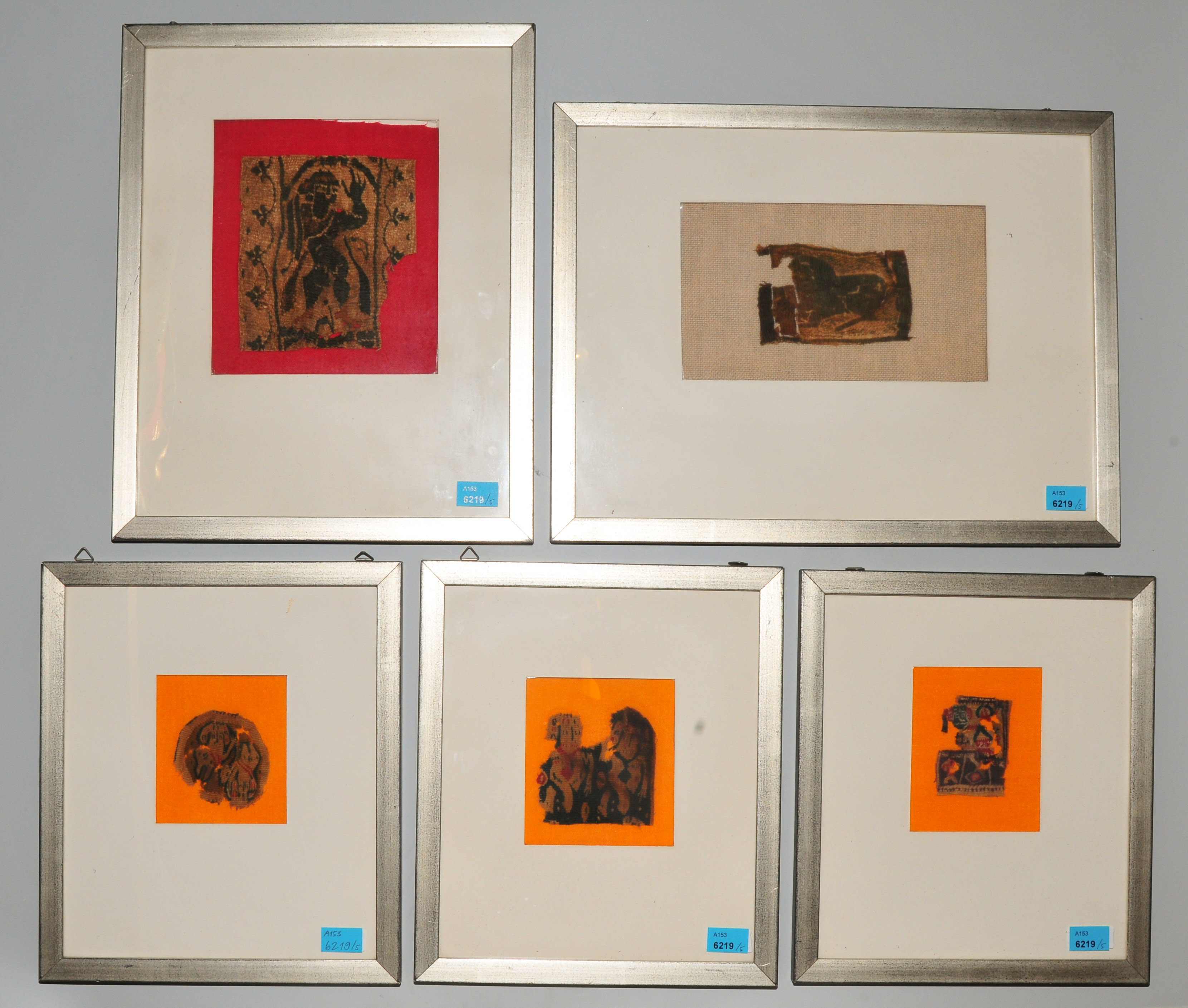 Koptisch, 4.–8.Jh. n.C. Fünf Ziereinsätze mit Figuren- oder Tierdekor. 6x4–12x11 cm. Hinter Glas gerahmt.
