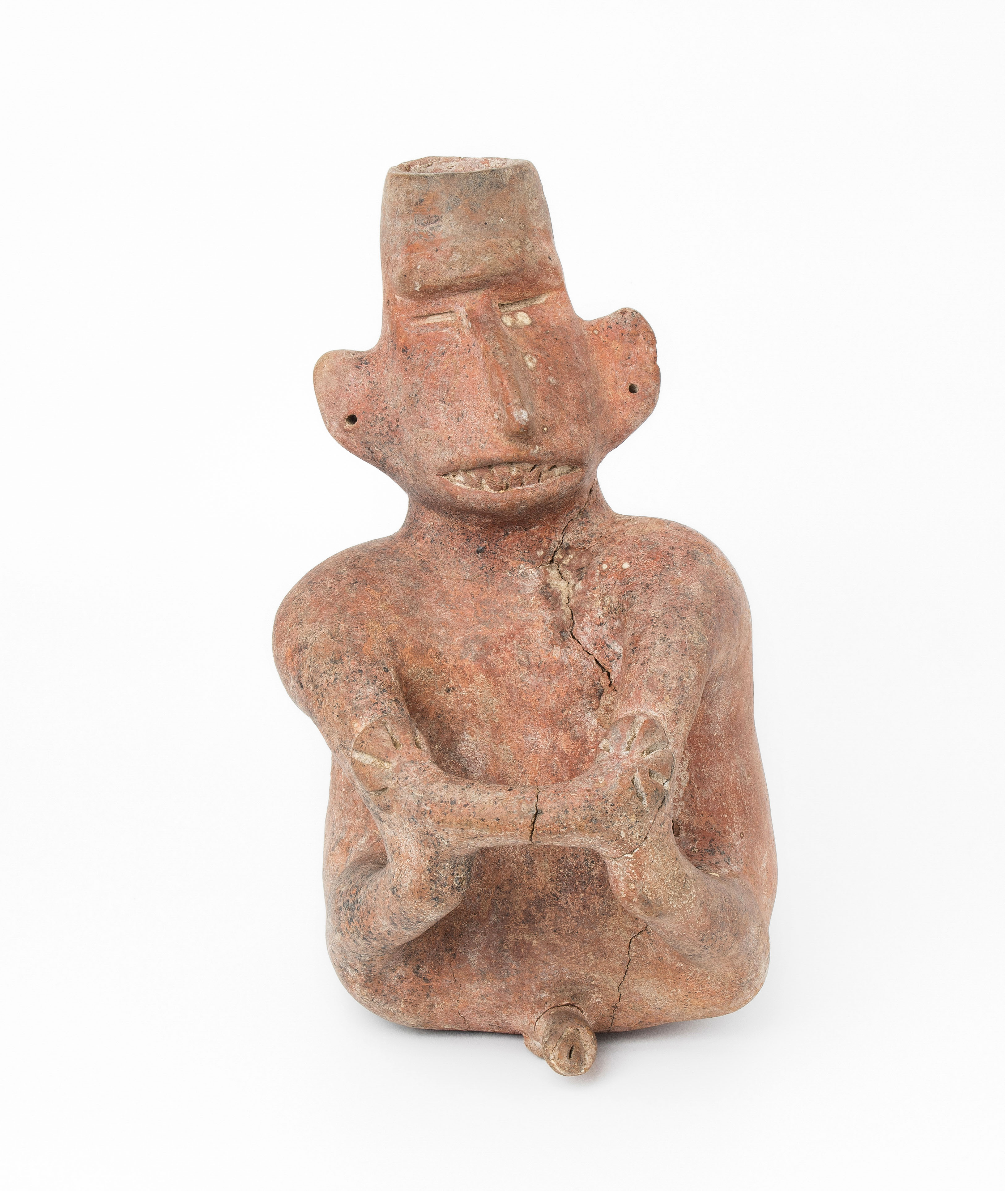 Vermutlich Huaxtekisch, 150 v.C.–150 n.C. Rötlicher Ton. Sitzende männliche Figur, die Arme und Beine in verschränkter Position. H 33 cm. - Risse, repariert.