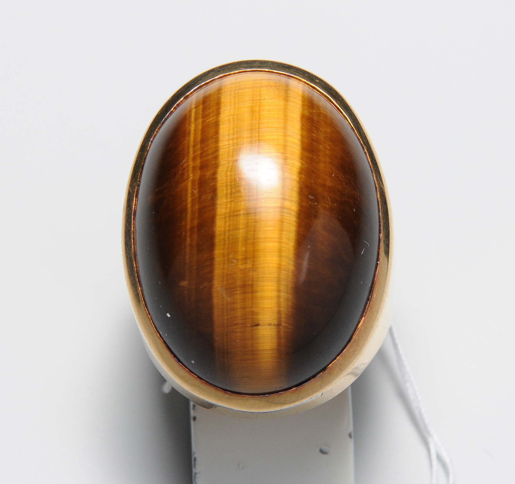 750 Gelbgold. 1 ovaler Tigerauge-Cabochon 24x18 mm. Gr. 53, 17,1 g.