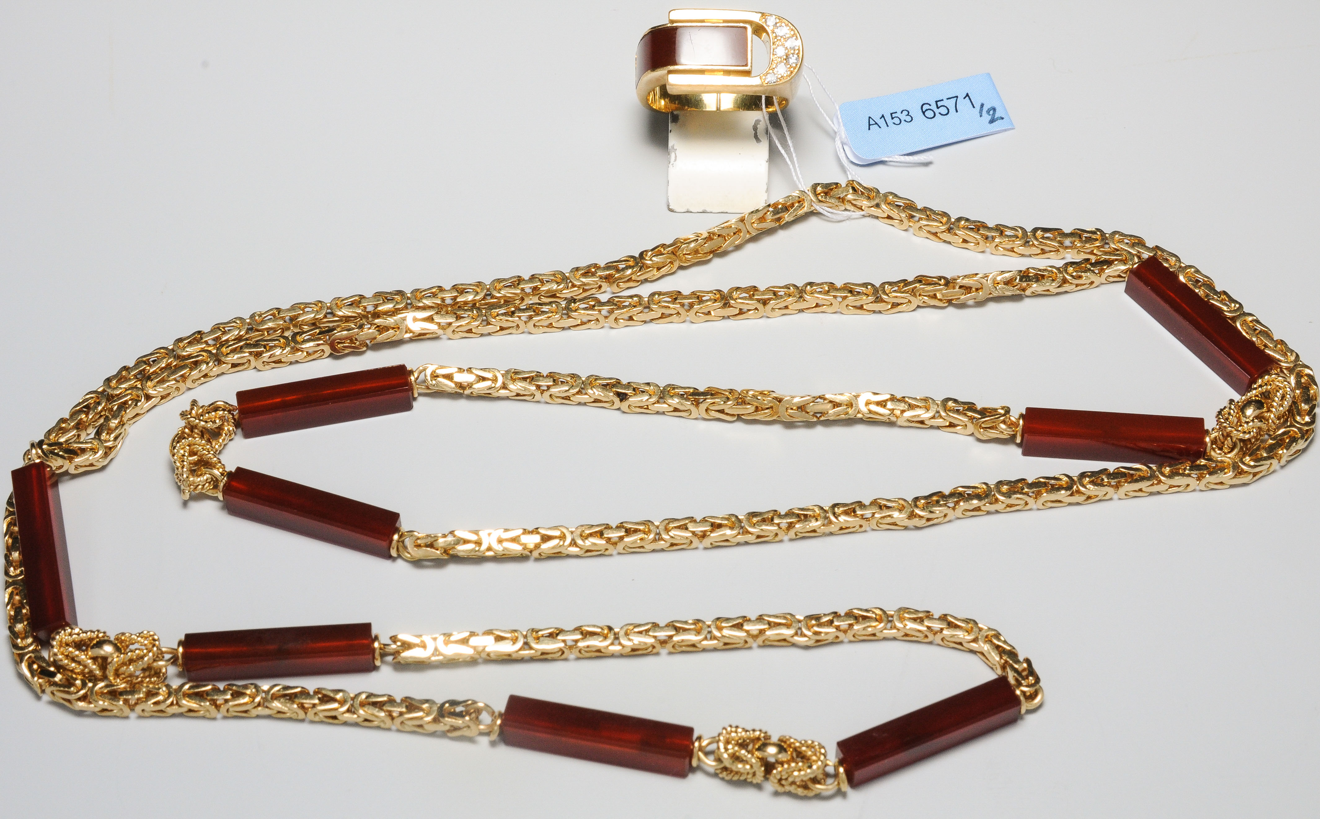 750 Gelbgold. 2-teilig. Ring mit Karneol und 7 Diam. Gr. 51, 9,2 g. Königskette mit Karneol-Klötzchen. Ohne Verschluss. L 86 cm, 53 g.