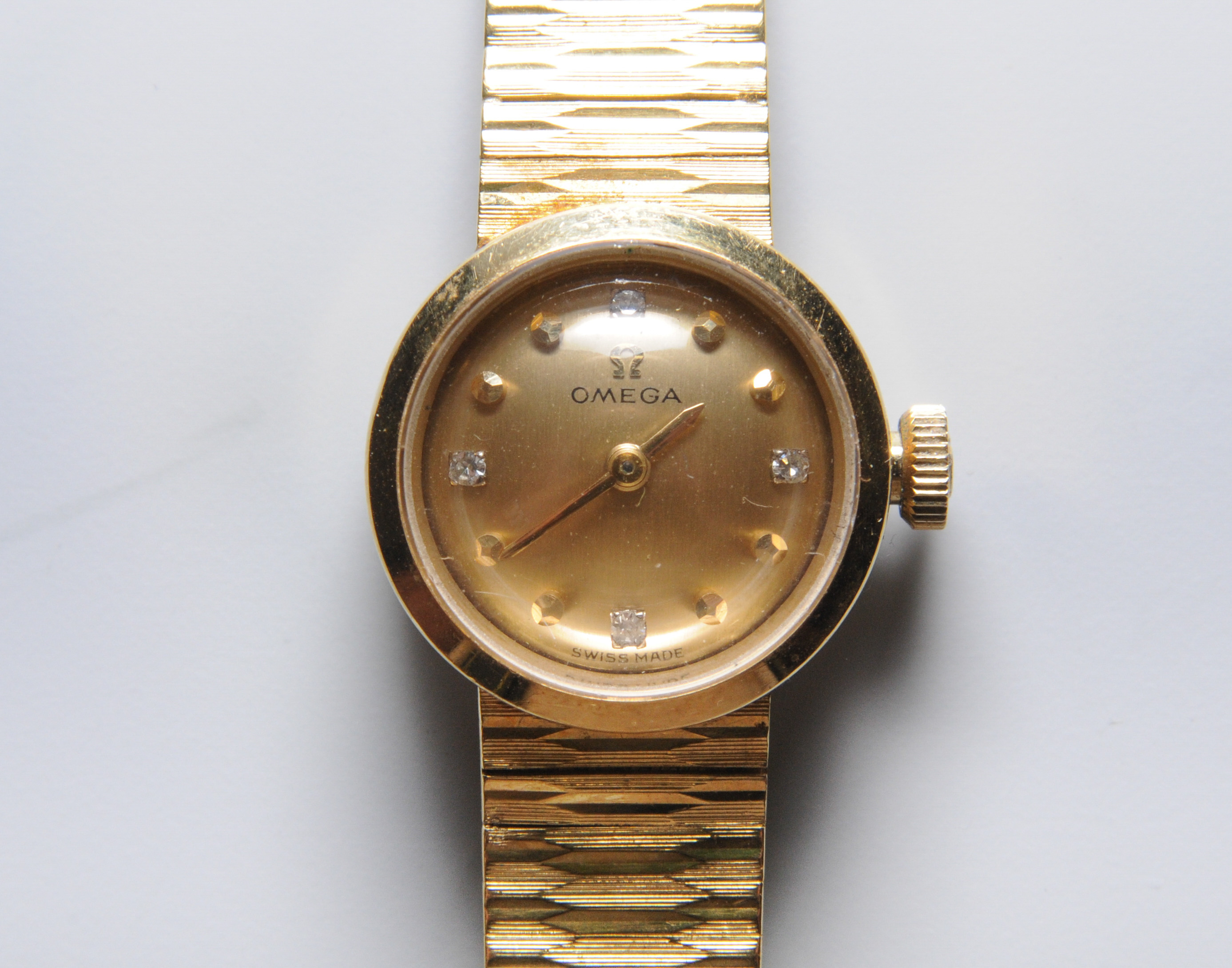 750 Gelbgold. Ref. 7119. Gehäuse Nr. 518723. Handaufzug Omega Cal. 483. Werk Nr. 19157181. Diamant-Zifferblatt. L 17 cm, 34,6 g. Funktionstüchtig.