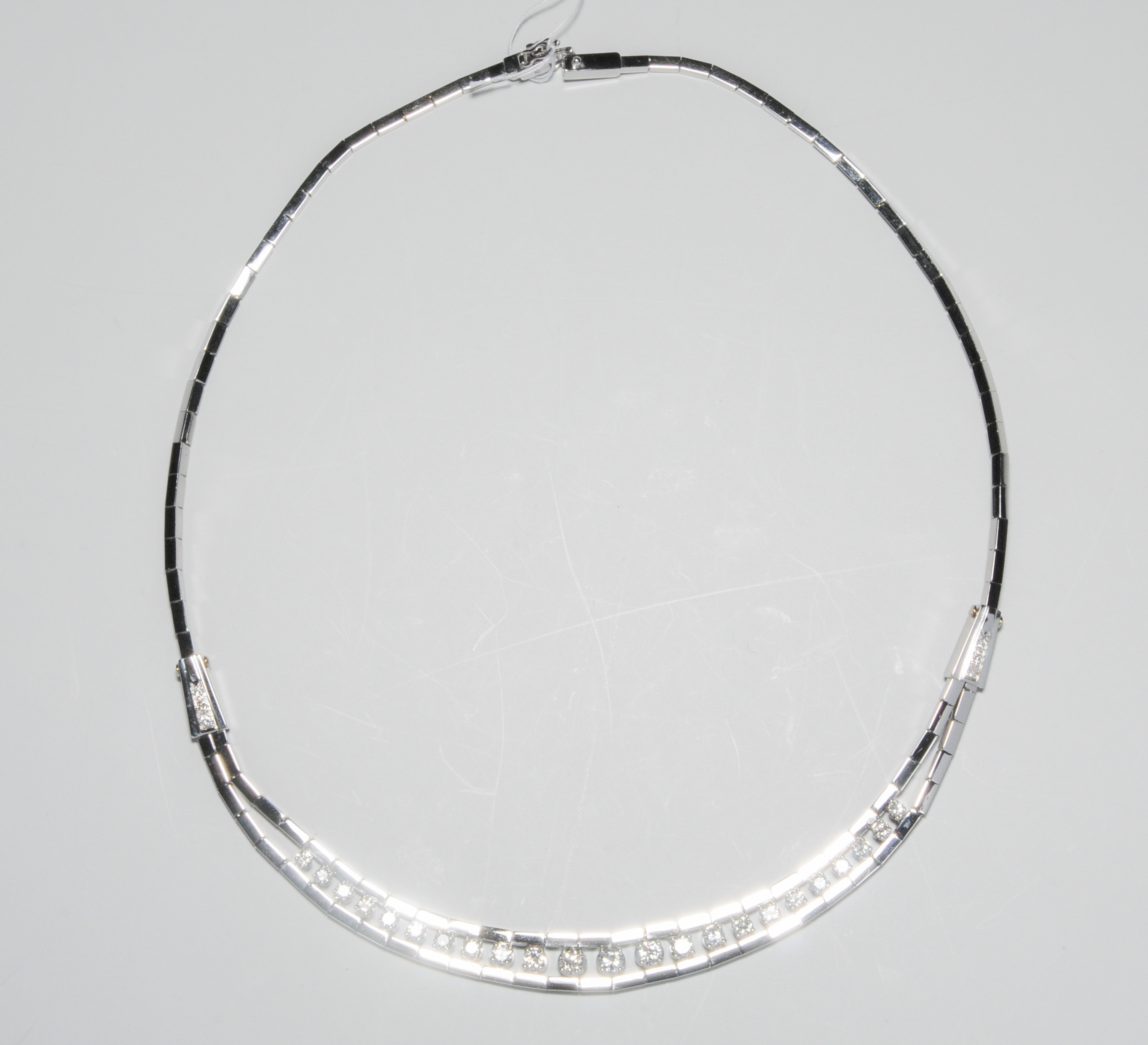 750 Weissgold. Klötzchenkette mit 29 feinen Brillanten ca. 3 ct. L 41 cm, 32,6 g.