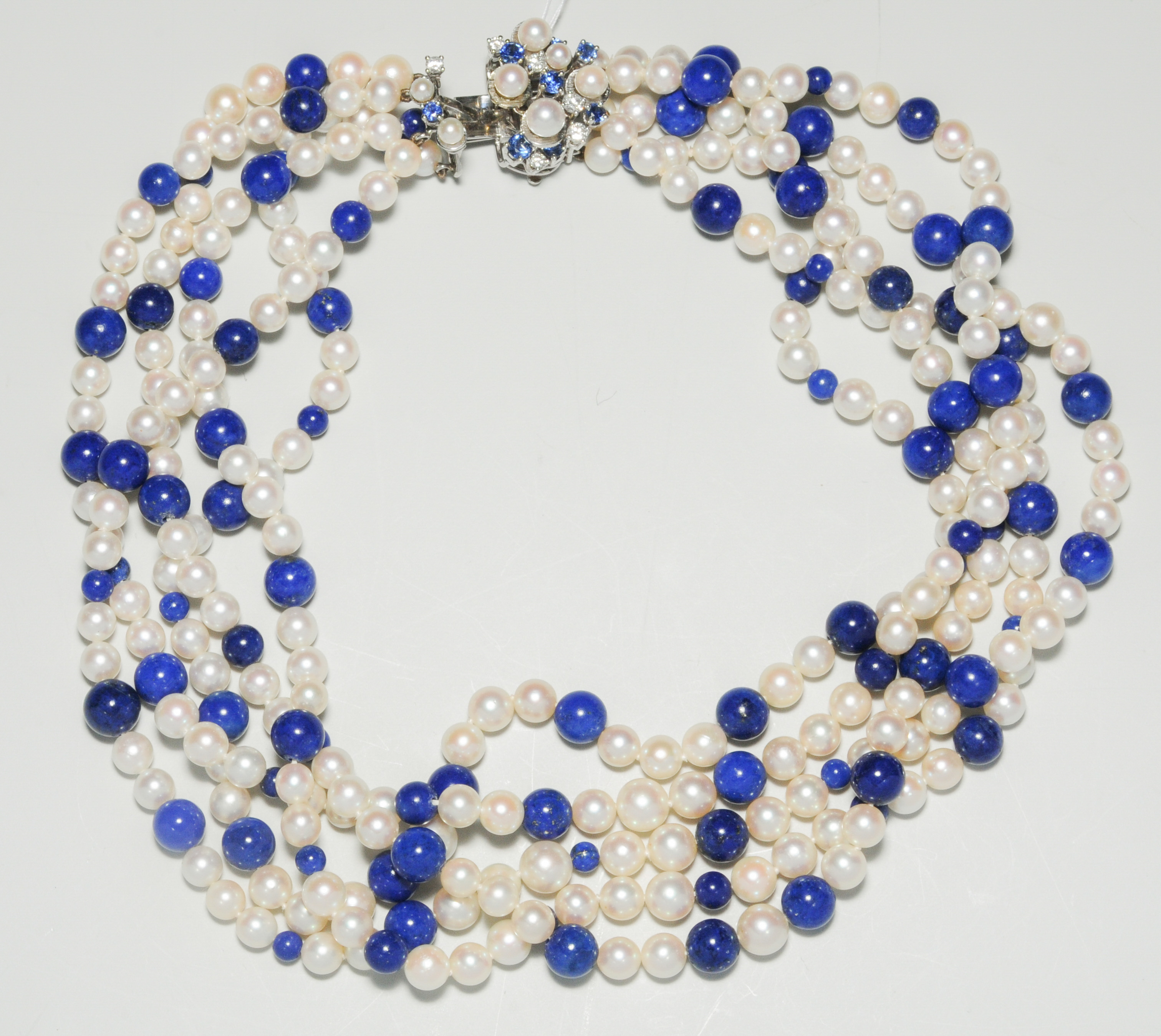 Binder, Zürich. 750 Weissgold. 5-reihig. Mit verschieden grossen Kulturperlen und Lapiskugeln. Verschluss mit 8 Saphiren und 6 Brillanten ca. 0.48 ct. L 38 cm.