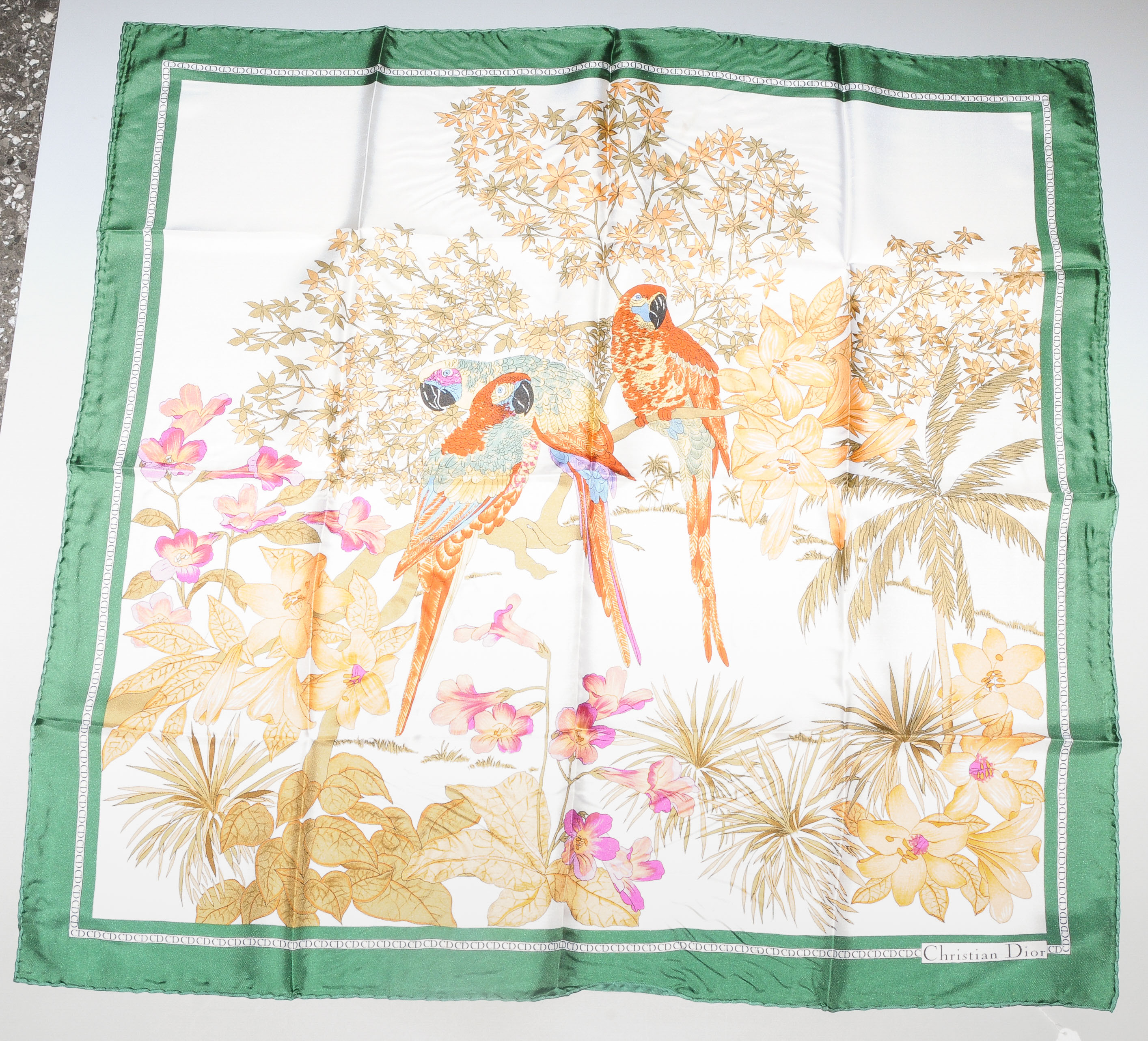 Ein Foulard von Christian Dior aus Seide. Weisser Grund und grüne Umrandung. Papageien-Motiv. Mit Original-Verpackung. 87x87 cm. Fleckig. Ein Foulard von Céline aus Seide. Weisser Grund und graue Umrandung. Gerten- und Steigbügelmotiv. 85x85 cm. Guter Zustand.