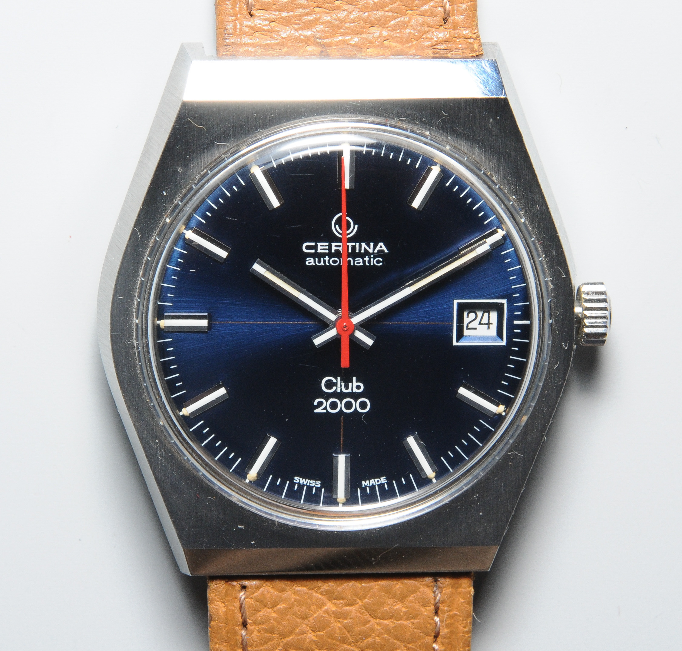 Runde, automatische Armbanduhr 1968 in tonneauförmigem Stahlgehäuse. Boden verschraubt, Gehäusenummer 623 3542 41, D 36 mm. Dunkelblaues Zifferblatt mit Stundenindizes, Stab-Zeiger, zentraler Sekundenzeiger, Datumsfenster. Hellbraunes Lederarmband mit Dornschliesse. Gebrauchsspuren.