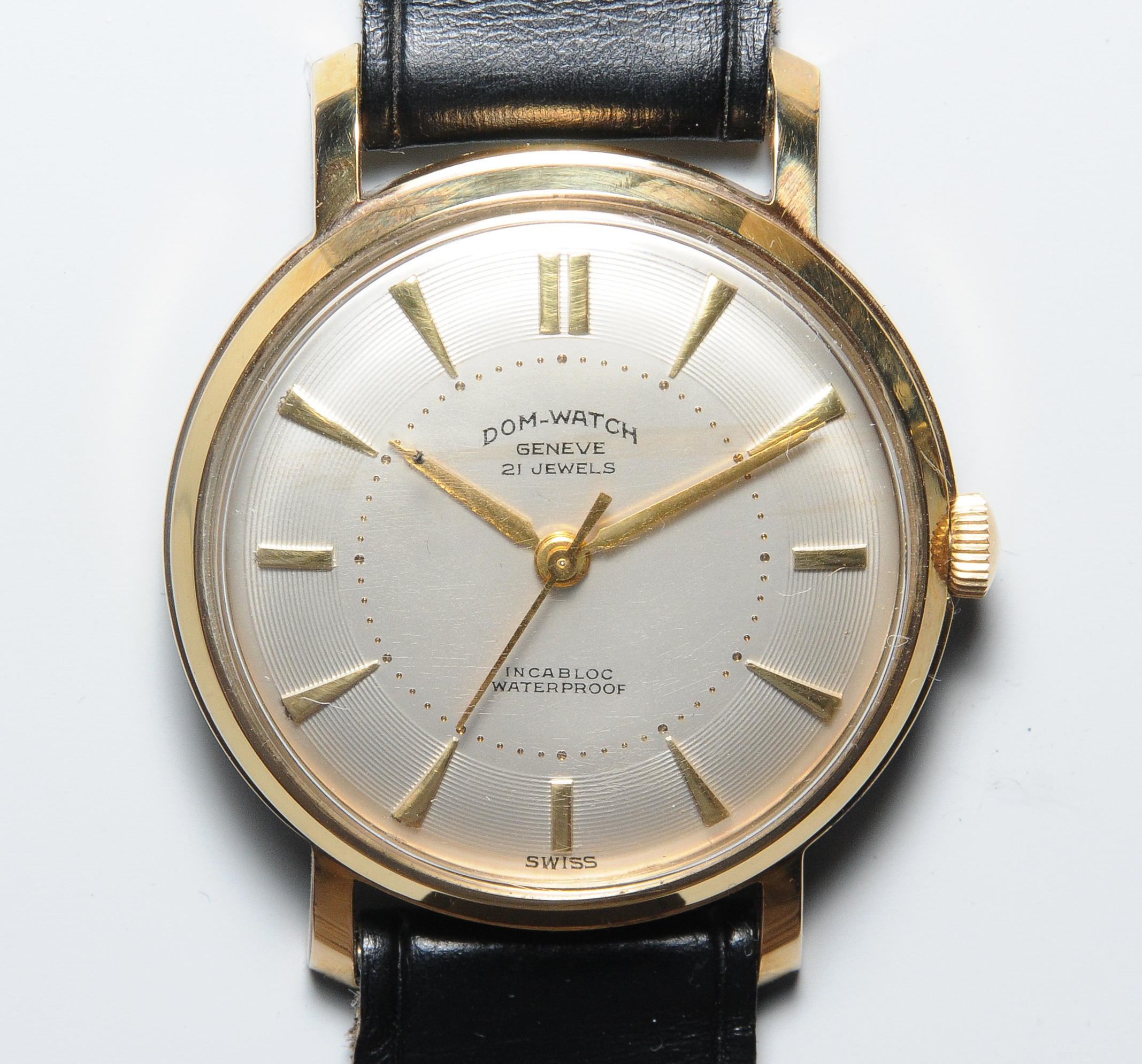 Runde, mechanische Armbanduhr 1958 mit Handaufzug in vergoldetem Gehäuse. Boden verschraubt, Gehäusenummer 1121, D 34 mm. Cremefarbenes Zifferblatt mit Stundenindizes, Stab-Zeiger, zentraler Sekundenzeiger. Schwarzes Lederarmband mit Dornschliesse. Gebrauchsspuren.