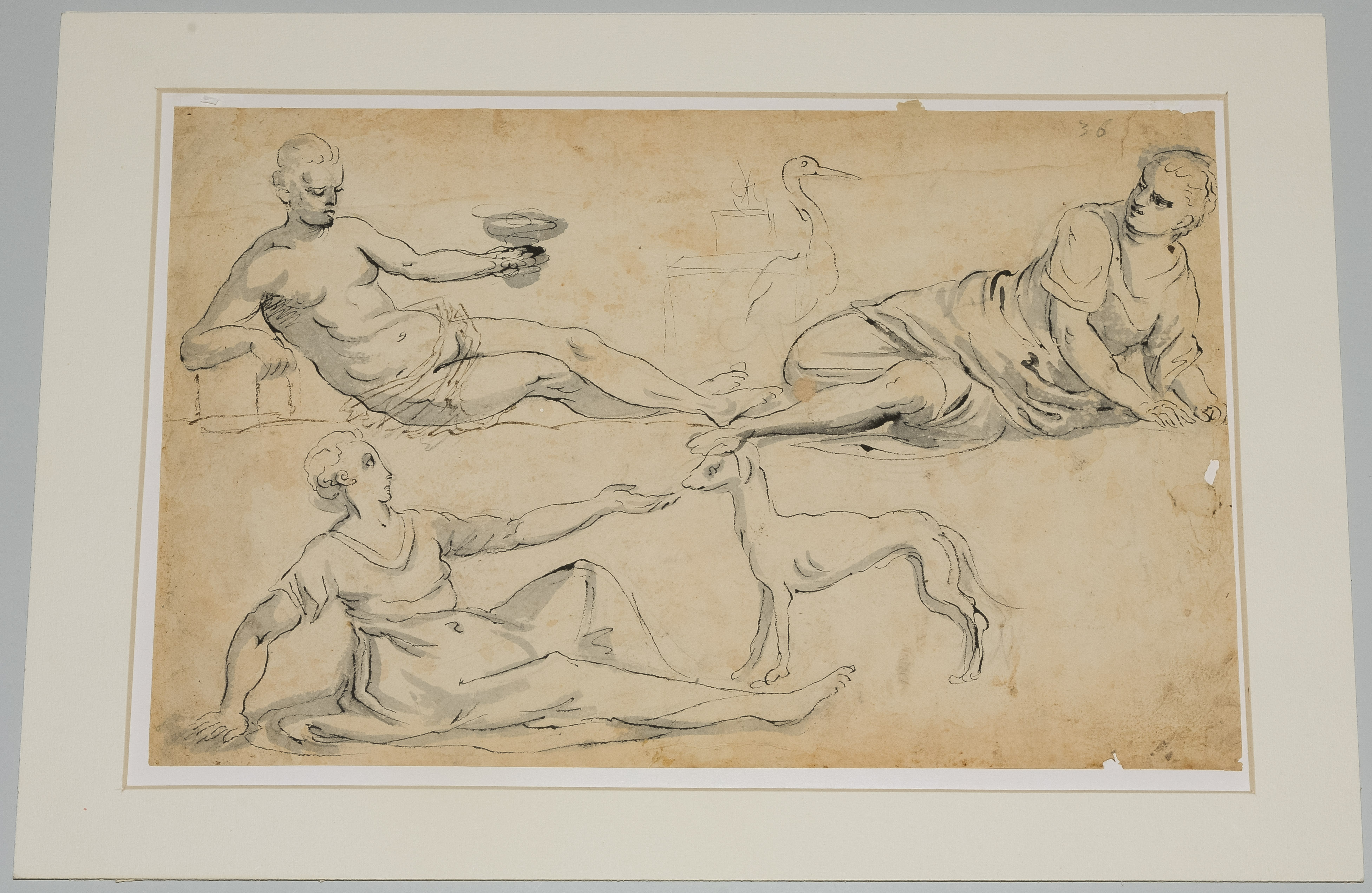Studienblatt mit drei liegenden Gestalten. Lavierte Federzeichnung. 26x40 cm.