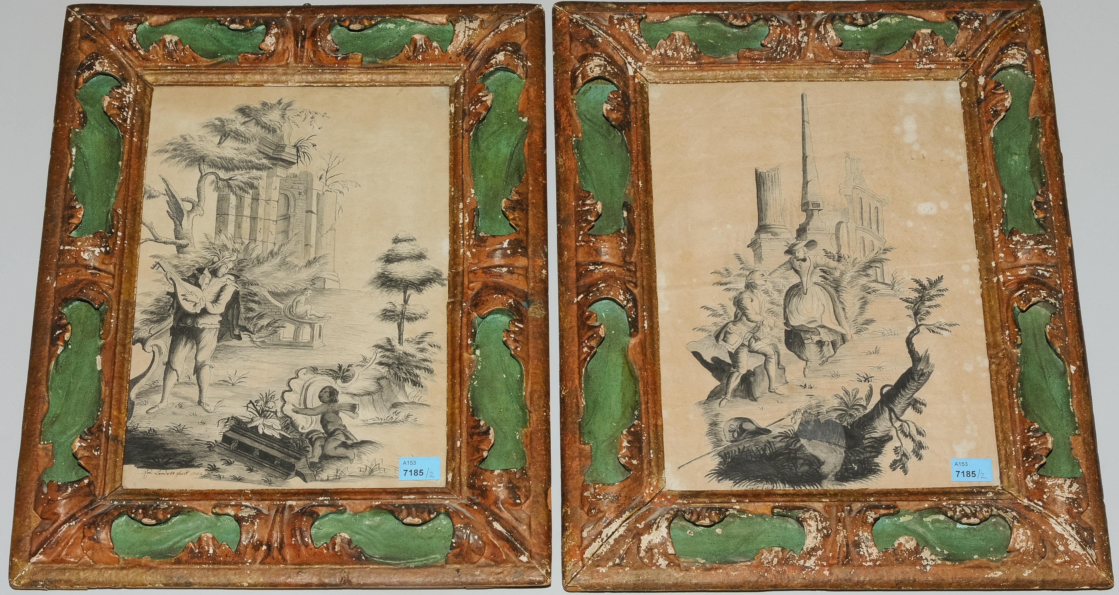 Gegenstücke. Galante Szenen. 2 Aquarelle in Grisaille, 1762. Beide signiert "Rodolphe Landolt fecit 1762. Je ca. 29x20 cm. Gerahmt.