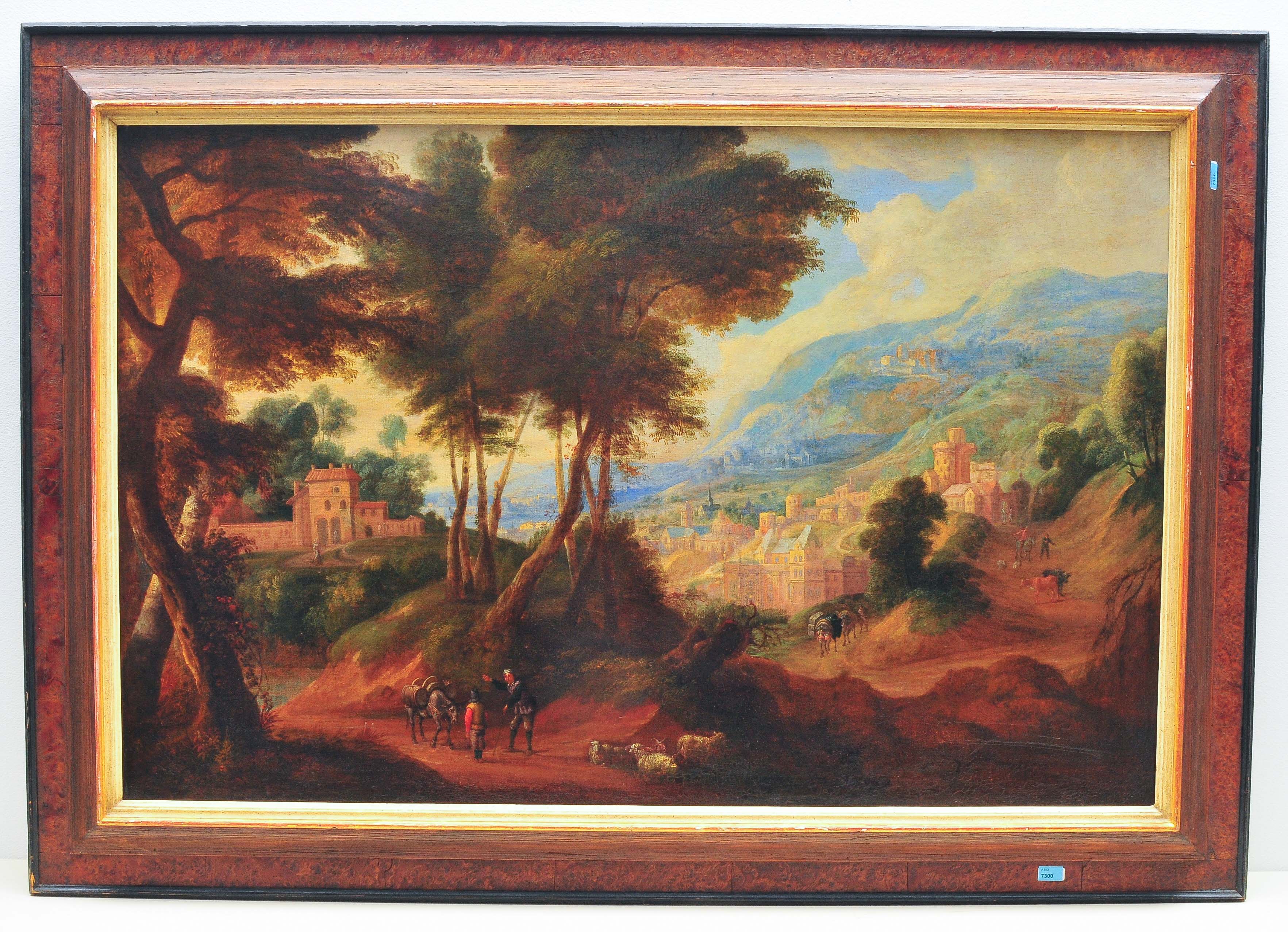 Weite Landschaft mit Städtchen und Staffagen. Öl auf Leinwand. 70x107,5 cm.