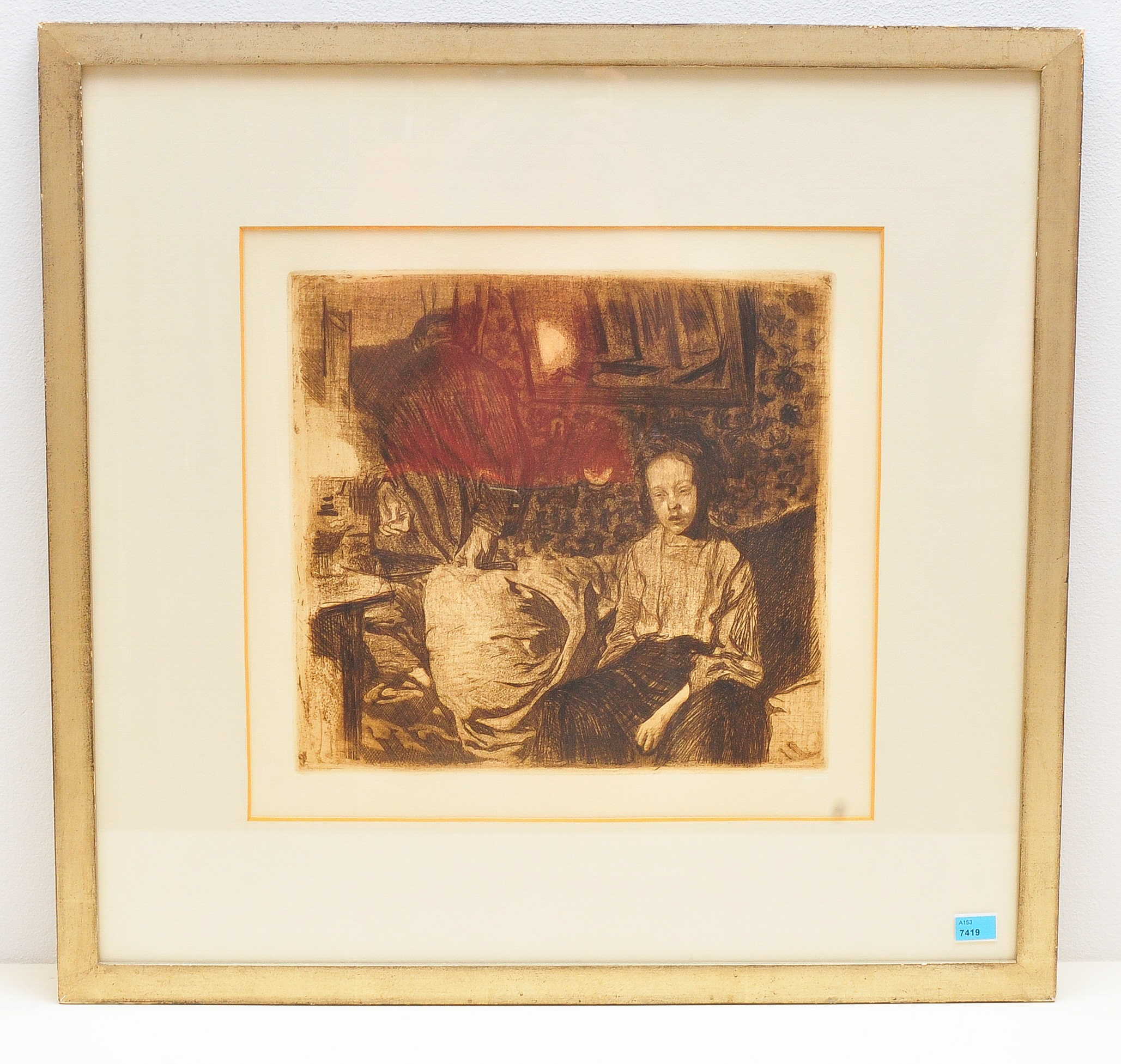 "Junges Paar". 1904 (?), Abzug zwischen 1963/65 und 1972. Strichätzung, Schmirgel, Reservage und Vernis mou. Unten links bezeichnet: "Orig. Rad. von Käte Kollwitz". Unten rechts bezeicnet: "Druck v. O. Felsing, Berlin, Chlttbg." und mit Prägestempel: "Becke Muenchen". Lichtmass 34,5x36,5 cm. Gerahmt.