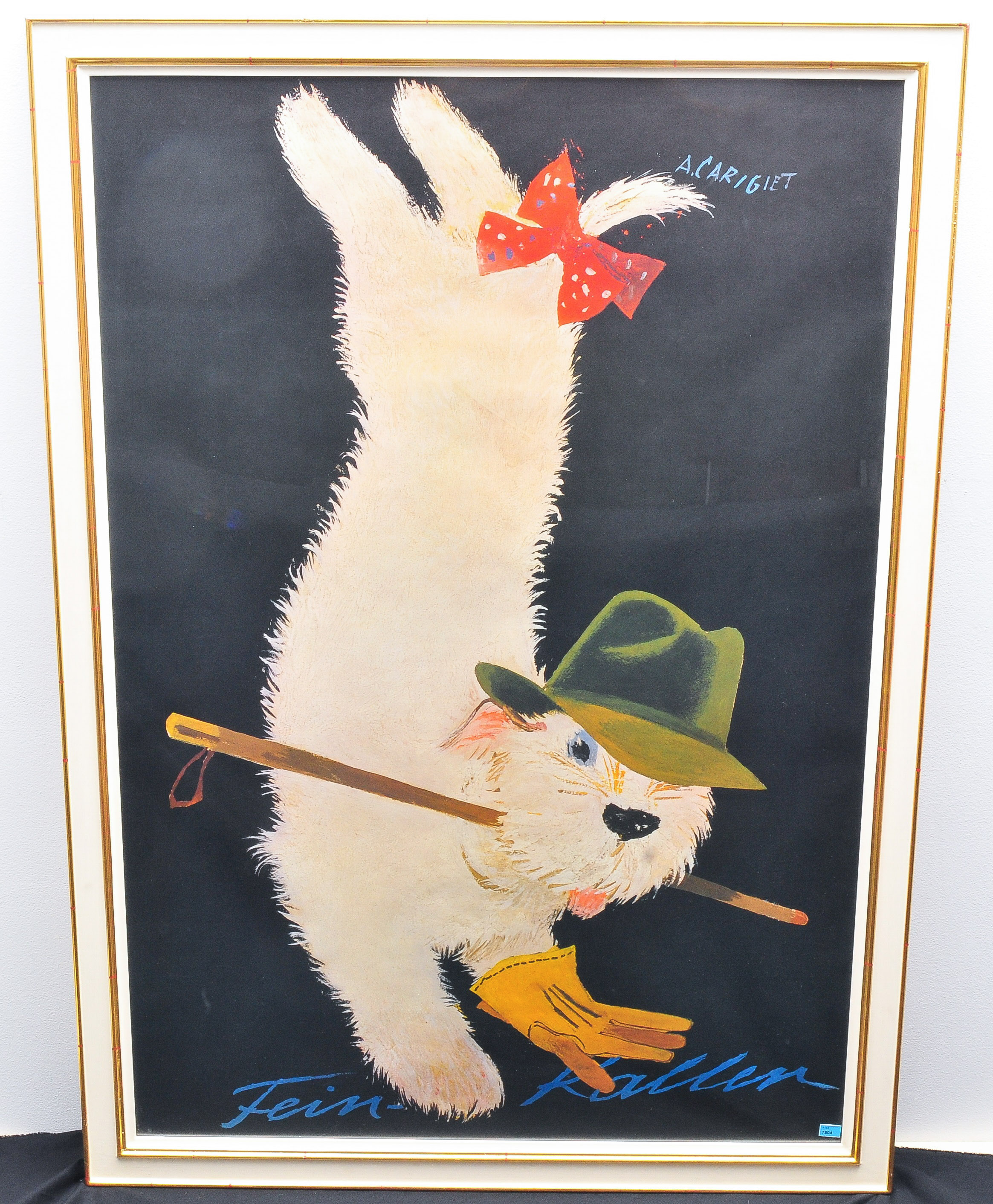 Fein-Kaller. Hund mit Stock. Farboffsetplakat. Oben rechts im Druck signiert. Lichtmass 126x84 cm. Gerahmt.