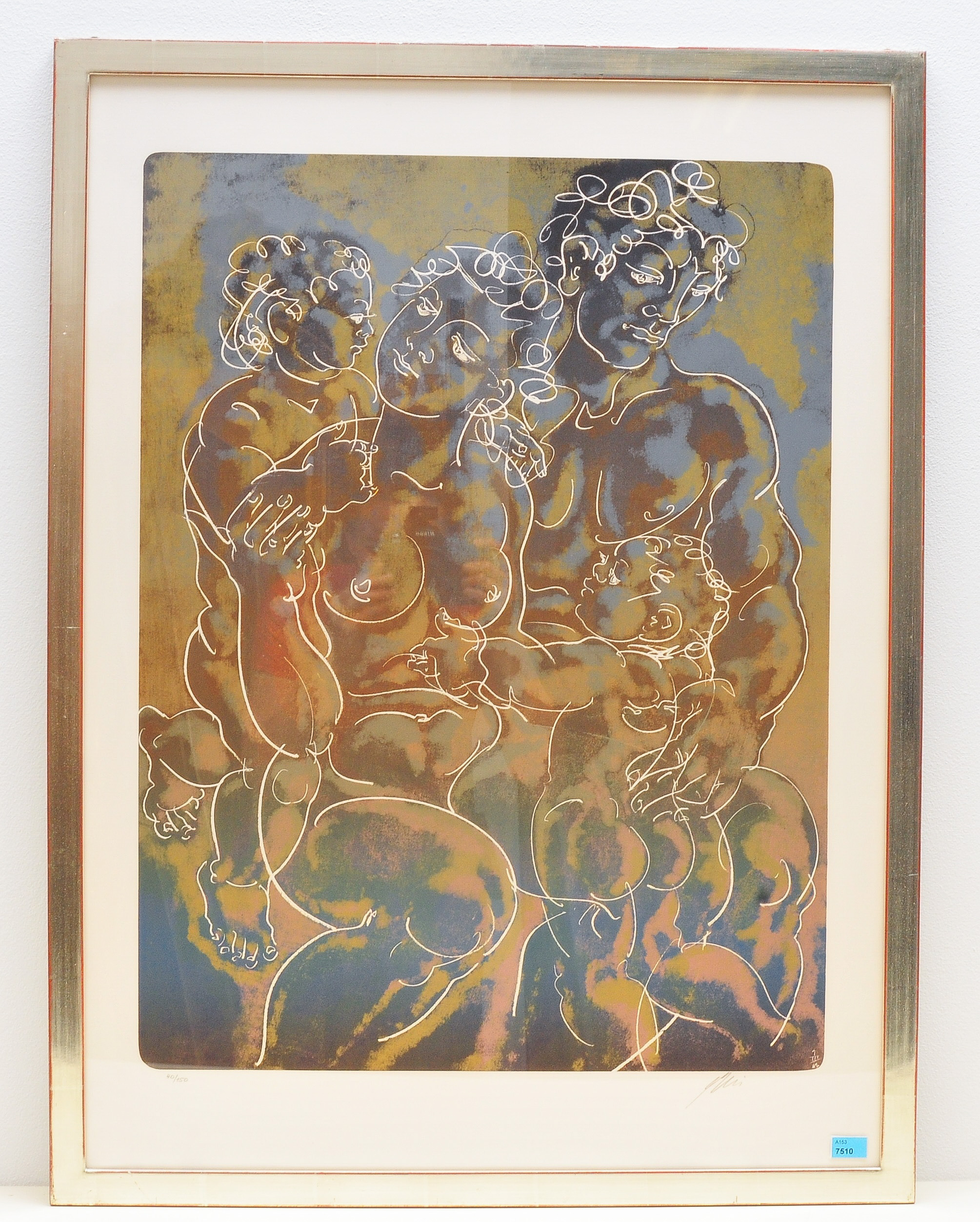 "Umsorgen". 1986. Farblithographie. 40/150. Unten rechts signiert. Unten links im Druck datiert. Lichtmass 75x55 cm. Gerahmt.