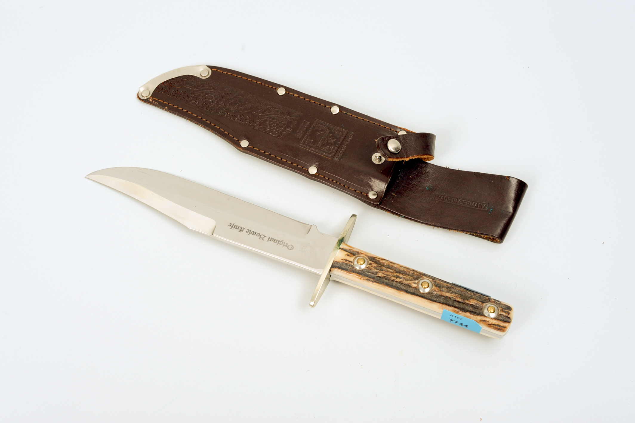 Linder, Solingen, um 1980. Stahlklinge, signiert Original Linder Messer, Rehwappen. Hirschhorngriff, zweifach vernietet. Original geprägte Lederscheide. L ca. 29 cm.