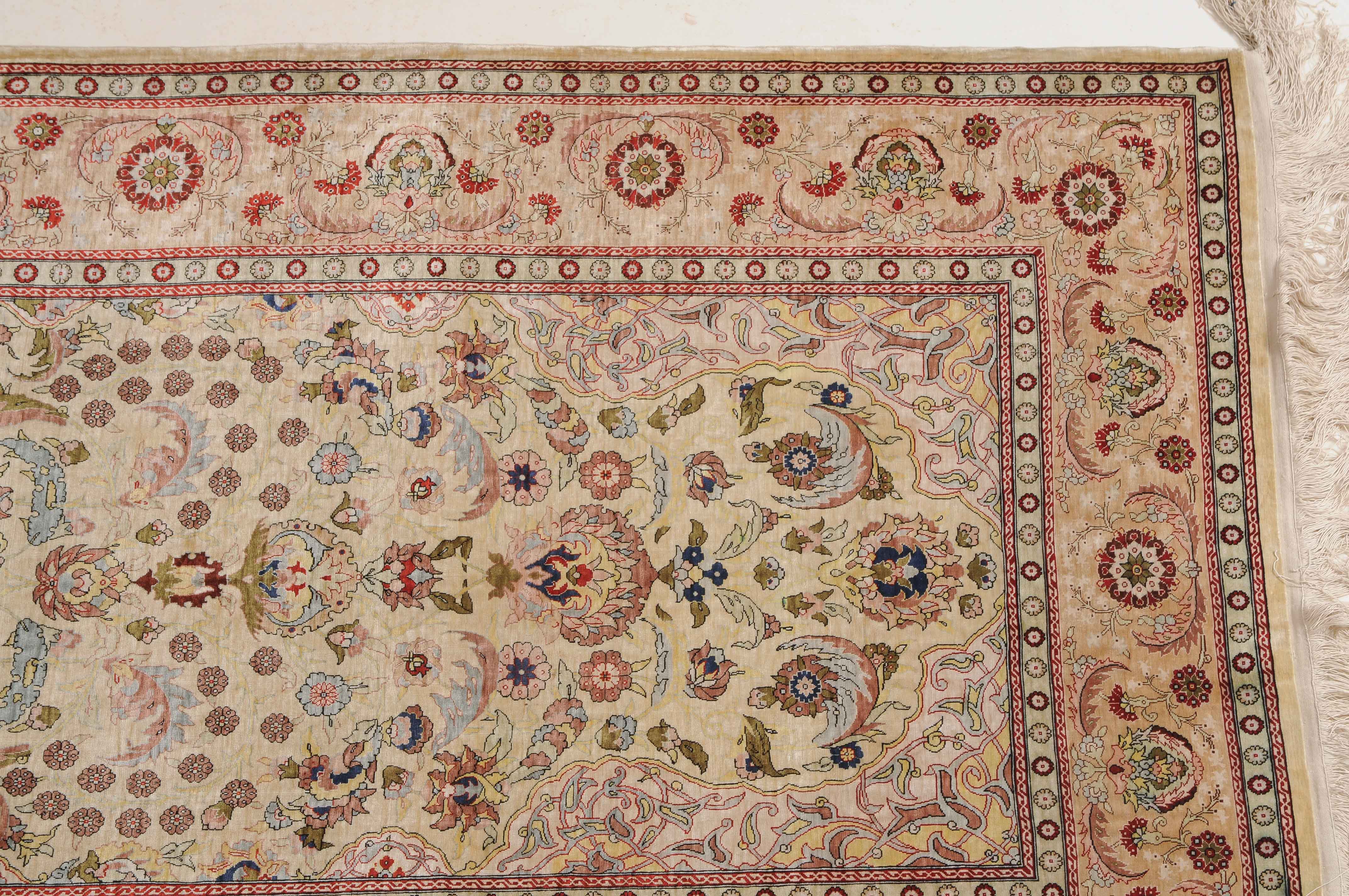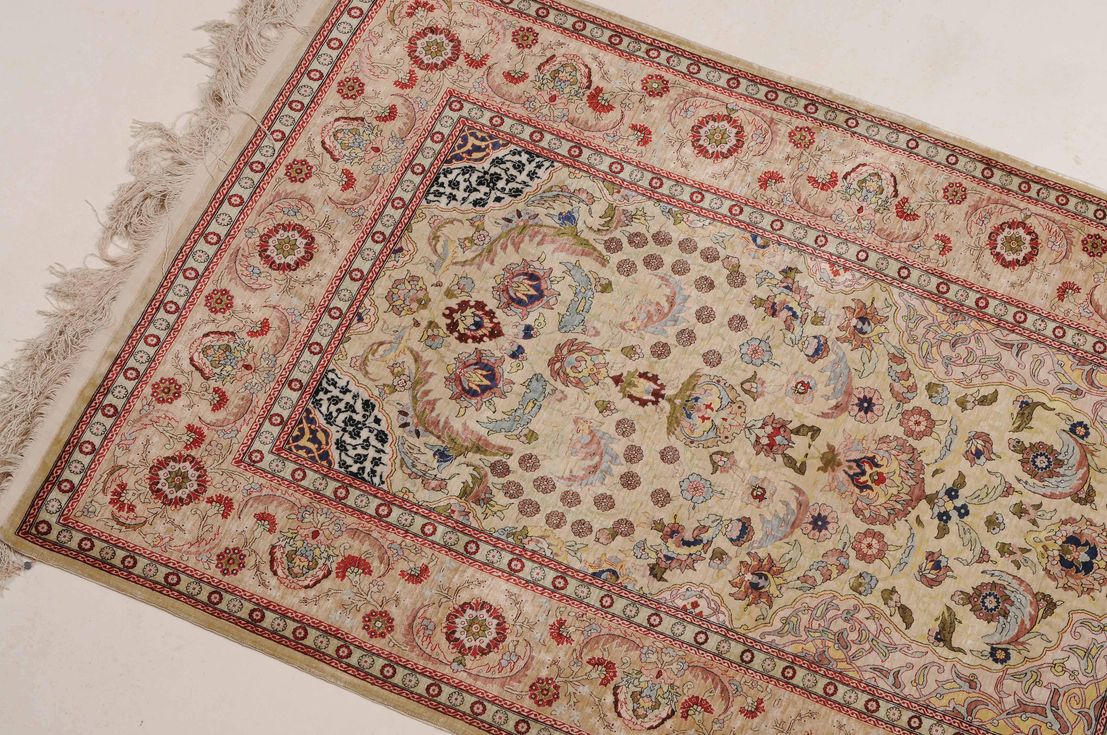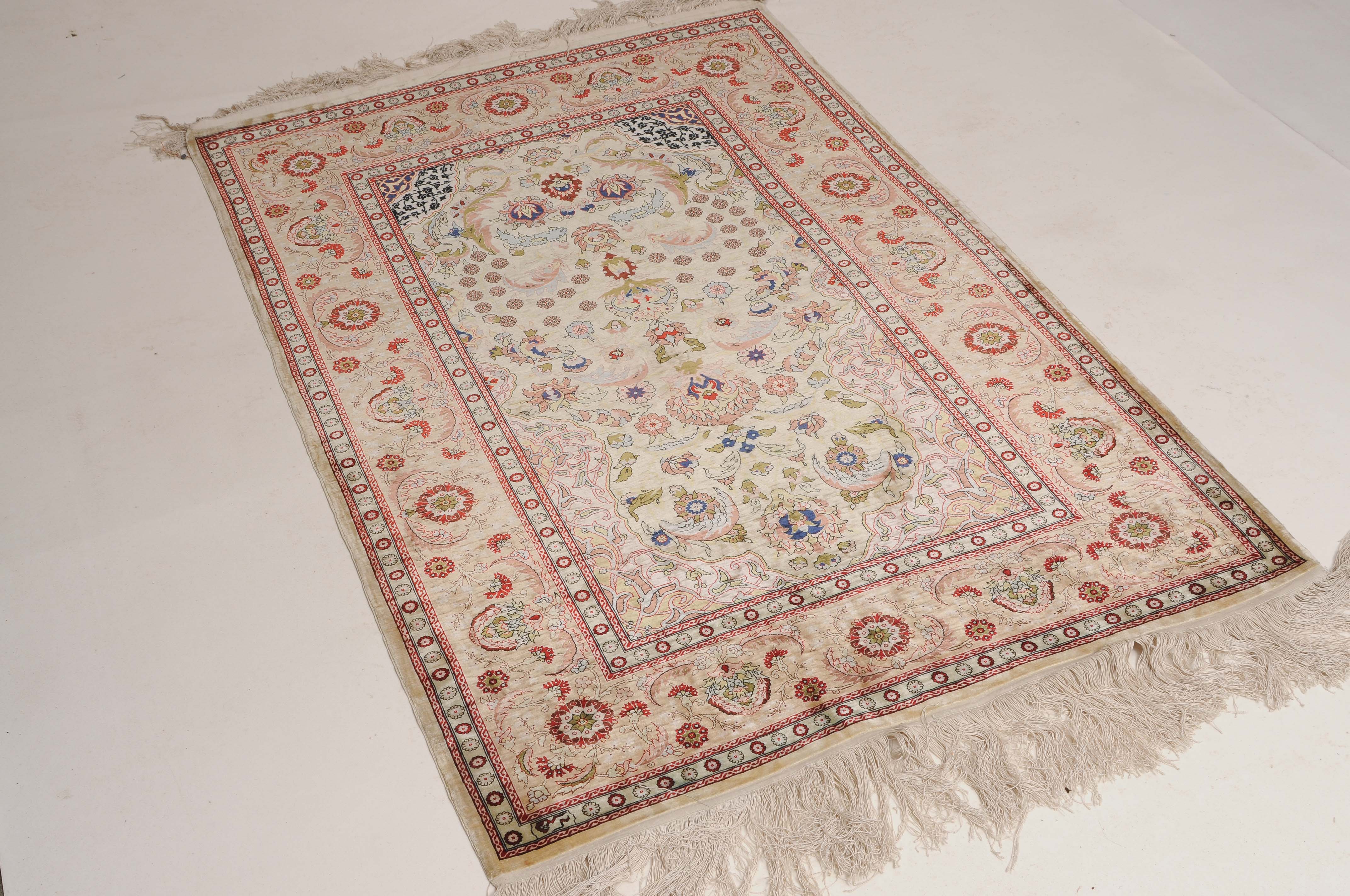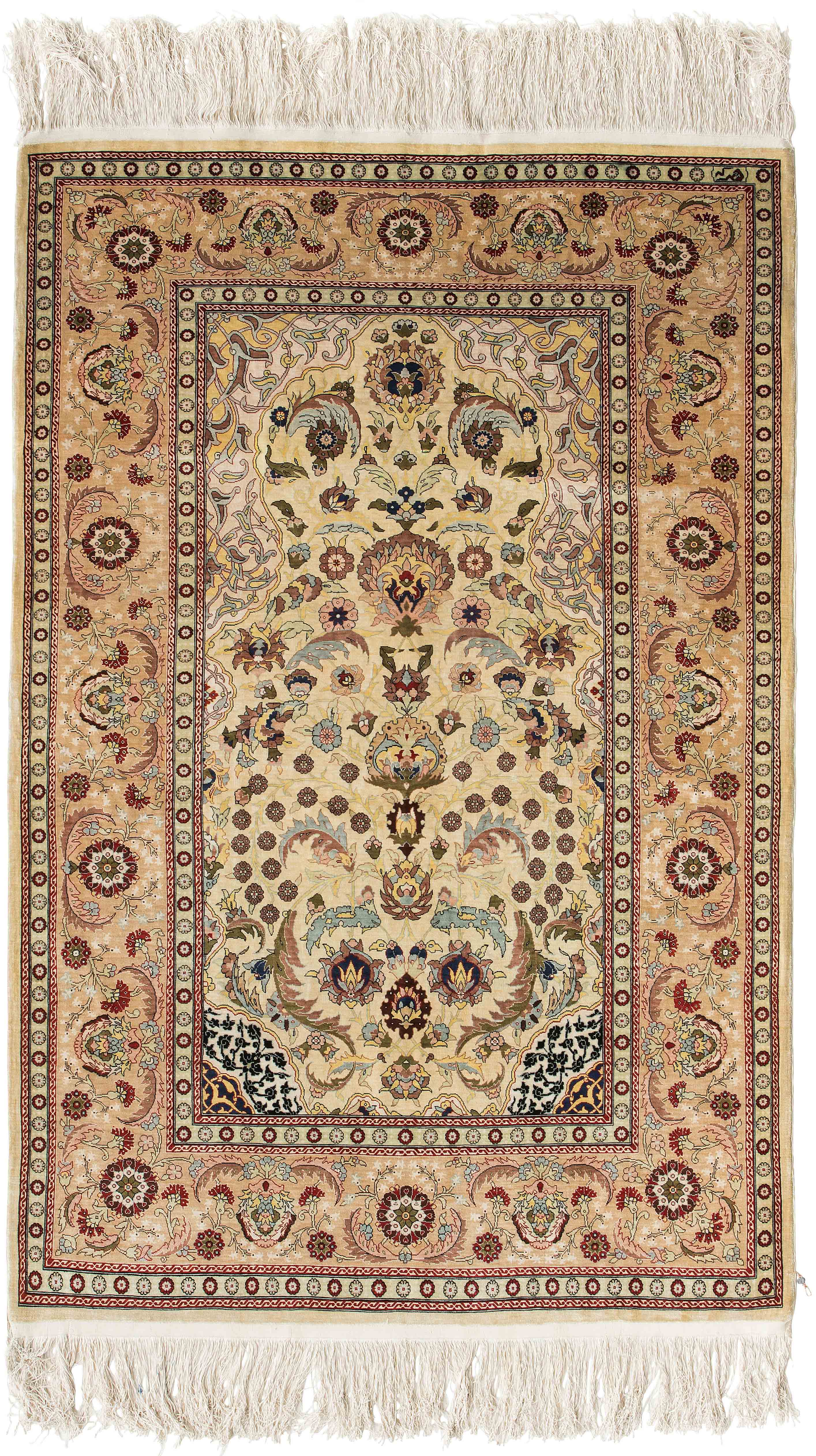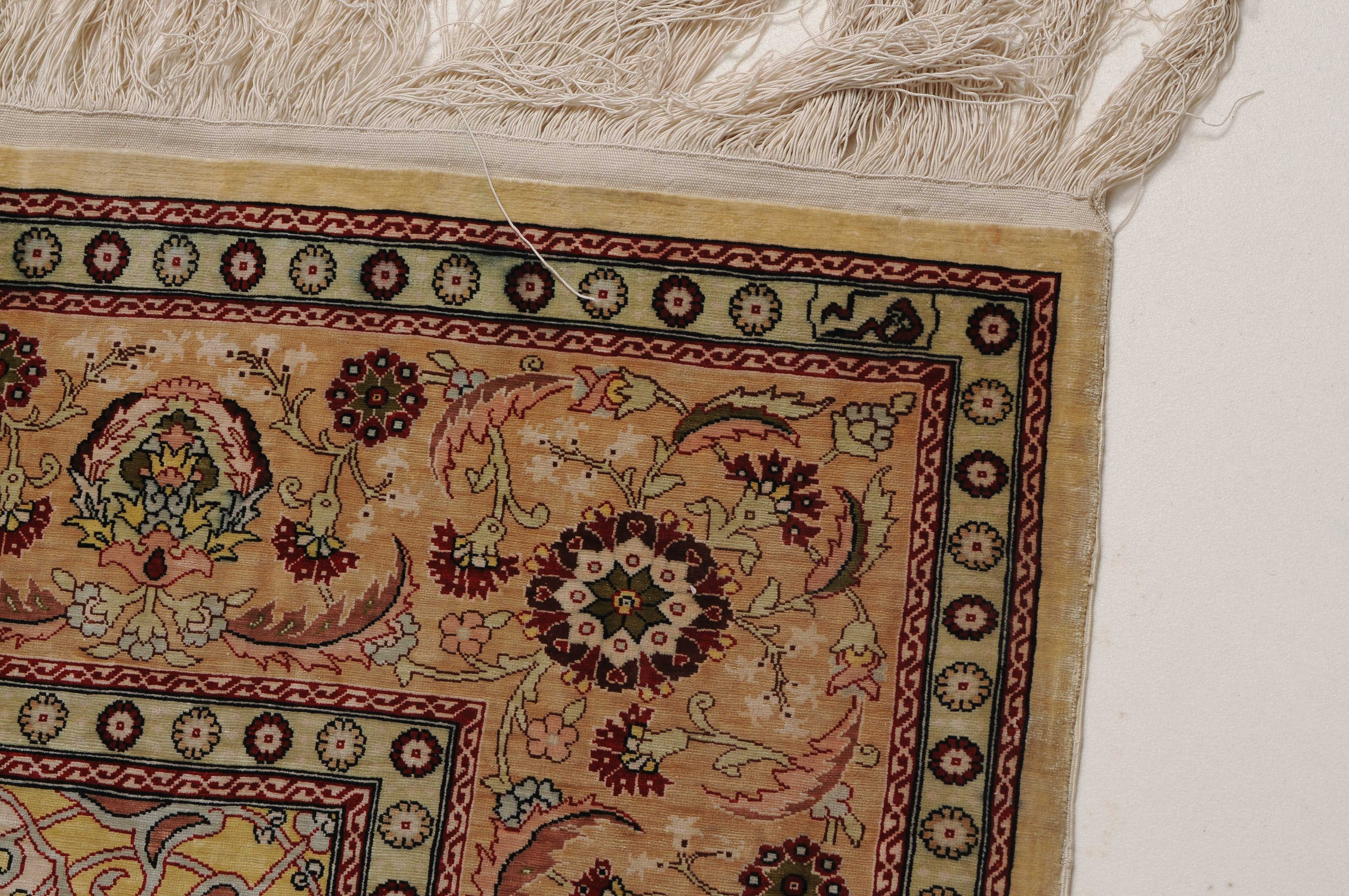 N-Türkei, um 1960. Oben rechts signiert mit "Hereke". Flormaterial Naturseide. Sehr feine Knüpfung. Auf zartgelbem Grund figurieren unter einer Gebetsnische (Mihrab) dicht platzierte Blüten und Blattranken, flankiert von 4 elegant gemusterten Eckzwickeln. Die Hauptbordüre ist mit Blütenpalmetten, Blattranken und Zweigen dekorativ belegt, dazu 2 Rosettenborten. Sehr gute Erhaltung. 100x155 cm (ft. 3.3x5.1).