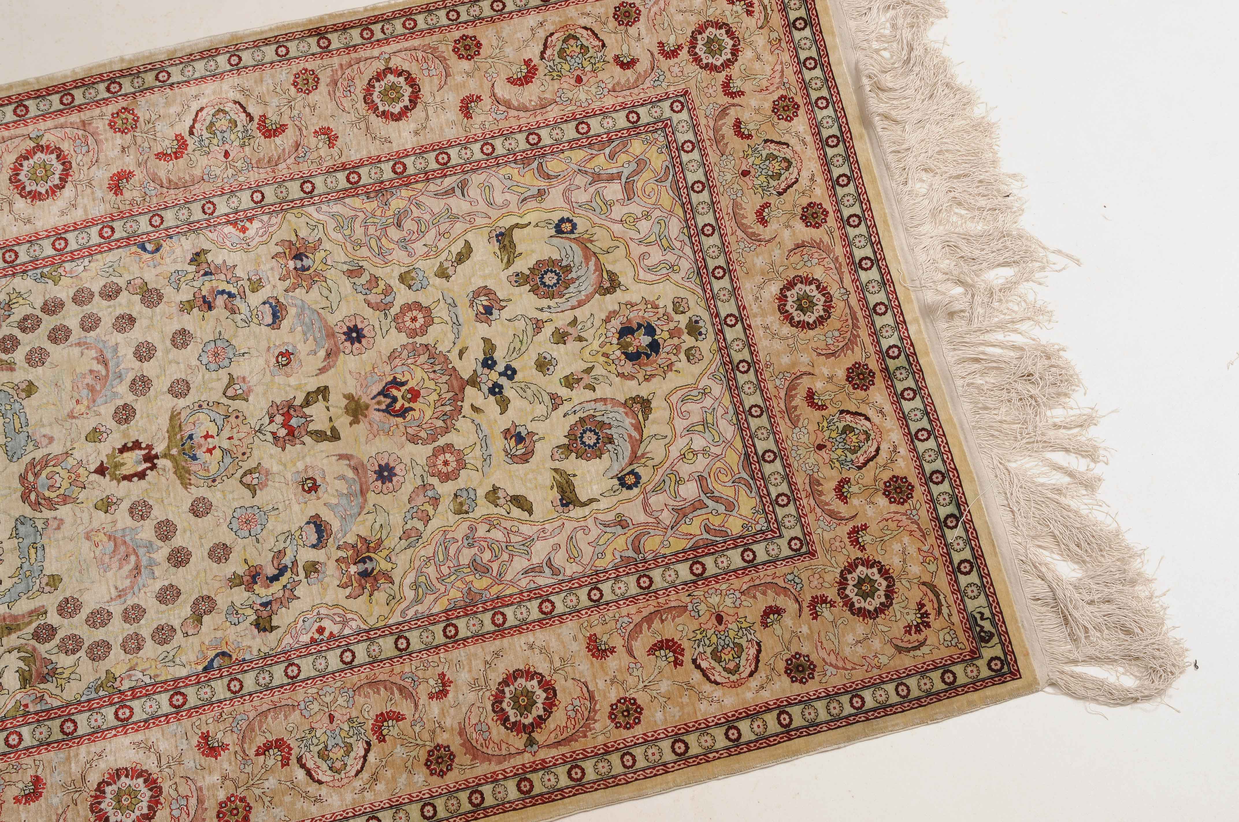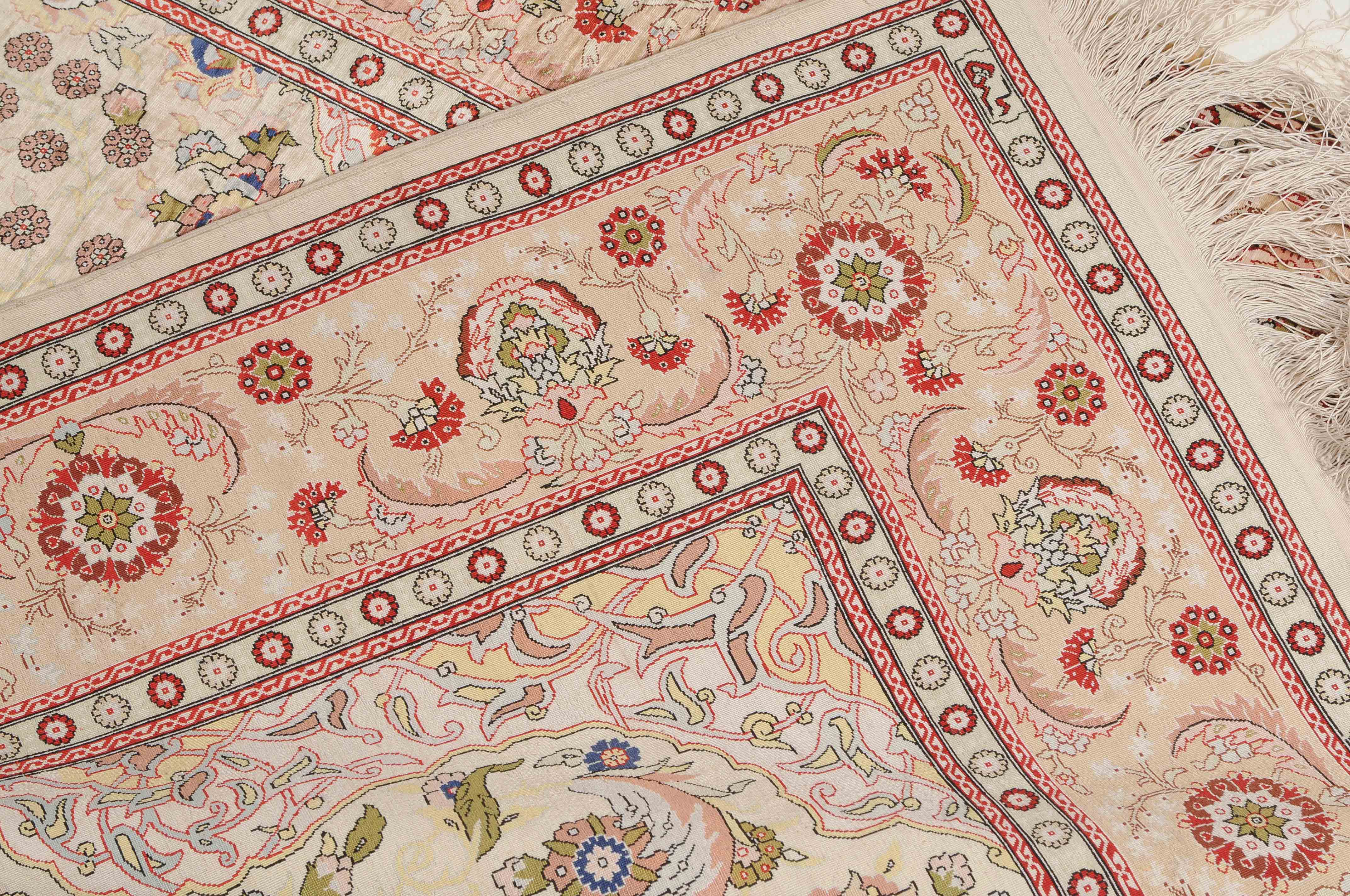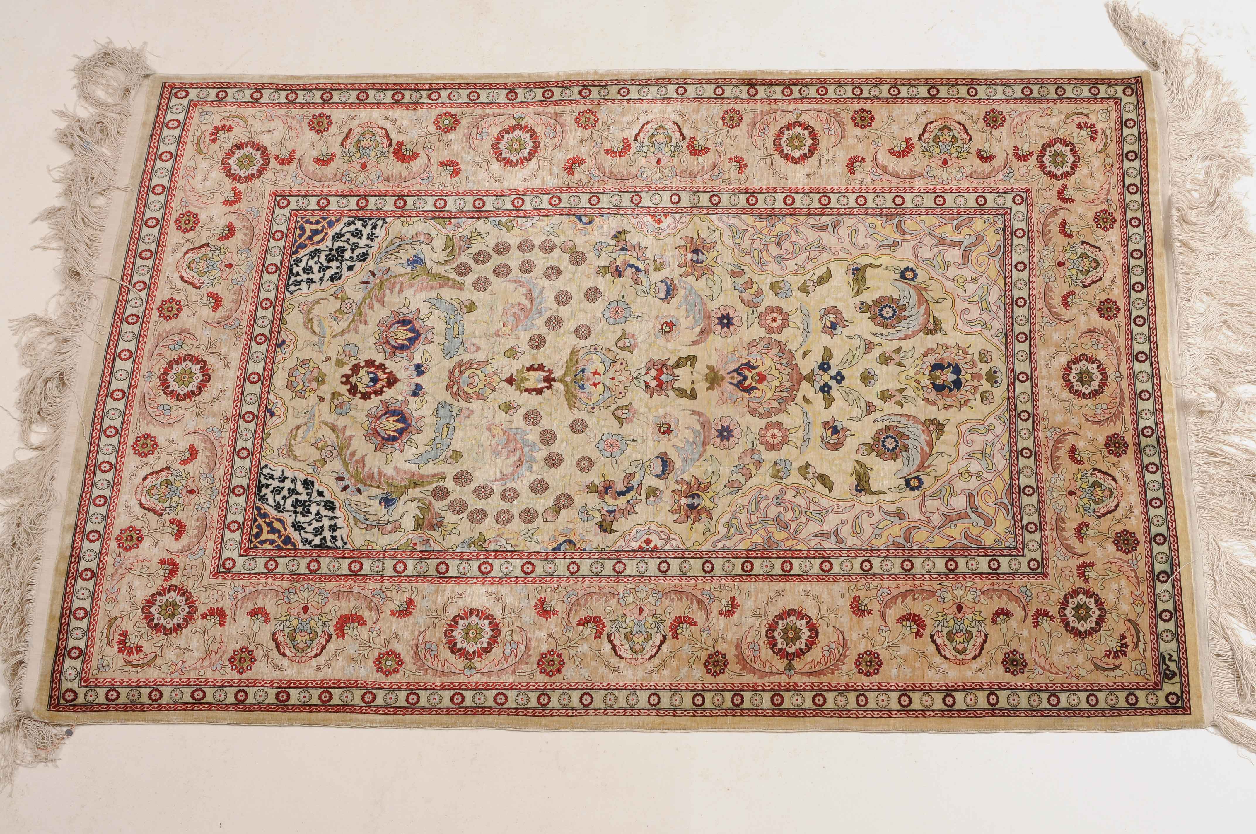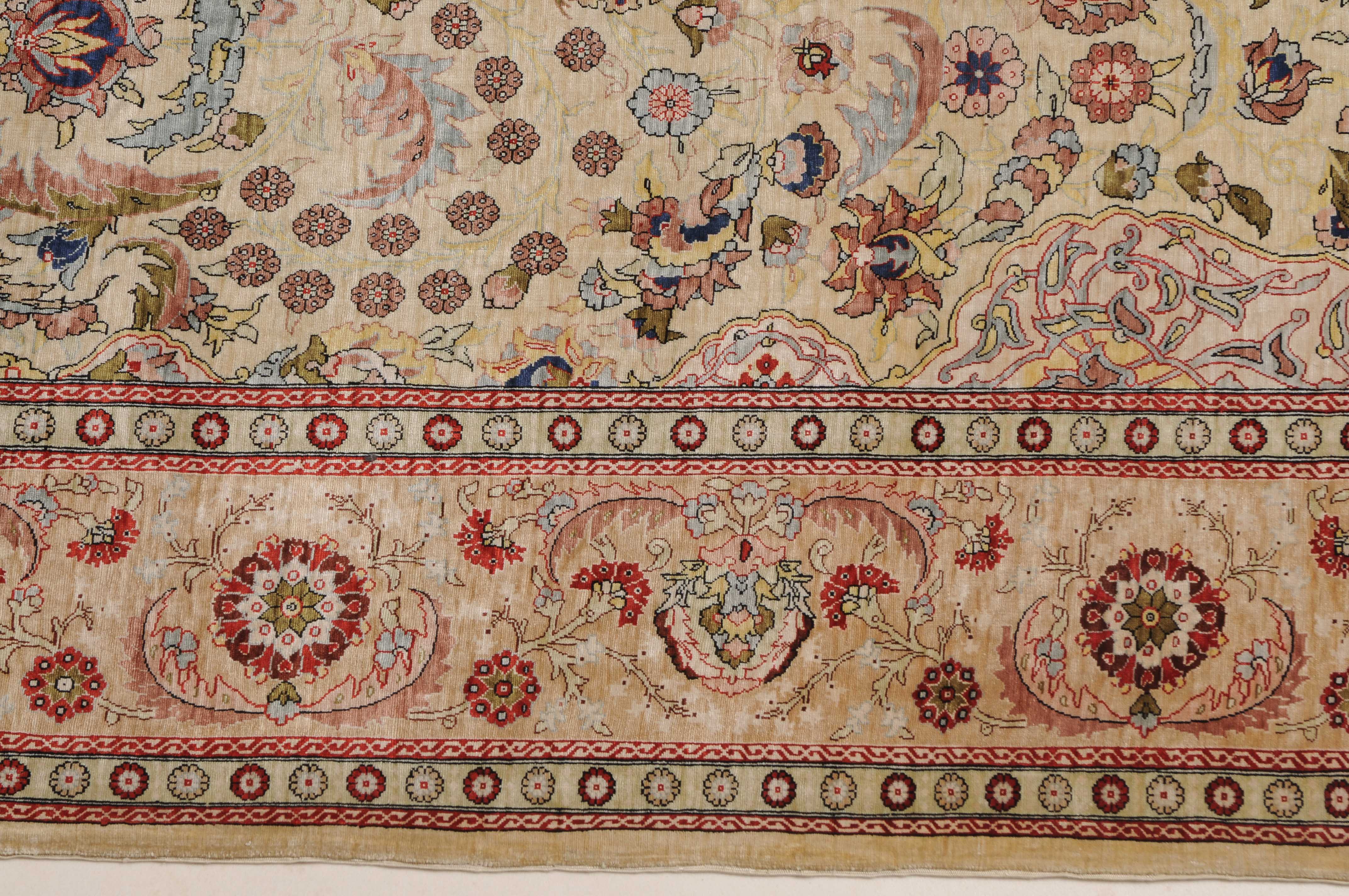N-Türkei, um 1960. Oben rechts signiert mit "Hereke". Flormaterial Naturseide. Sehr feine Knüpfung. Auf zartgelbem Grund figurieren unter einer Gebetsnische (Mihrab) dicht platzierte Blüten und Blattranken, flankiert von 4 elegant gemusterten Eckzwickeln. Die Hauptbordüre ist mit Blütenpalmetten, Blattranken und Zweigen dekorativ belegt, dazu 2 Rosettenborten. Sehr gute Erhaltung. 100x155 cm (ft. 3.3x5.1).
