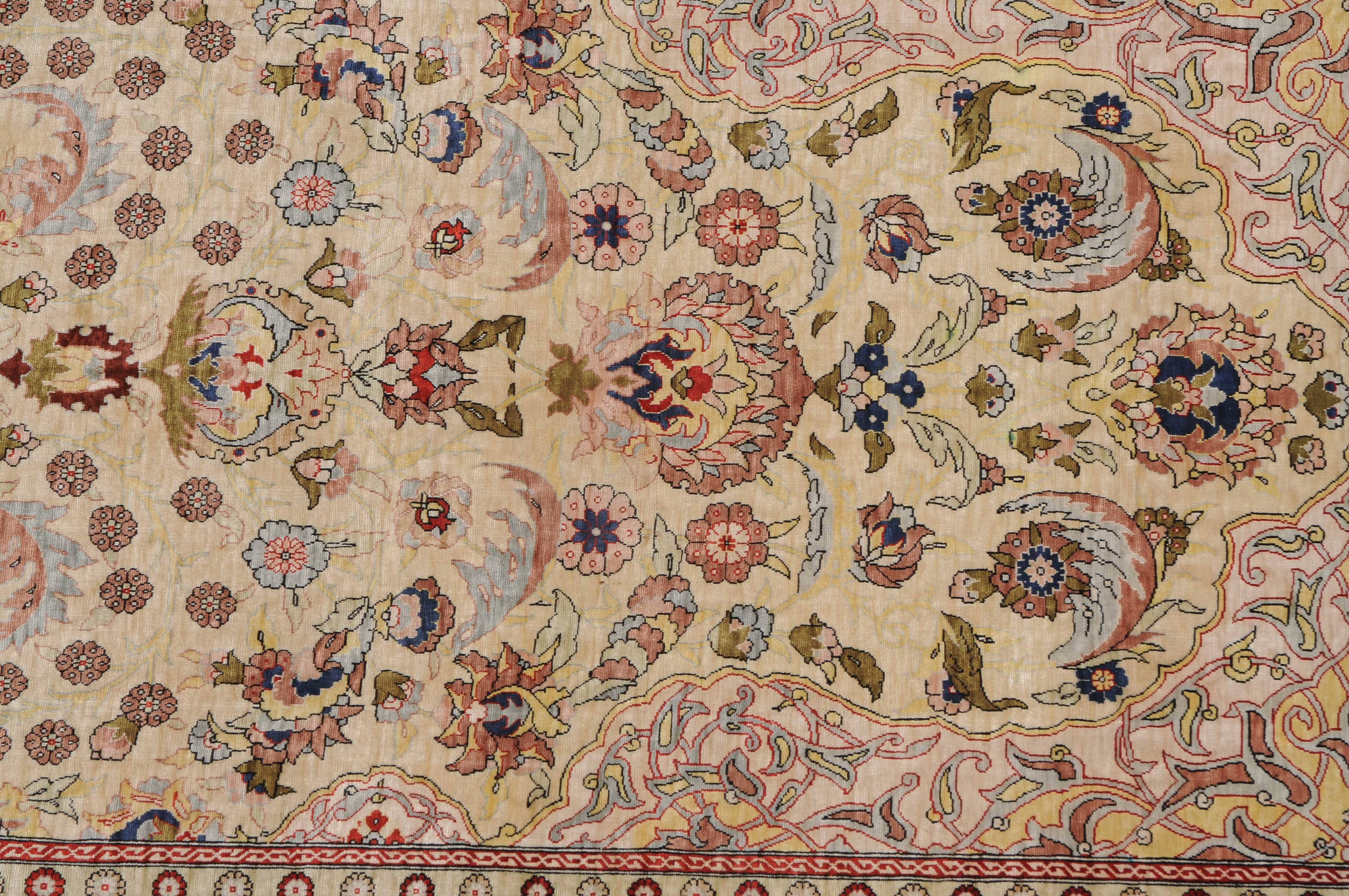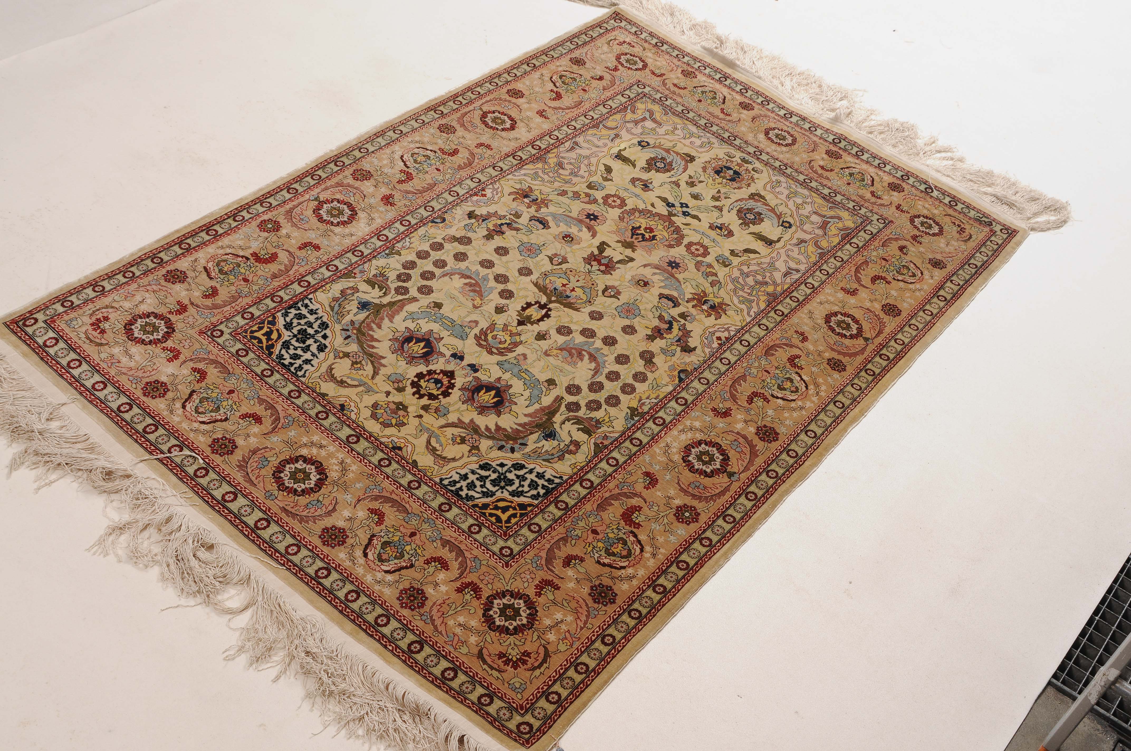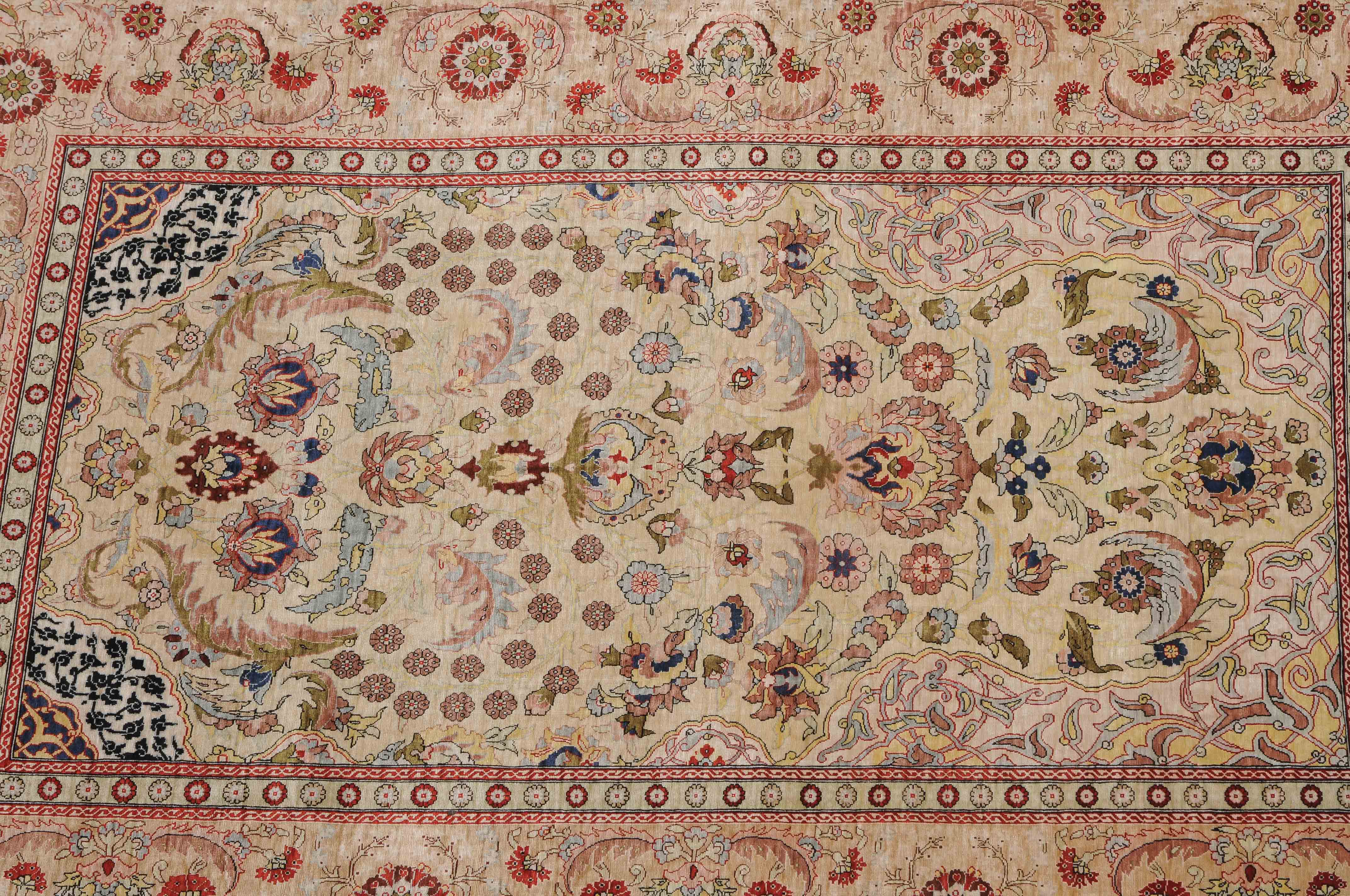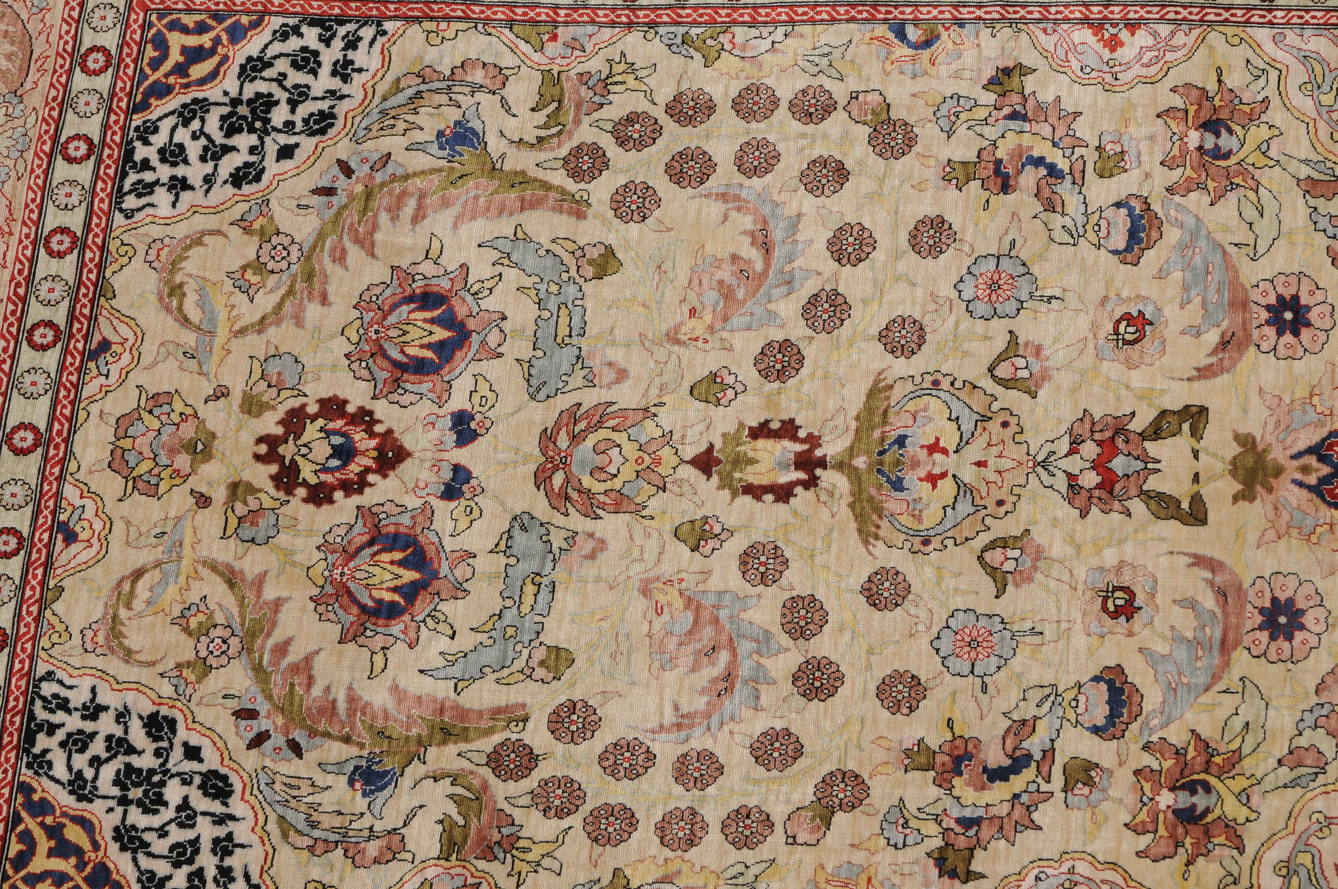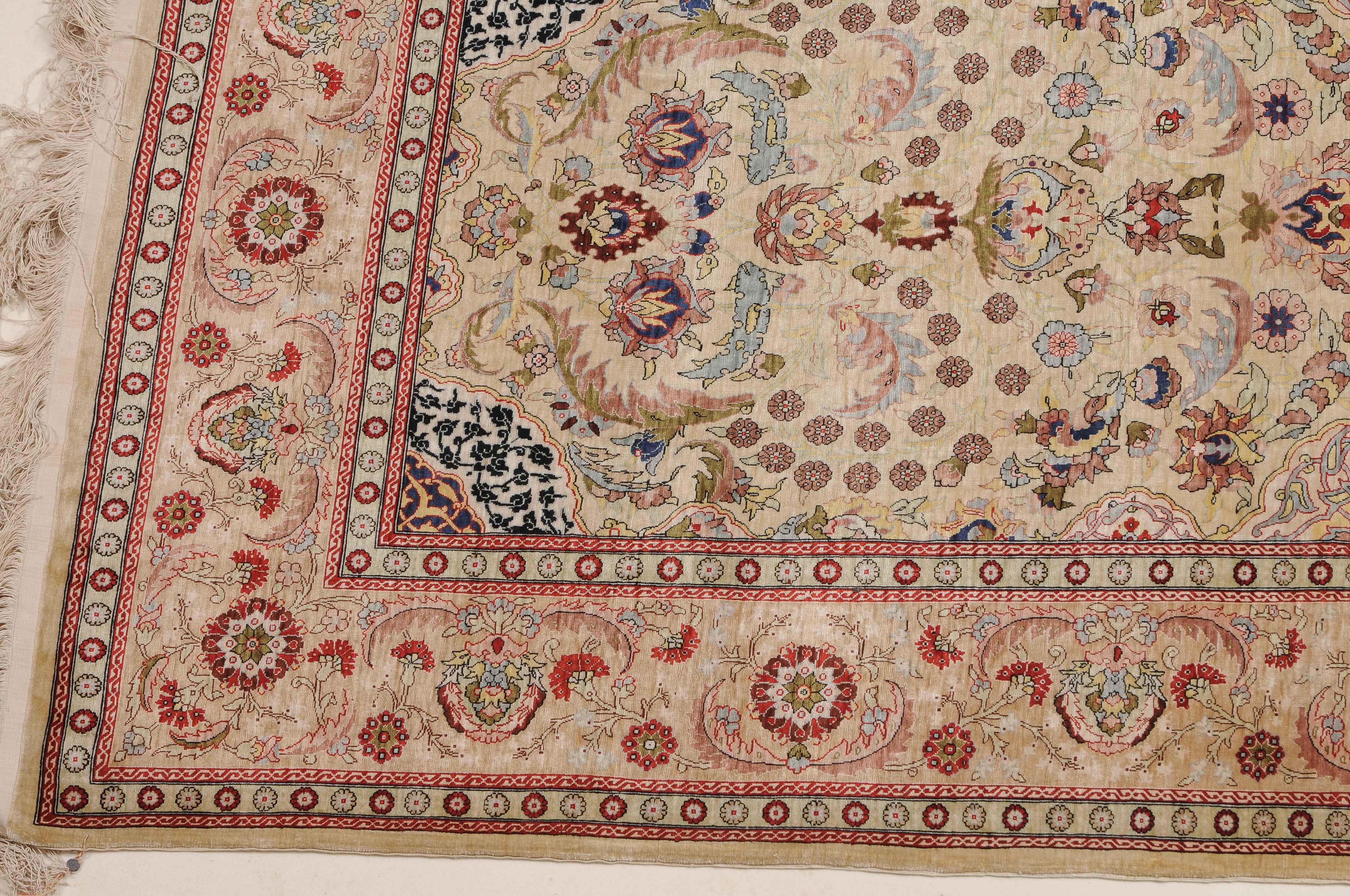 N-Türkei, um 1960. Oben rechts signiert mit "Hereke". Flormaterial Naturseide. Sehr feine Knüpfung. Auf zartgelbem Grund figurieren unter einer Gebetsnische (Mihrab) dicht platzierte Blüten und Blattranken, flankiert von 4 elegant gemusterten Eckzwickeln. Die Hauptbordüre ist mit Blütenpalmetten, Blattranken und Zweigen dekorativ belegt, dazu 2 Rosettenborten. Sehr gute Erhaltung. 100x155 cm (ft. 3.3x5.1).