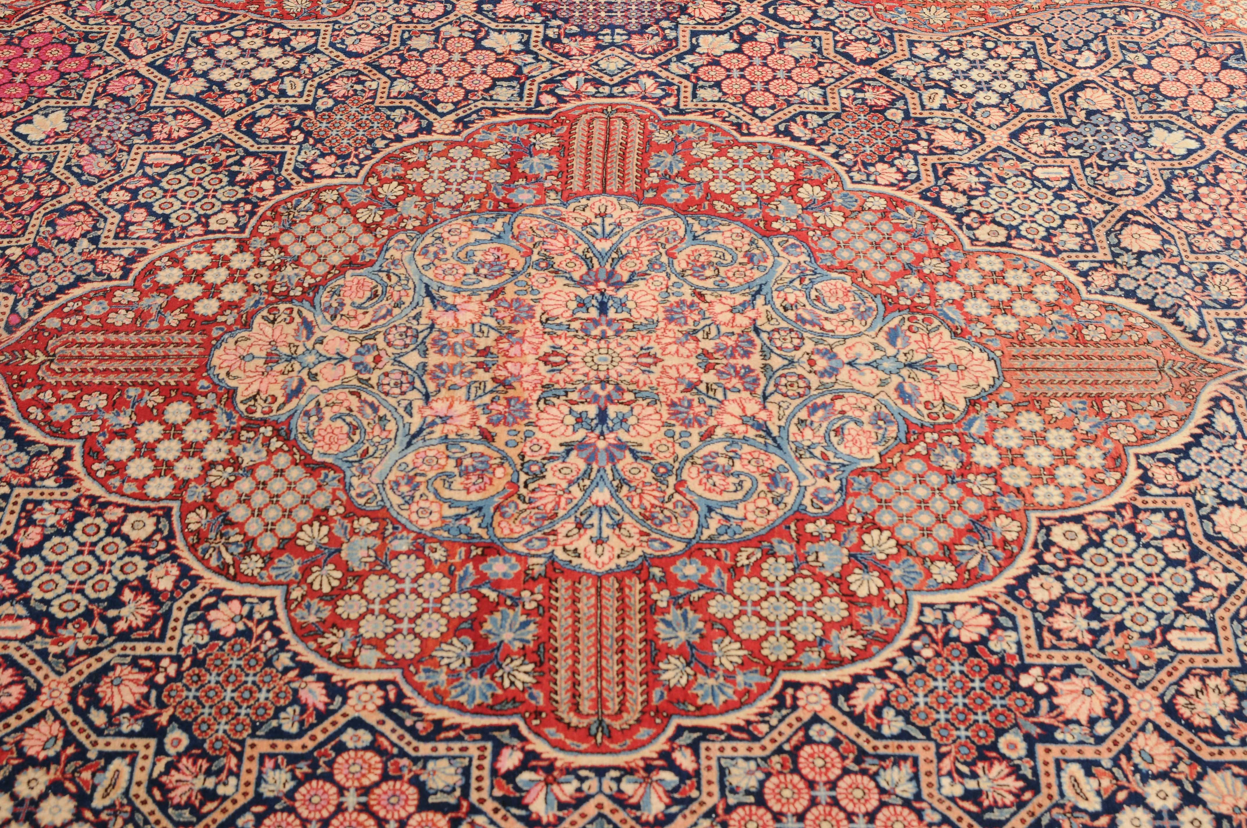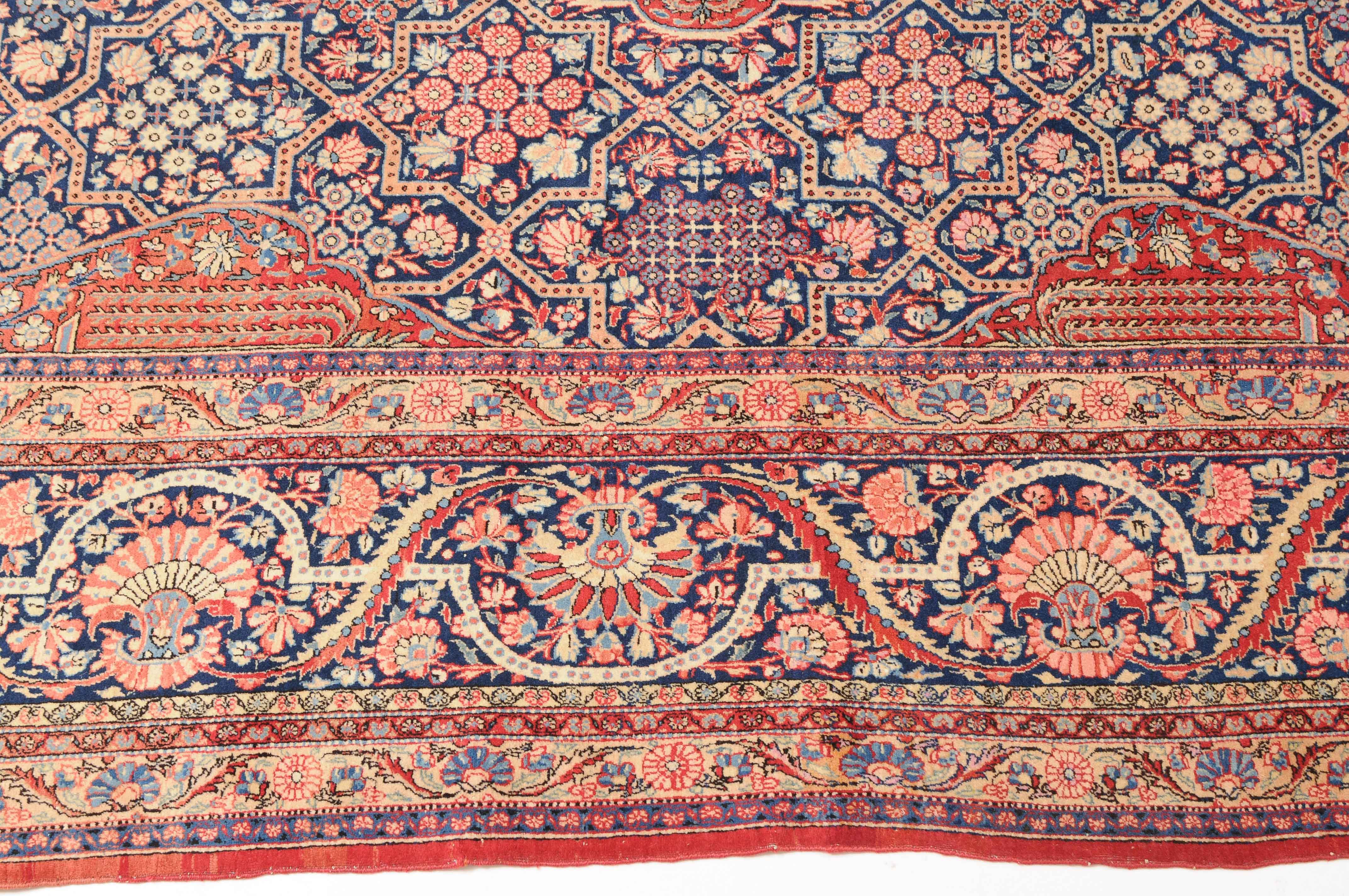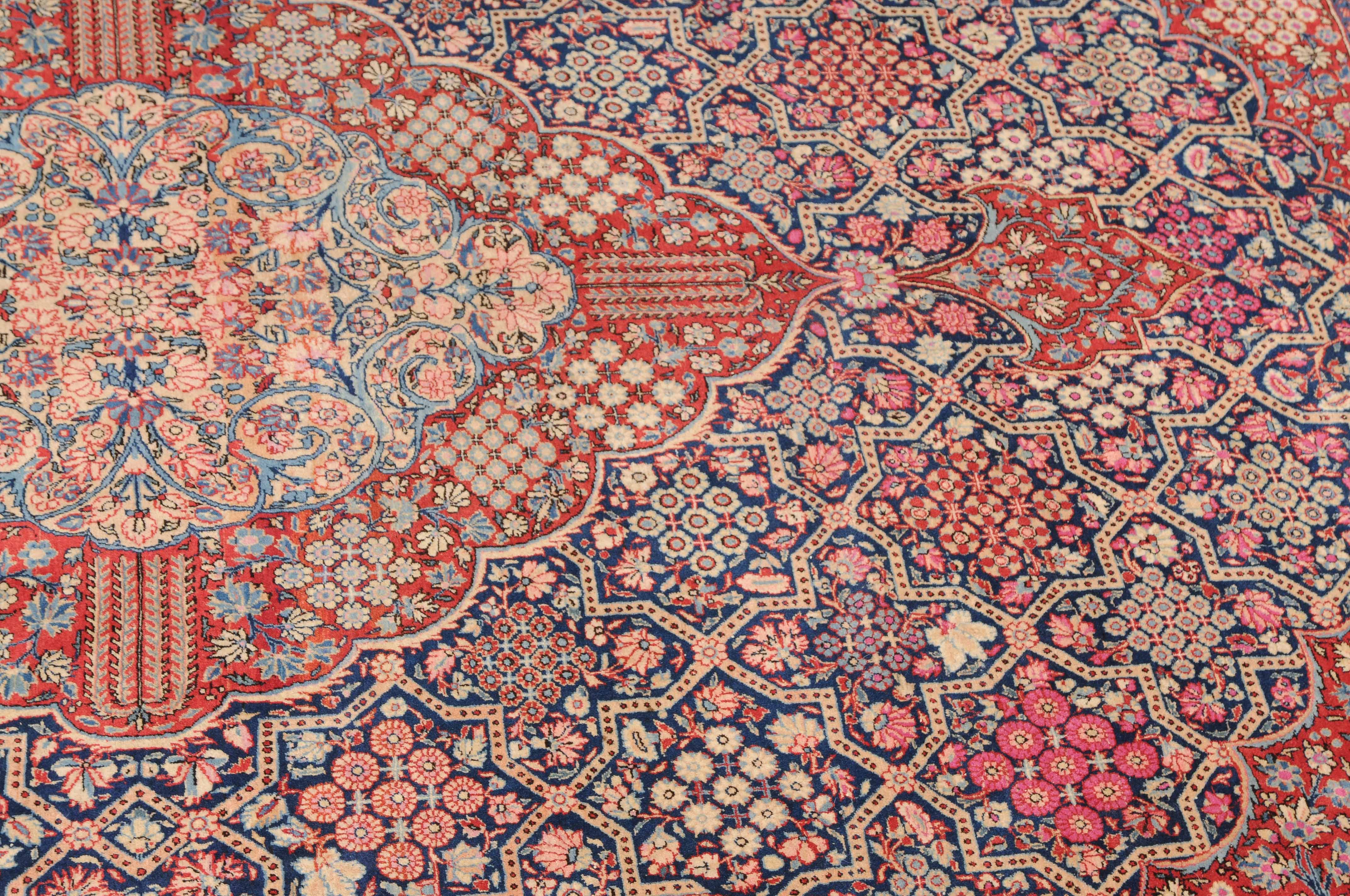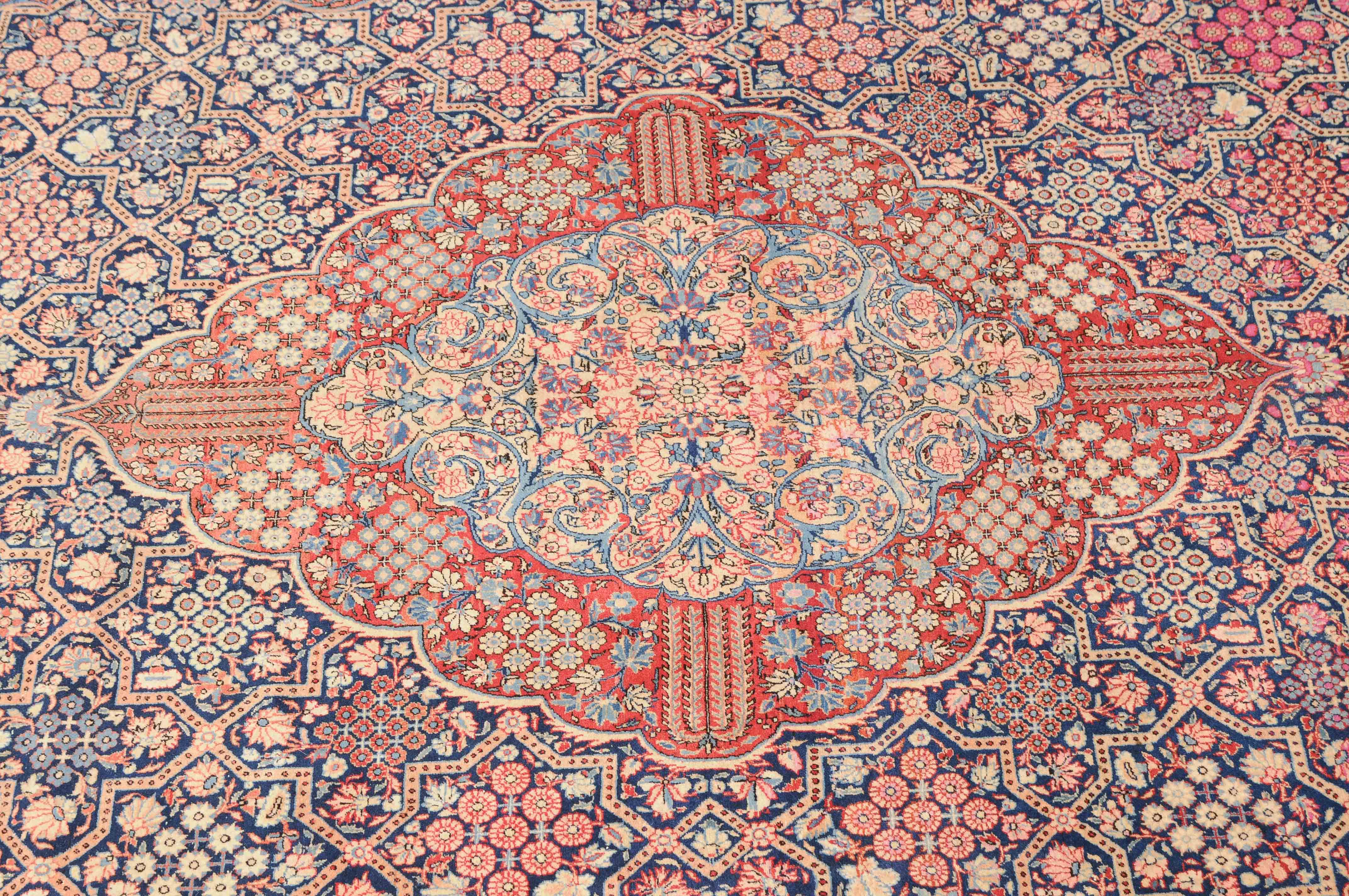 Z-Persien, um 1910. Eine filigrane gepunktete Borte teilt das nachtblaue Hauptfeld in kreuz- und sternförmige Felder, die mit fein gezeichneten Blüten in unterschiedlichen Ausführungen belegt sind. Im Zentrum ruht ein rotes Zitronen-Medaillon, flankiert von 4 Eckzwickeln. 2 stilvolle Nebenbordüren umgeben die breite nachtblaue Wellenranken-Hauptbordüre. Natürlicher Abrash. Gute Erhaltung. 310x420 cm (ft.10.2x13.9).