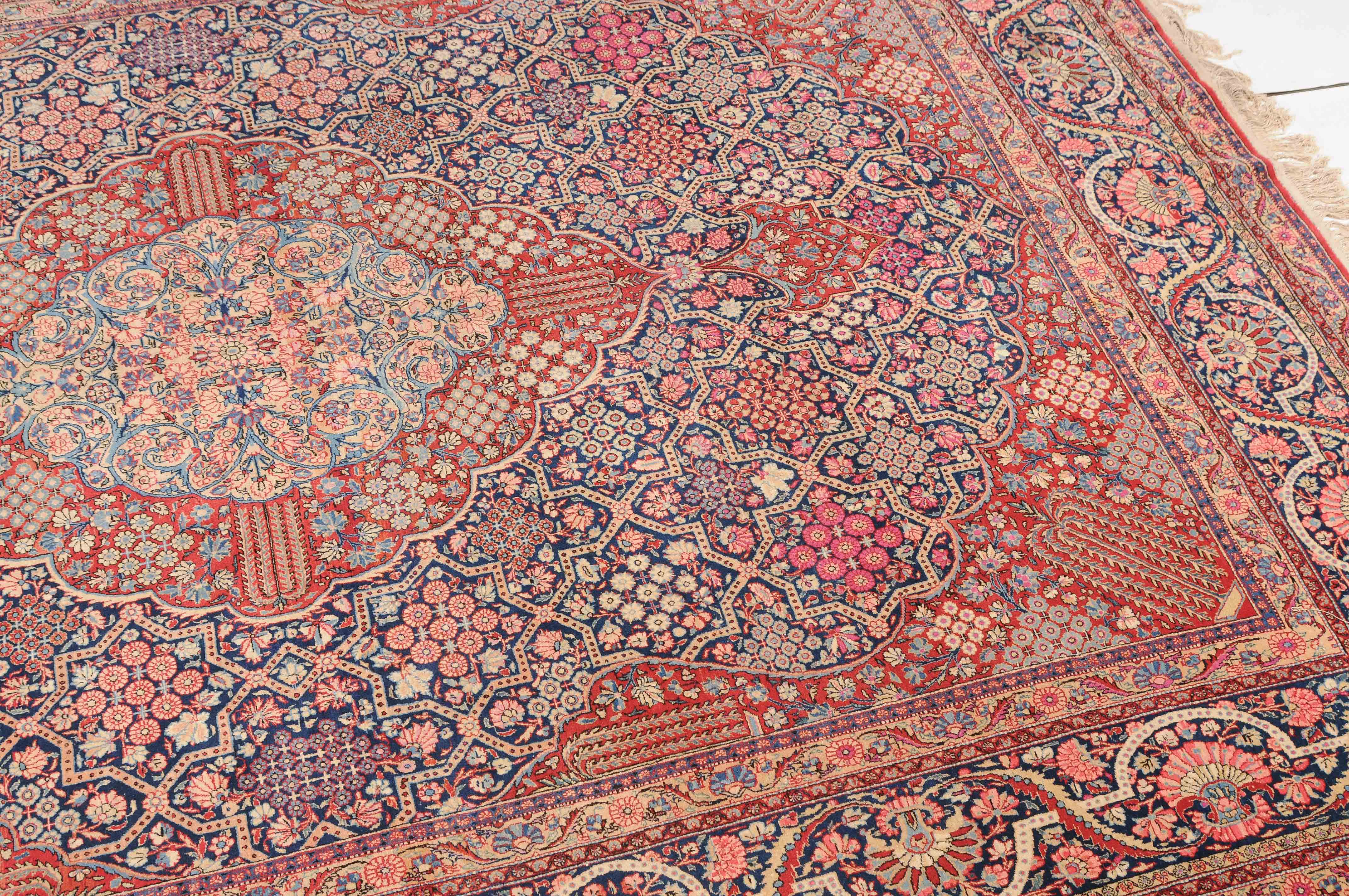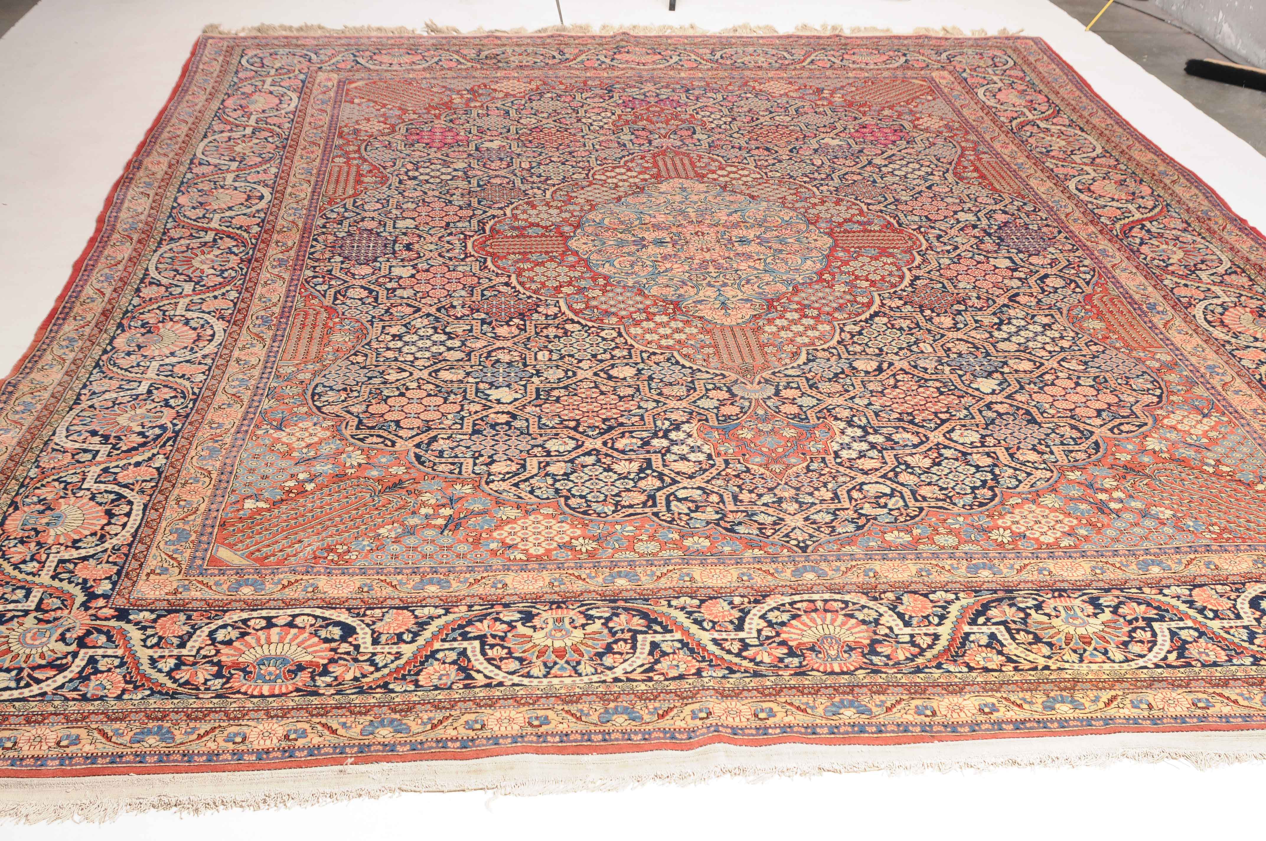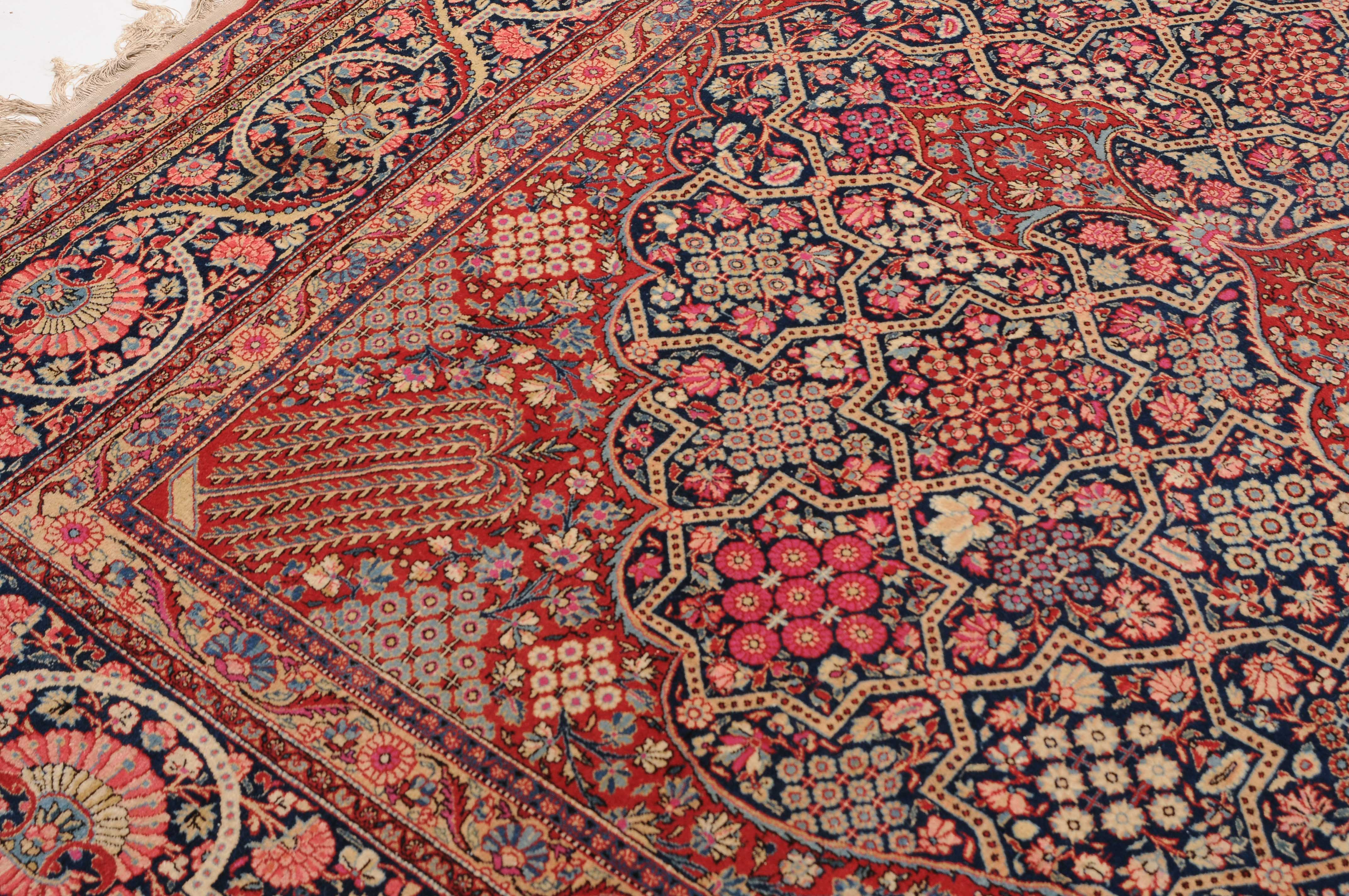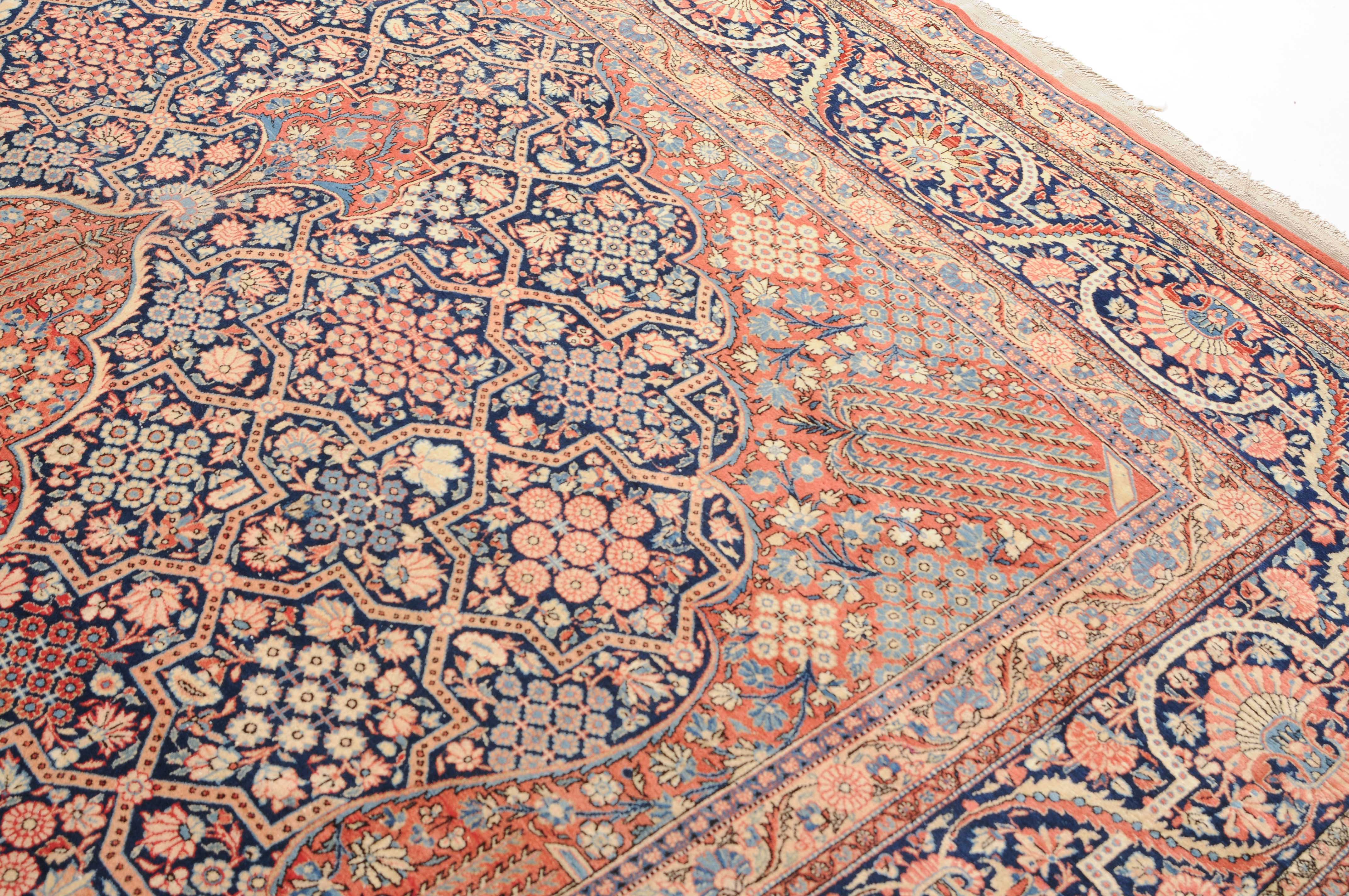 Z-Persien, um 1910. Eine filigrane gepunktete Borte teilt das nachtblaue Hauptfeld in kreuz- und sternförmige Felder, die mit fein gezeichneten Blüten in unterschiedlichen Ausführungen belegt sind. Im Zentrum ruht ein rotes Zitronen-Medaillon, flankiert von 4 Eckzwickeln. 2 stilvolle Nebenbordüren umgeben die breite nachtblaue Wellenranken-Hauptbordüre. Natürlicher Abrash. Gute Erhaltung. 310x420 cm (ft.10.2x13.9).