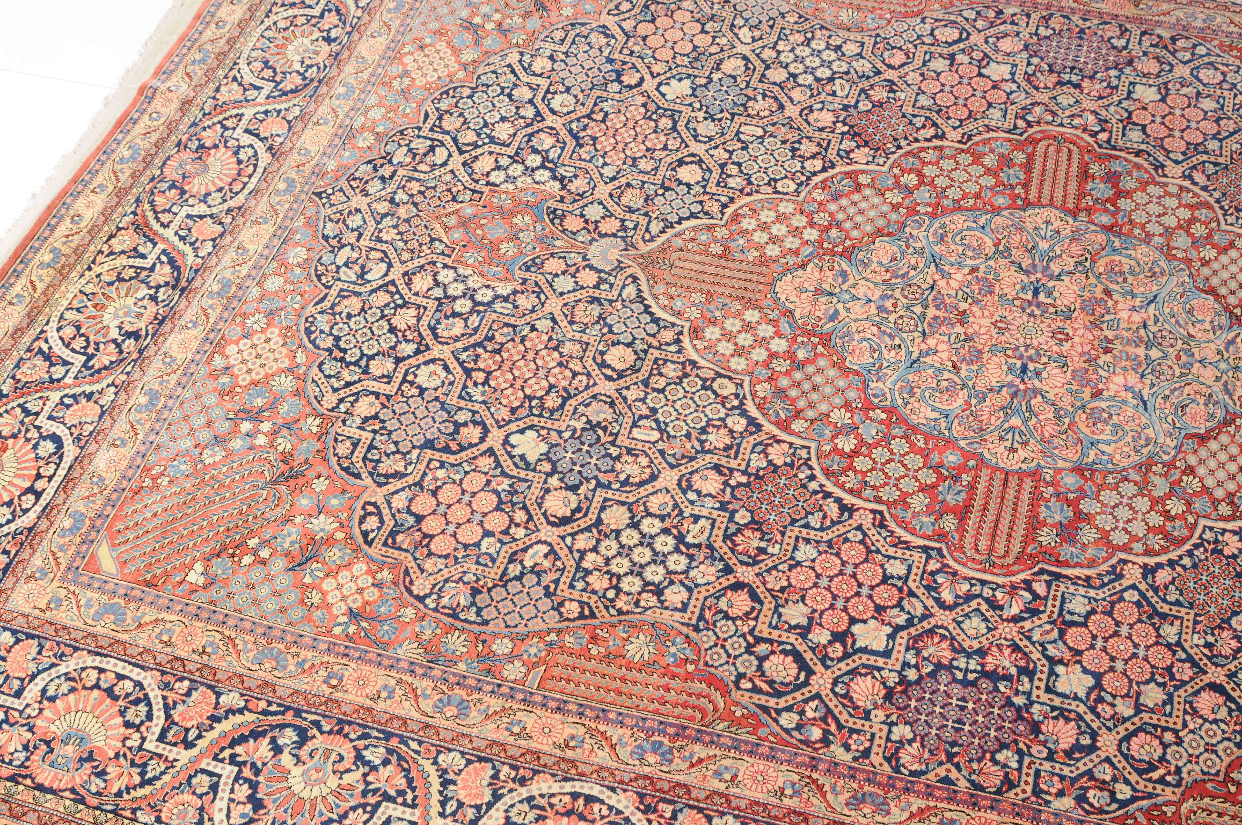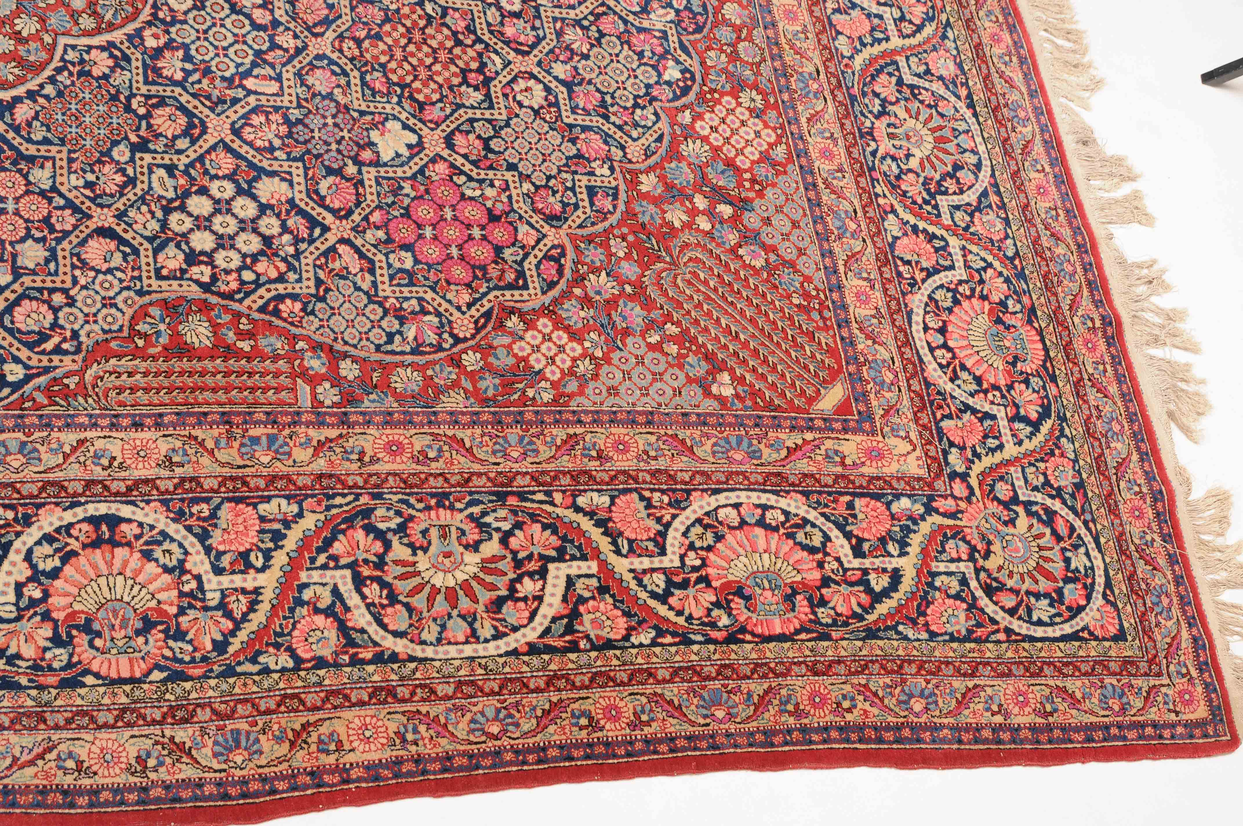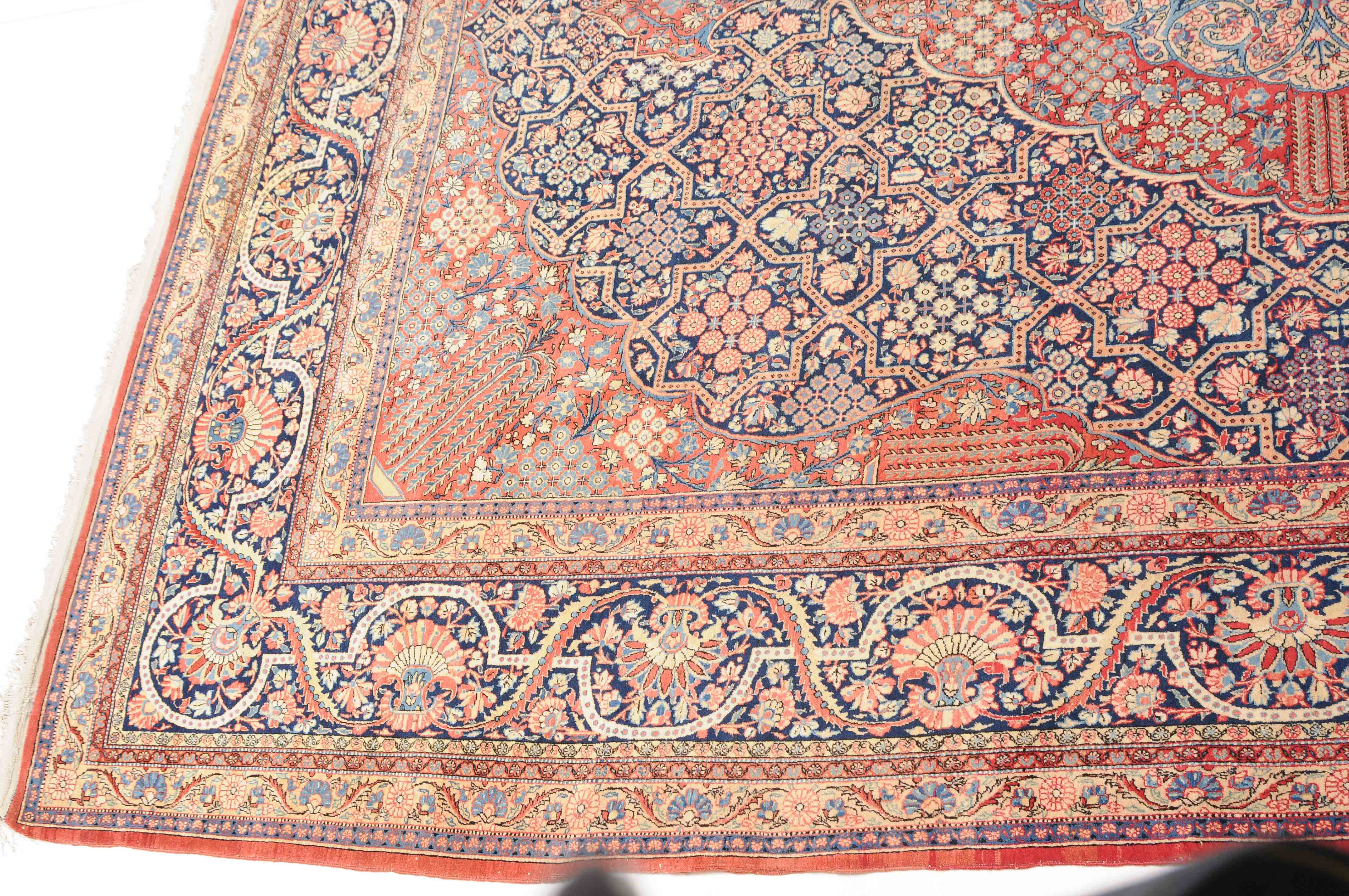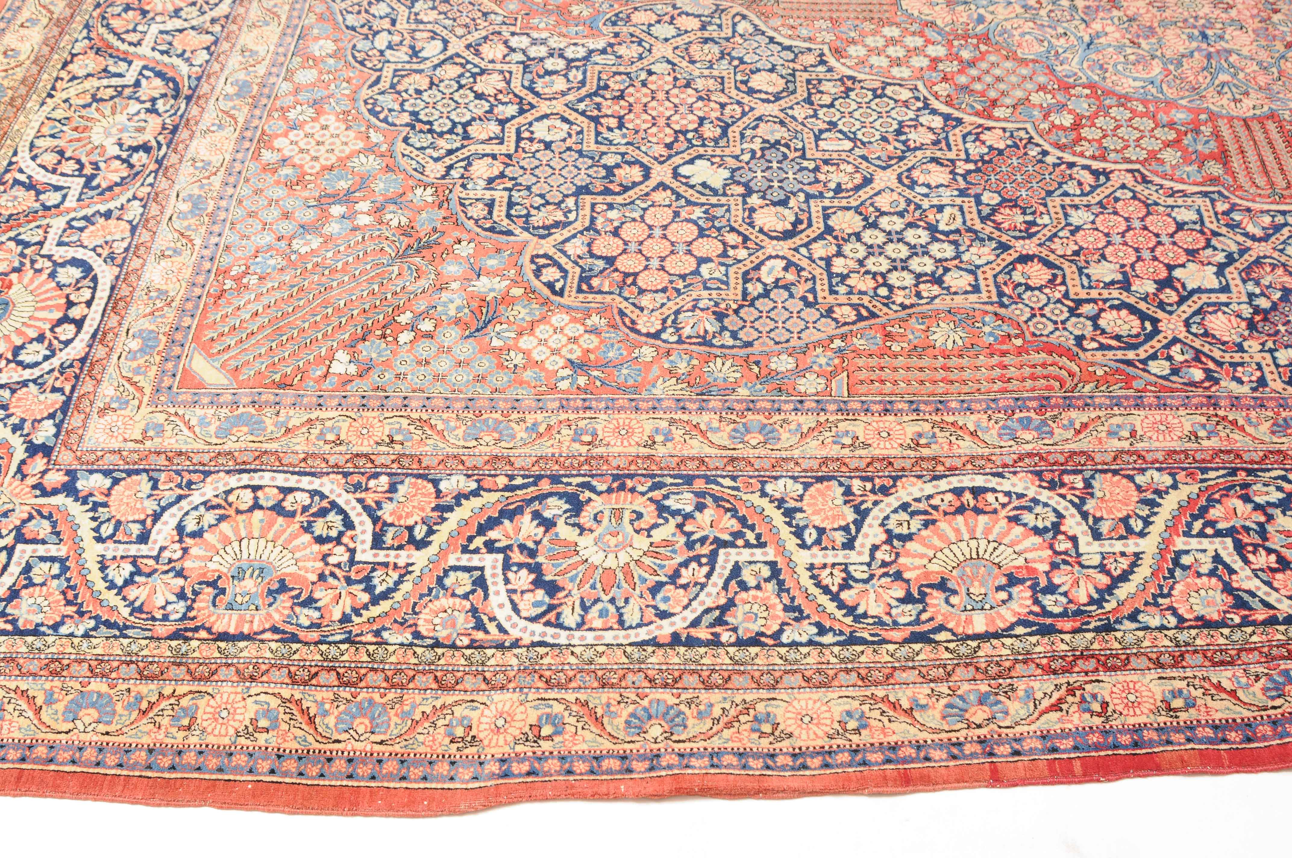 Z-Persien, um 1910. Eine filigrane gepunktete Borte teilt das nachtblaue Hauptfeld in kreuz- und sternförmige Felder, die mit fein gezeichneten Blüten in unterschiedlichen Ausführungen belegt sind. Im Zentrum ruht ein rotes Zitronen-Medaillon, flankiert von 4 Eckzwickeln. 2 stilvolle Nebenbordüren umgeben die breite nachtblaue Wellenranken-Hauptbordüre. Natürlicher Abrash. Gute Erhaltung. 310x420 cm (ft.10.2x13.9).