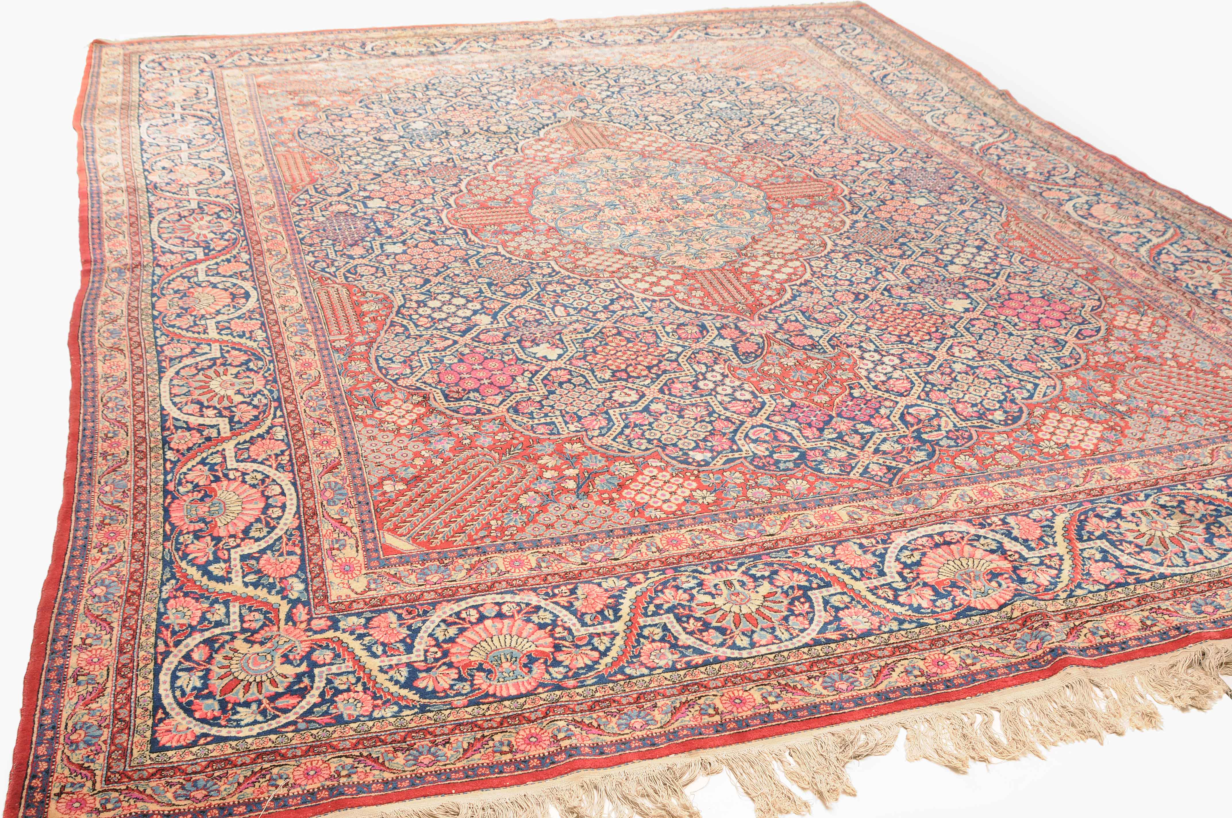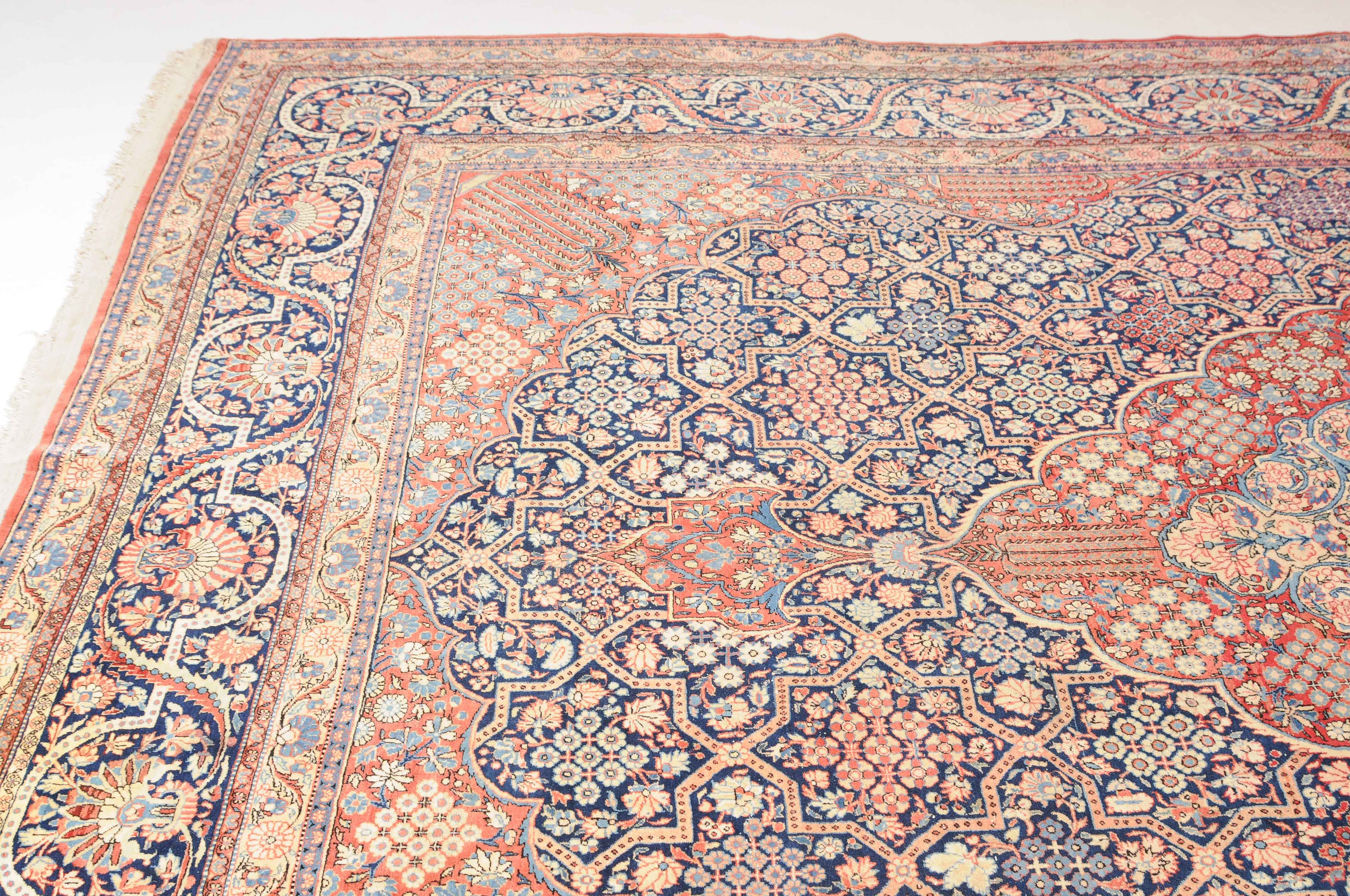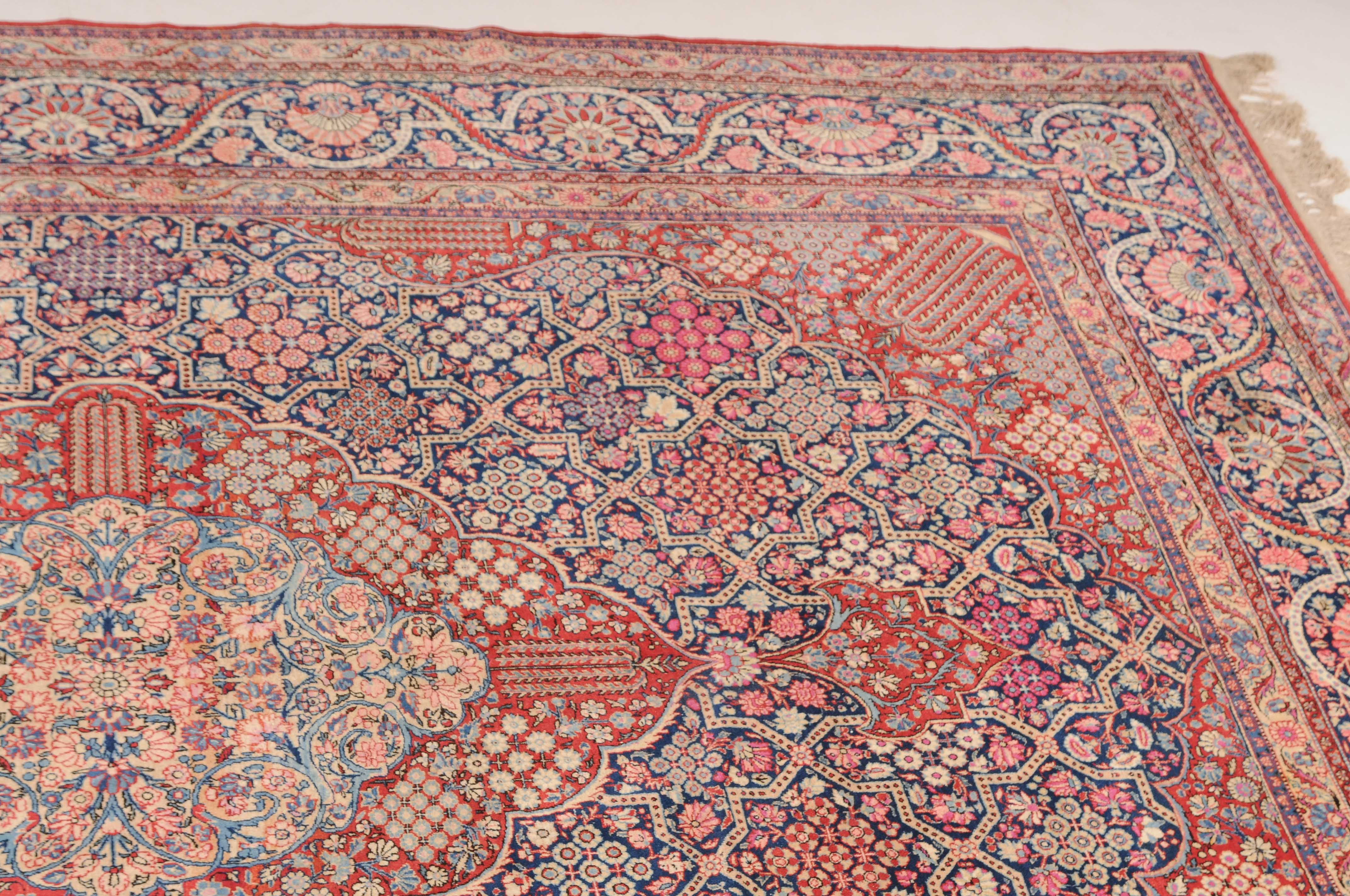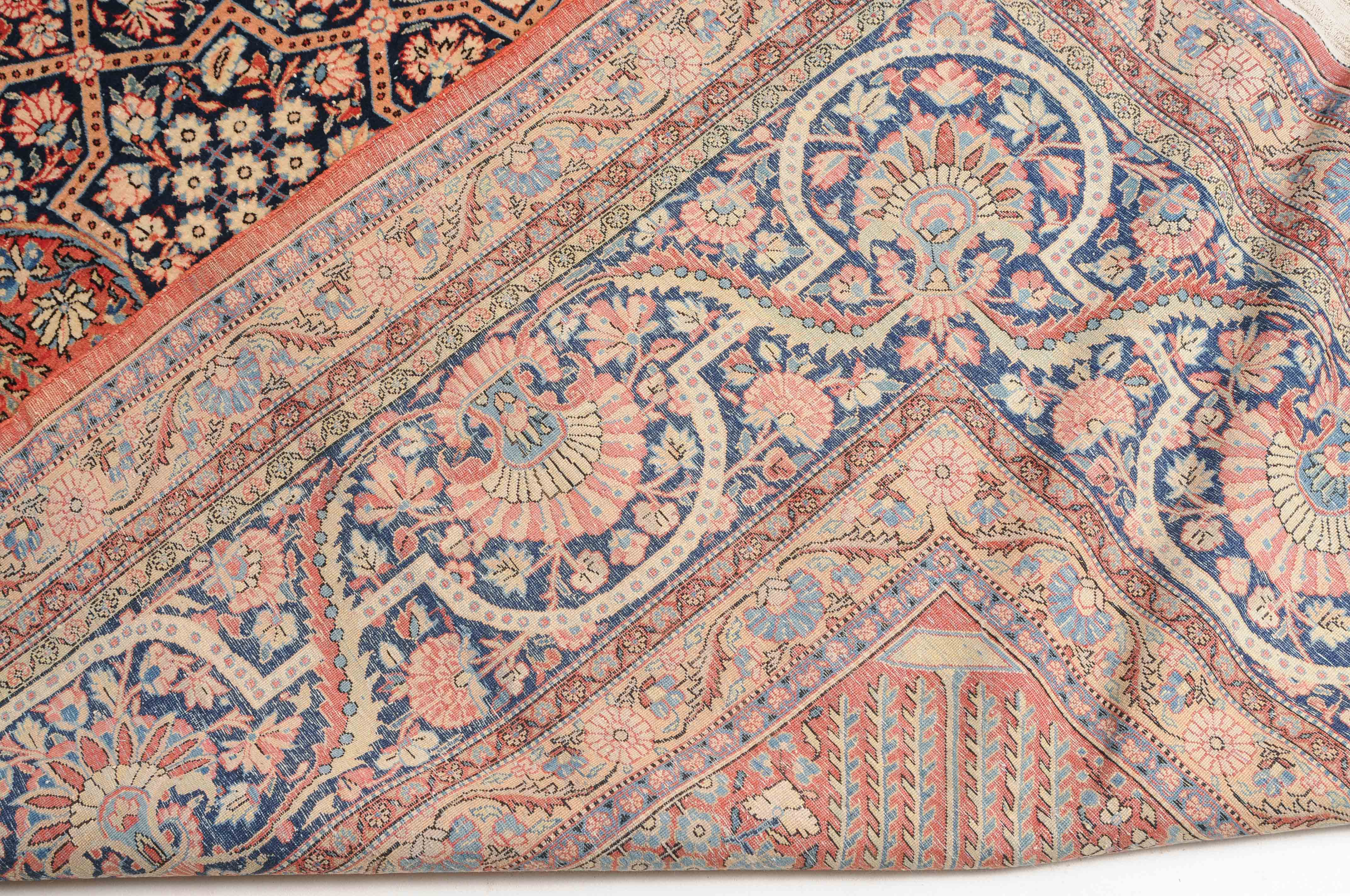 Z-Persien, um 1910. Eine filigrane gepunktete Borte teilt das nachtblaue Hauptfeld in kreuz- und sternförmige Felder, die mit fein gezeichneten Blüten in unterschiedlichen Ausführungen belegt sind. Im Zentrum ruht ein rotes Zitronen-Medaillon, flankiert von 4 Eckzwickeln. 2 stilvolle Nebenbordüren umgeben die breite nachtblaue Wellenranken-Hauptbordüre. Natürlicher Abrash. Gute Erhaltung. 310x420 cm (ft.10.2x13.9).