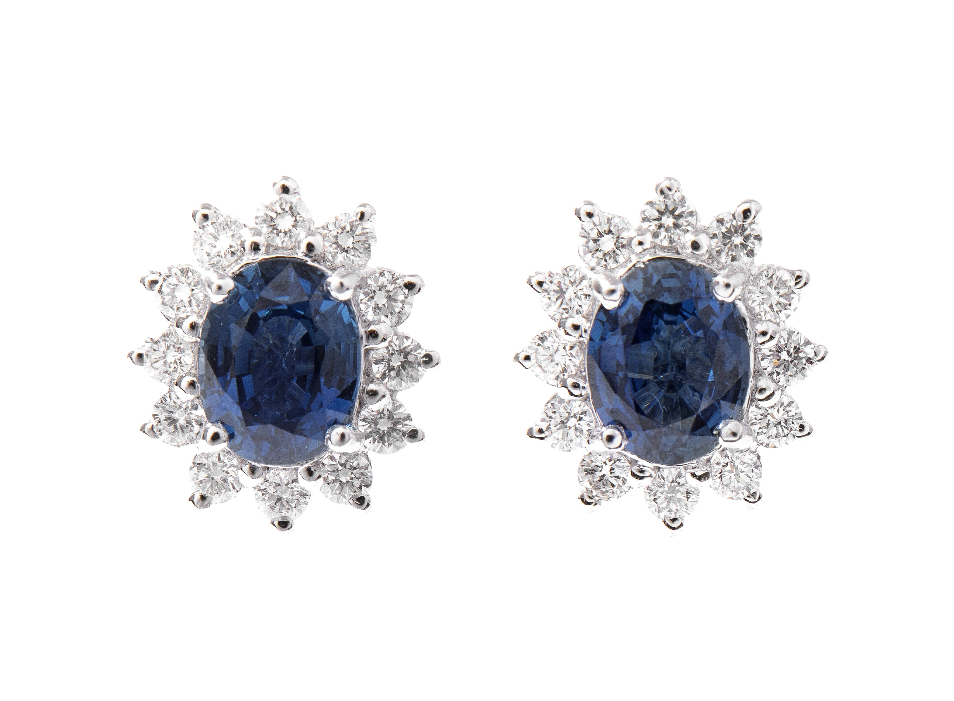 750 Weissgold. Entourage-Modell mit 2 oval fac. Saphiren von 3.83 ct und 24 Brillanten von 1.38 ct H-si. 8,3 g. Neuwertig.