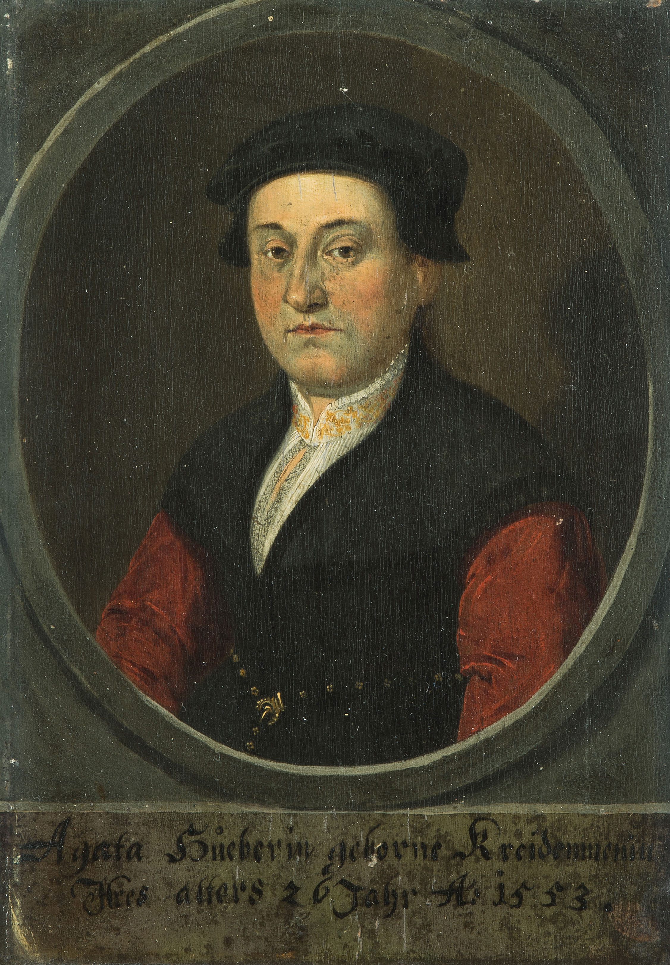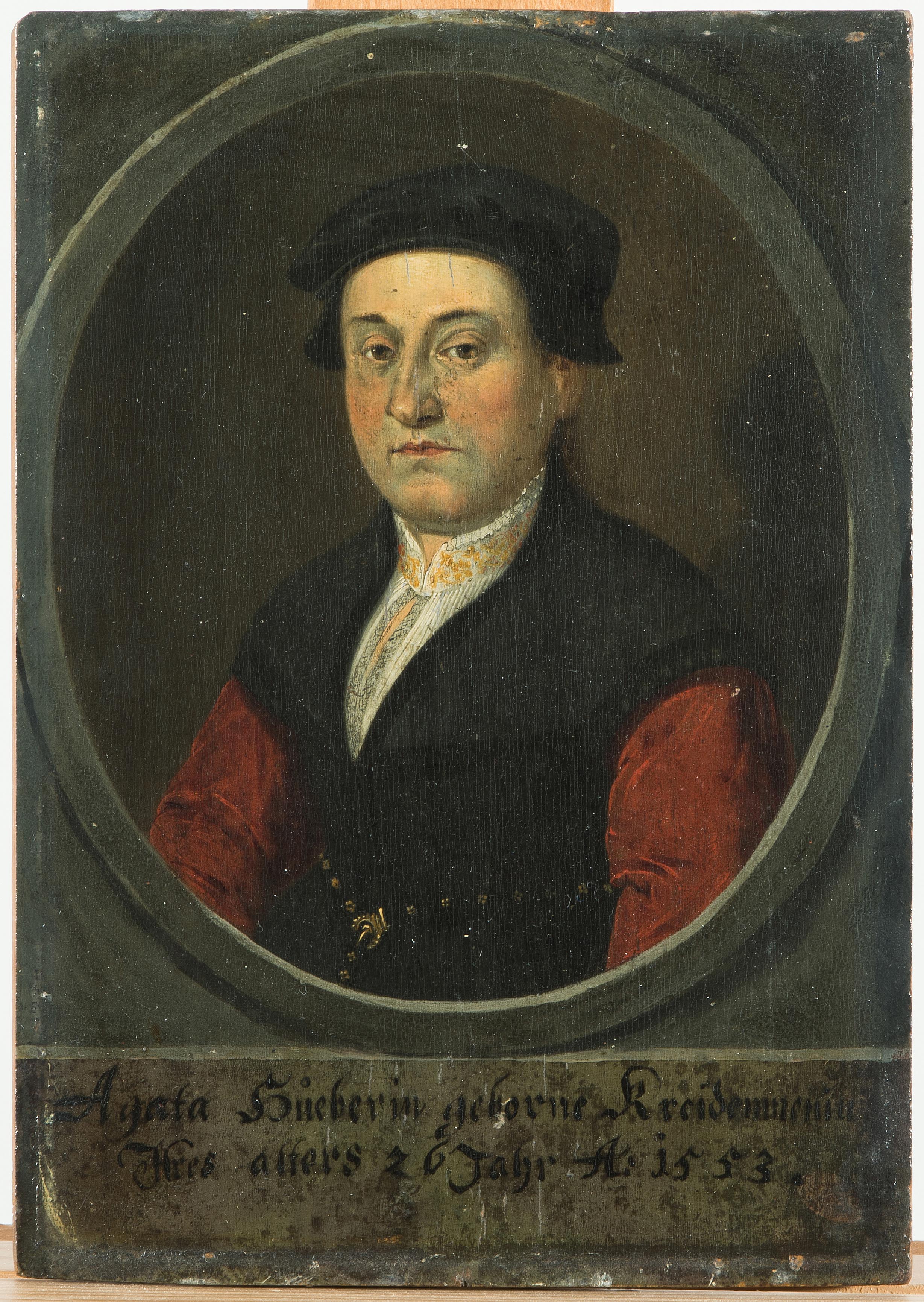 Gegenstücke. Portraits des Ehepaares "Johannes Oswald Huber seines alters 33 Jahr A° 1553". / "Agata Hueberin geborne Kreidenmenin Ihres alters 26 Jahr Ao 1553". Öl auf Holz. Je 21x15 cm. - Wohl Kopien nach Stichvorlagen des 16. Jh.