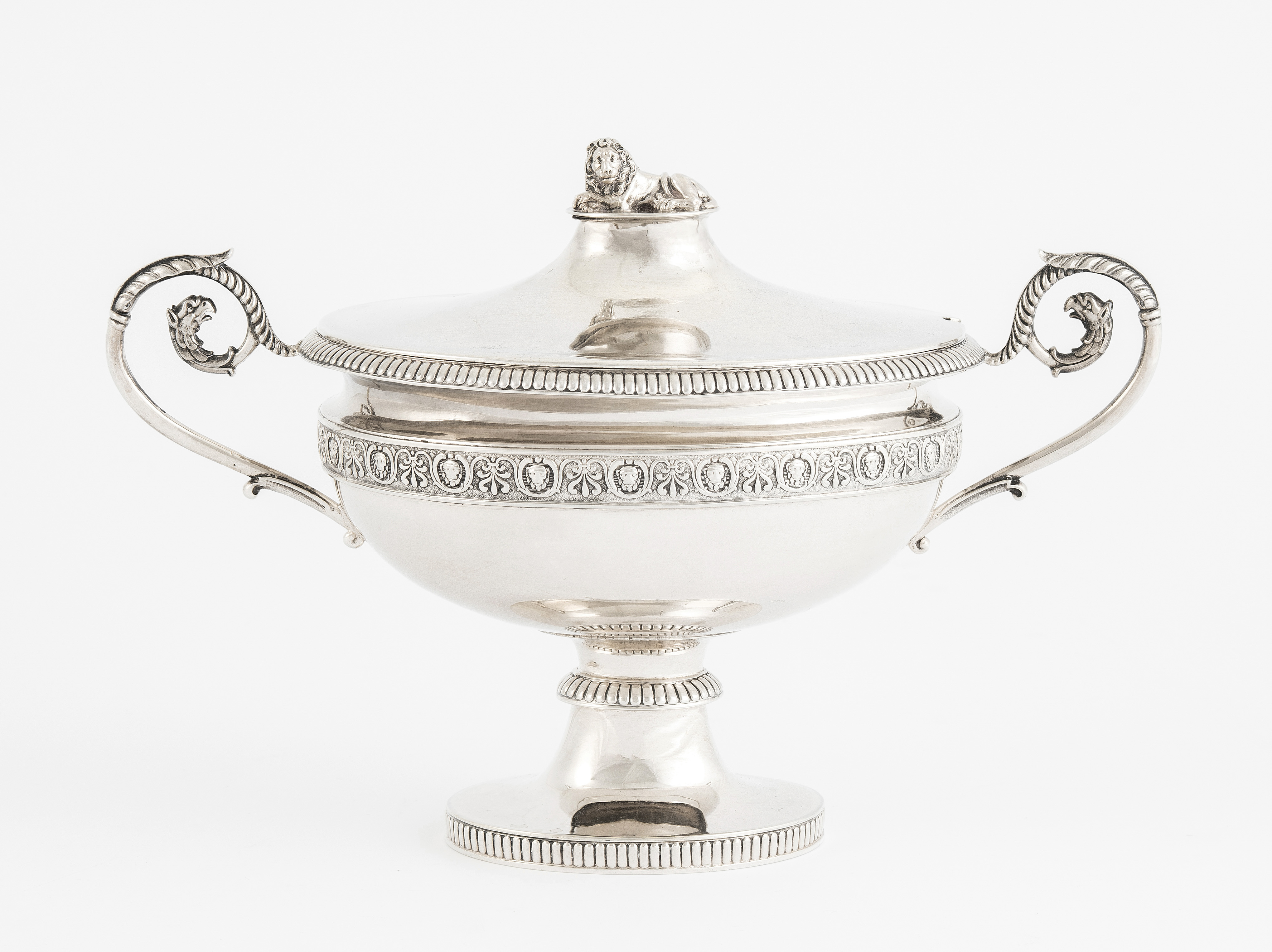 1820–30. Silber. Meistermarke Heinrich Schmid. Ovaler Korpus über eingezogenem Fuss, Henkel in Rocaillenform, leicht hochgezogener Deckel mit Löwen-Knauf. Abschlüsse gerippt, Wandung mit Palmettenbordüre alternierend mit Löwenköpfen. Meistermarke, Beizeichen. 22,7x16x10,4 cm, ca. 377 g.
