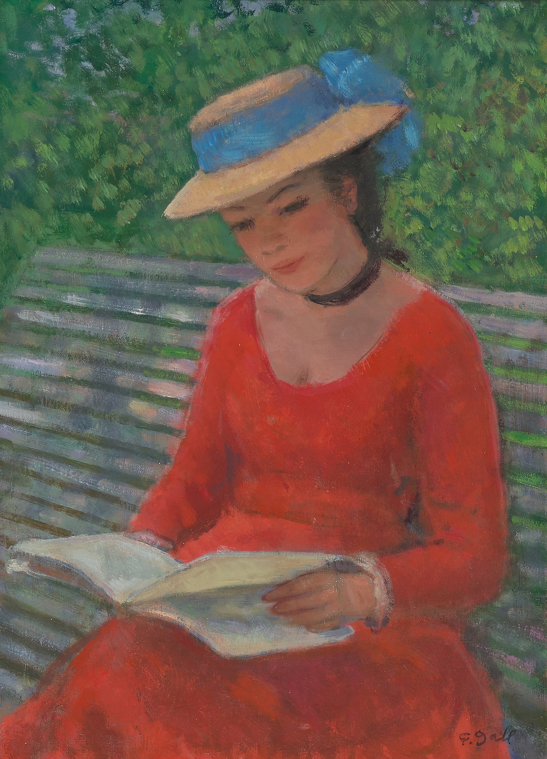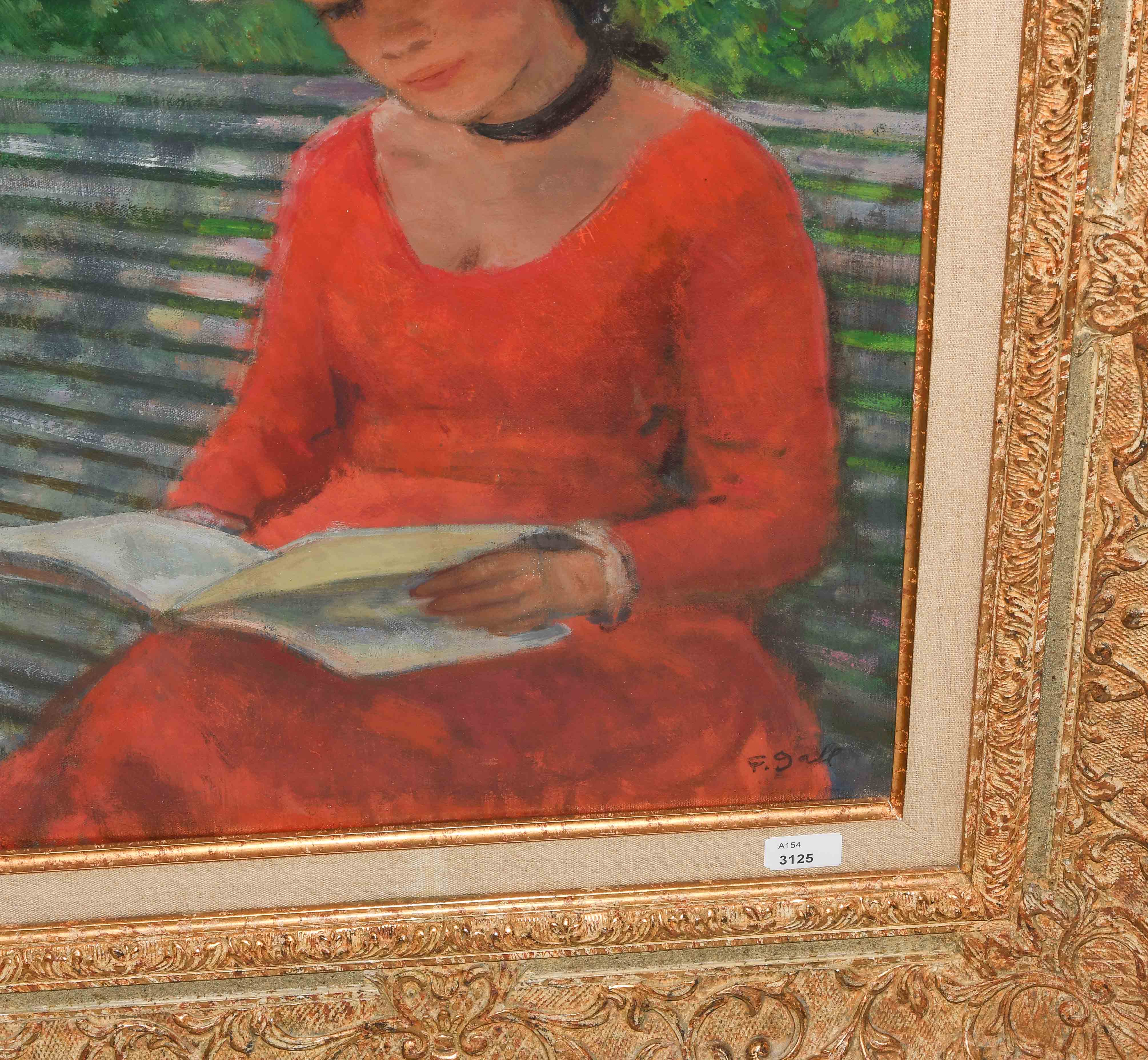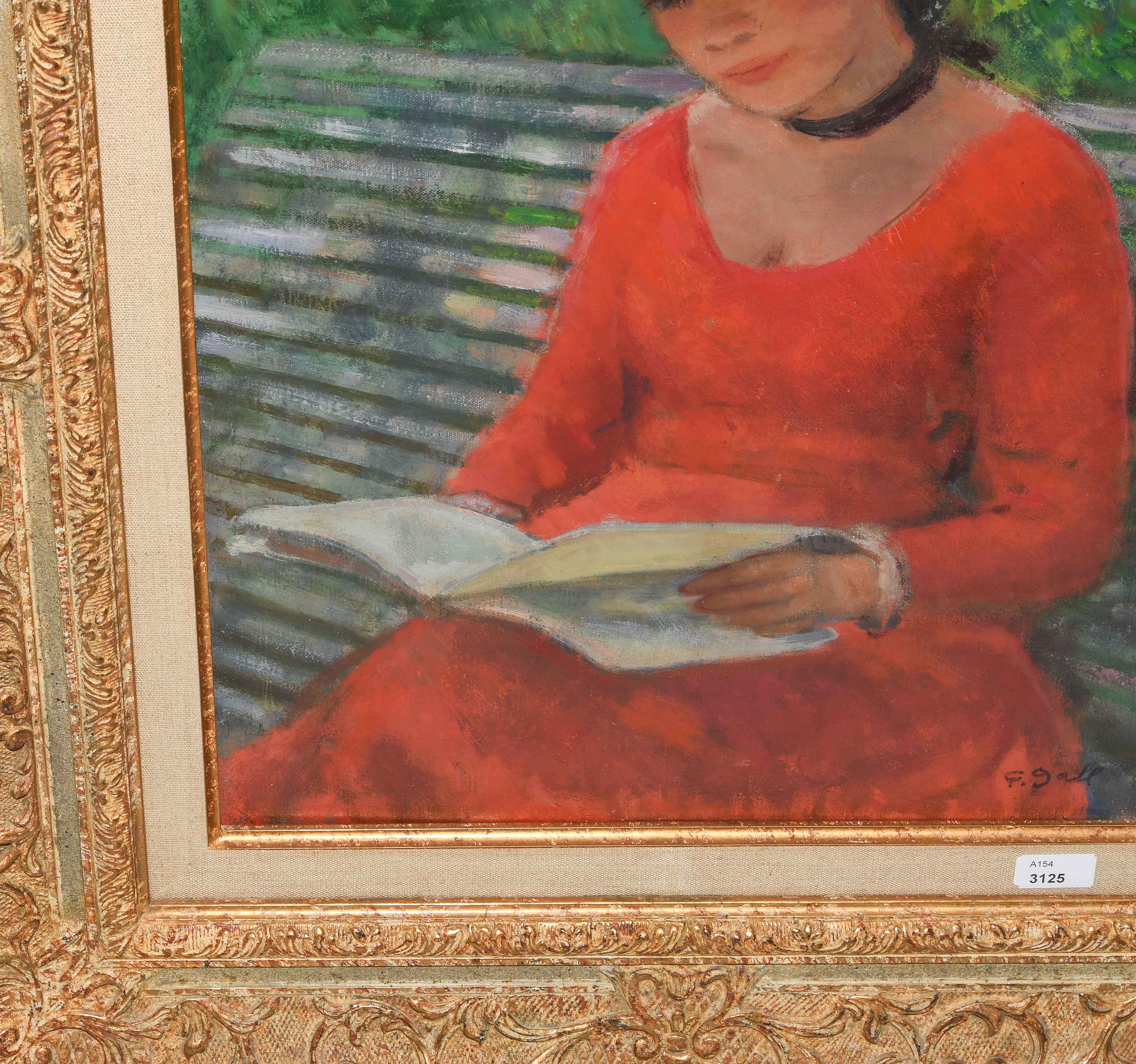 "Elizabeth-Anne, lecture sur le banc du jardin". Um 1978. Öl auf Leinwand. Unten rechts signiert. 46,3x33,3 cm.