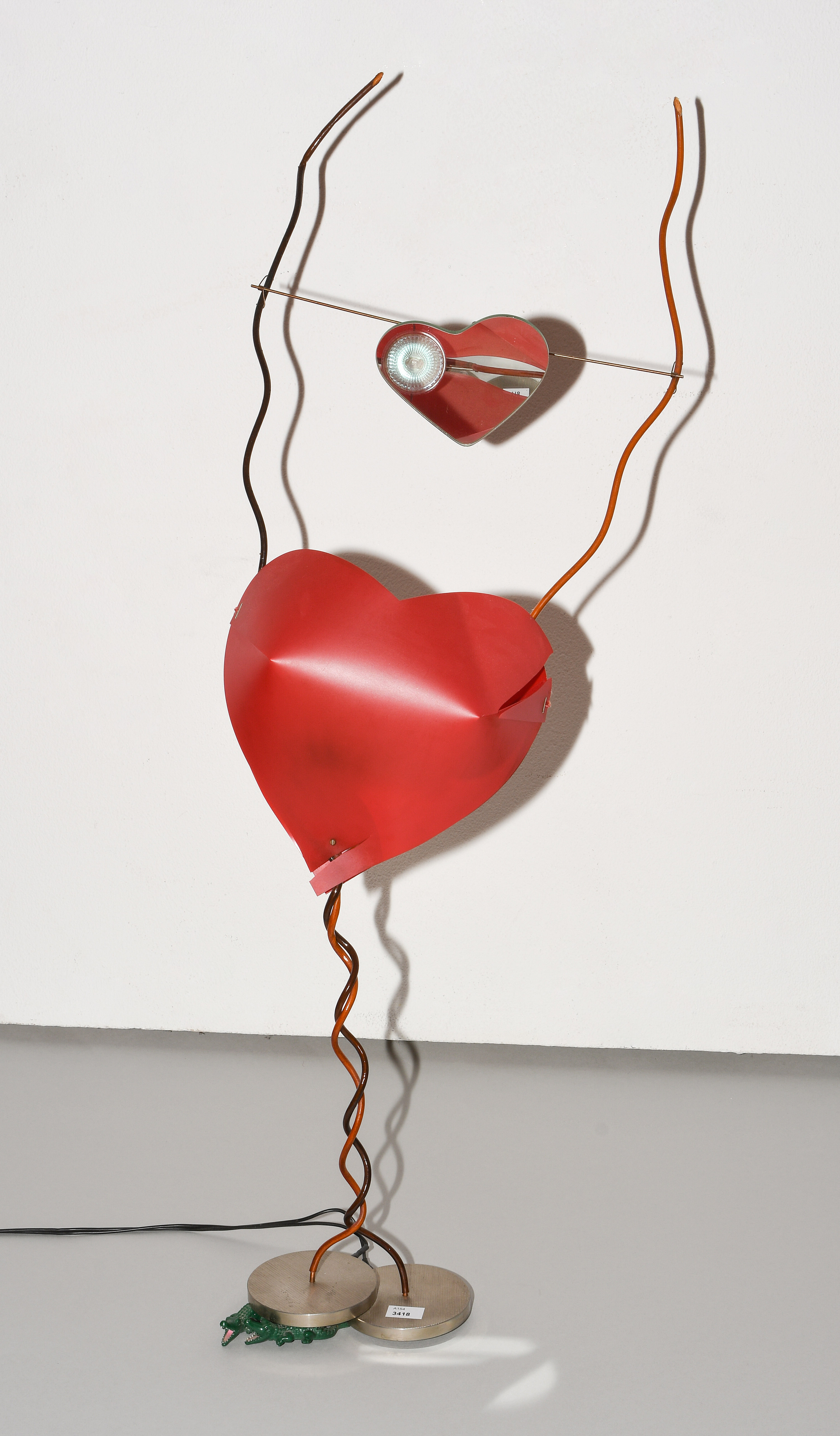 Tischlampe "One from the heart". Metall, Glas, Kunststoff rot. Mit Dimmer. H 83 cm.