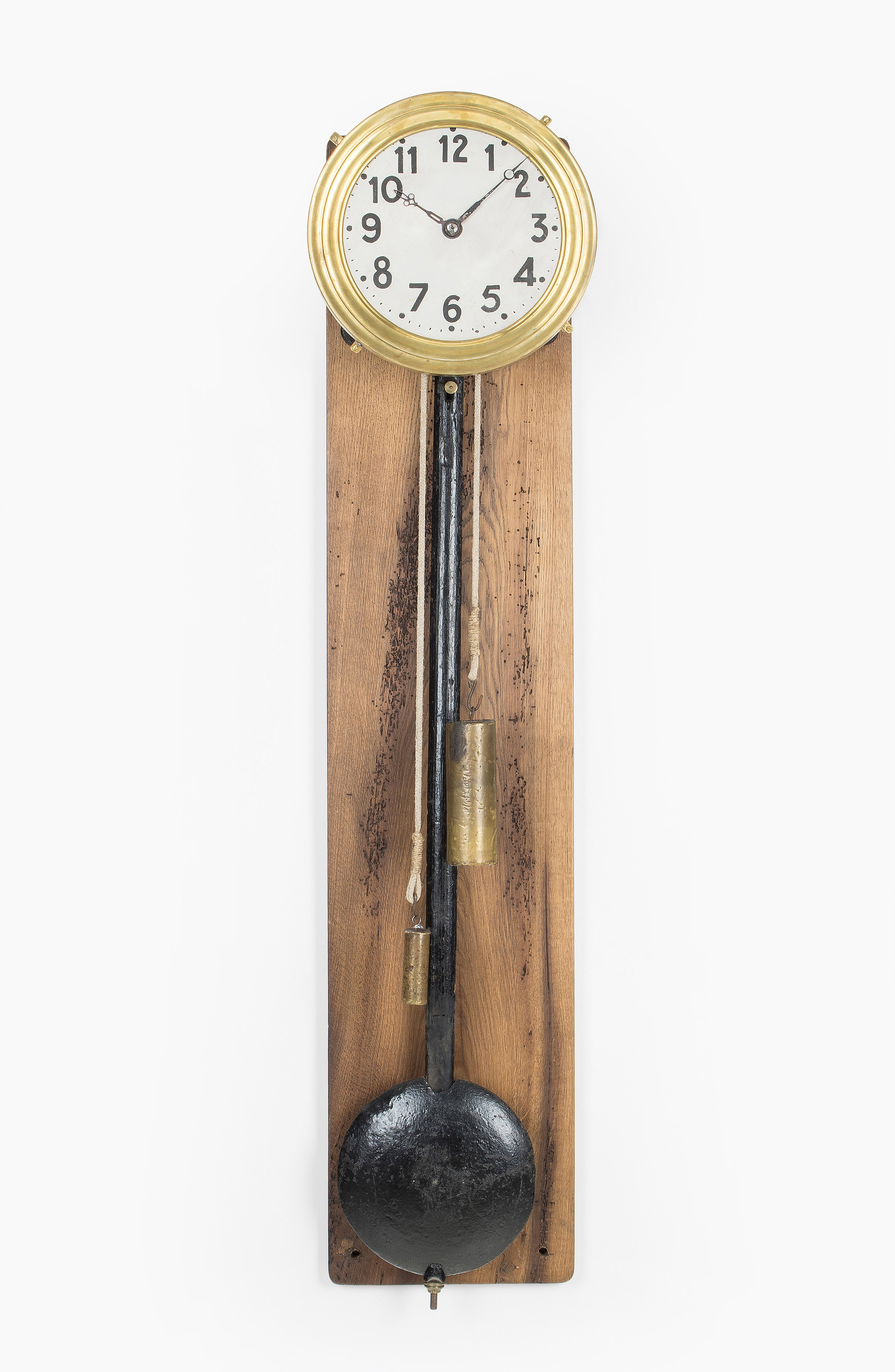 Wohl Frankreich um 1900. Der massive Uhrenträger ist auf einem braunen Holzbrett befestigt. Zinnfarbenes Blechzifferblatt in Messinglünette mit arabischen Zahlen. Massives Messingwerk mit seitlicher Scherenhemmung. Schwerer Hinterpendel an Federaufhängung. Seilzug mit messingummantelten Bleigewichten. Gehfähig. 122x29 cm. Zubehör für zweites Zifferwerk beigegeben.