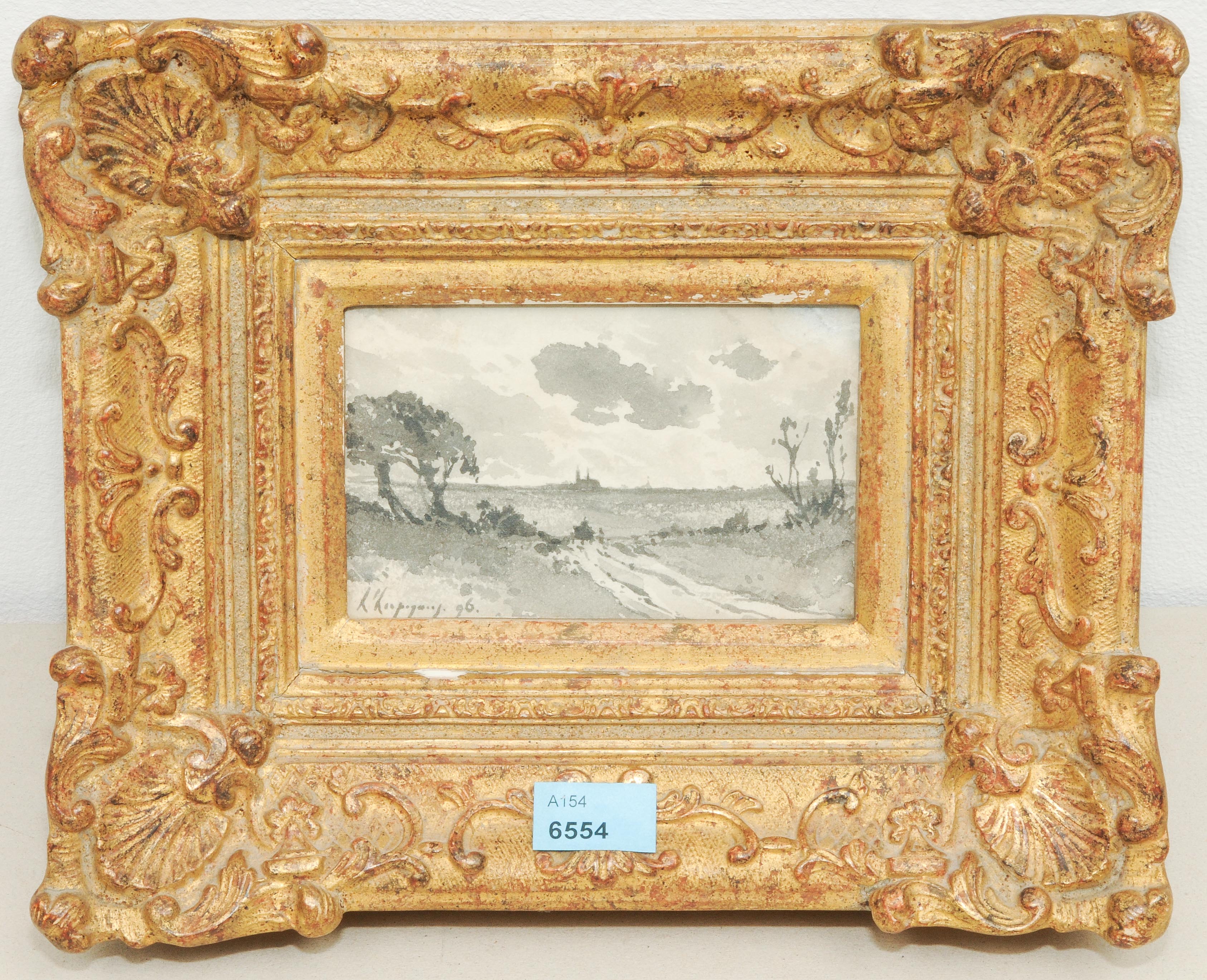 Weite Landschaft, am Horizont die Dächer einer Stadt. Grisaille, 1896. Unten links signiert und datiert. 6,5x10,7 cm. Gerahmt.