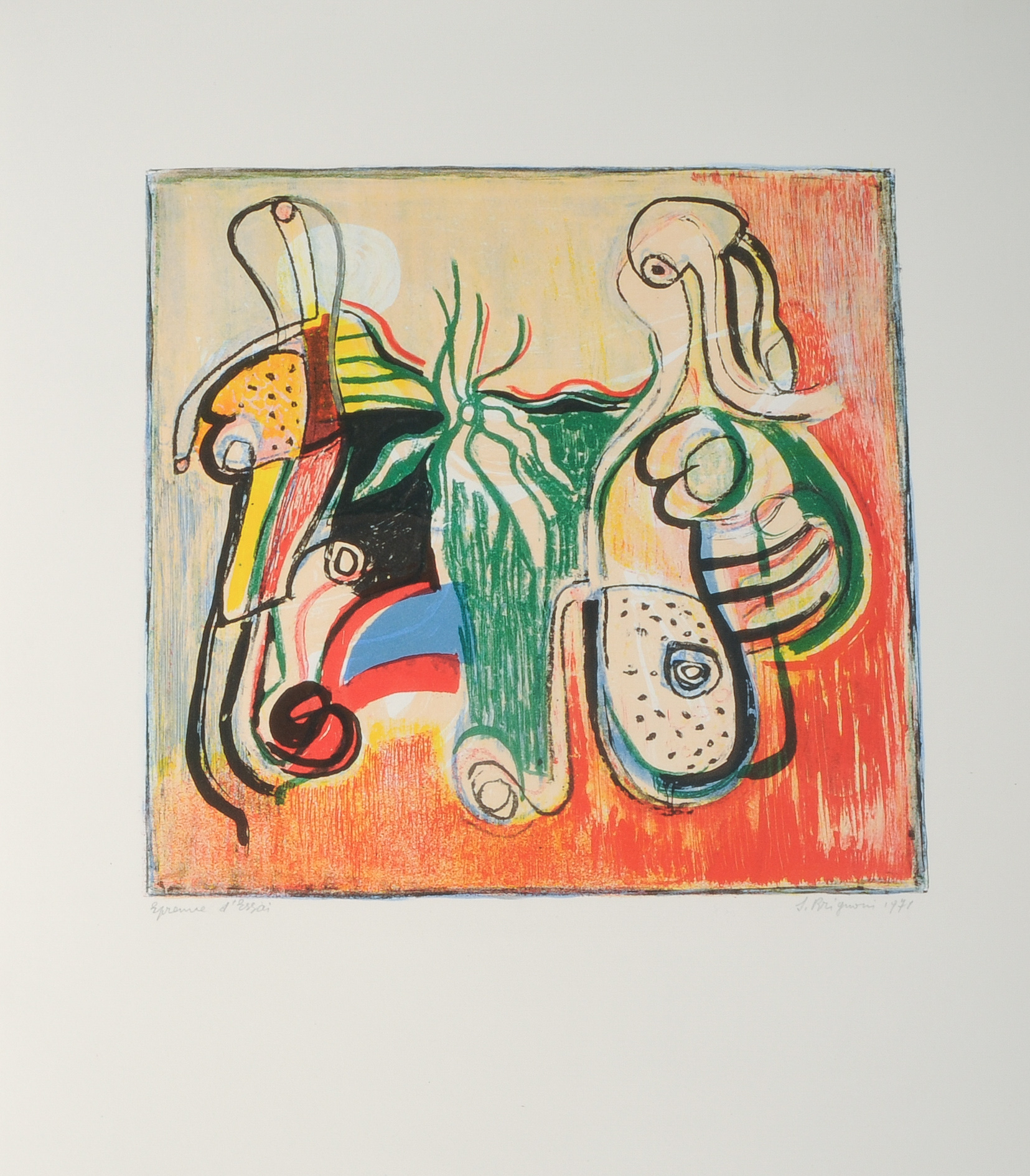 Ohne Titel. Figuren. 1971. Farblithographie. Epreuve d'Essai. Unten rechts signiert und datiert. Blattgrösse 66x50 cm.