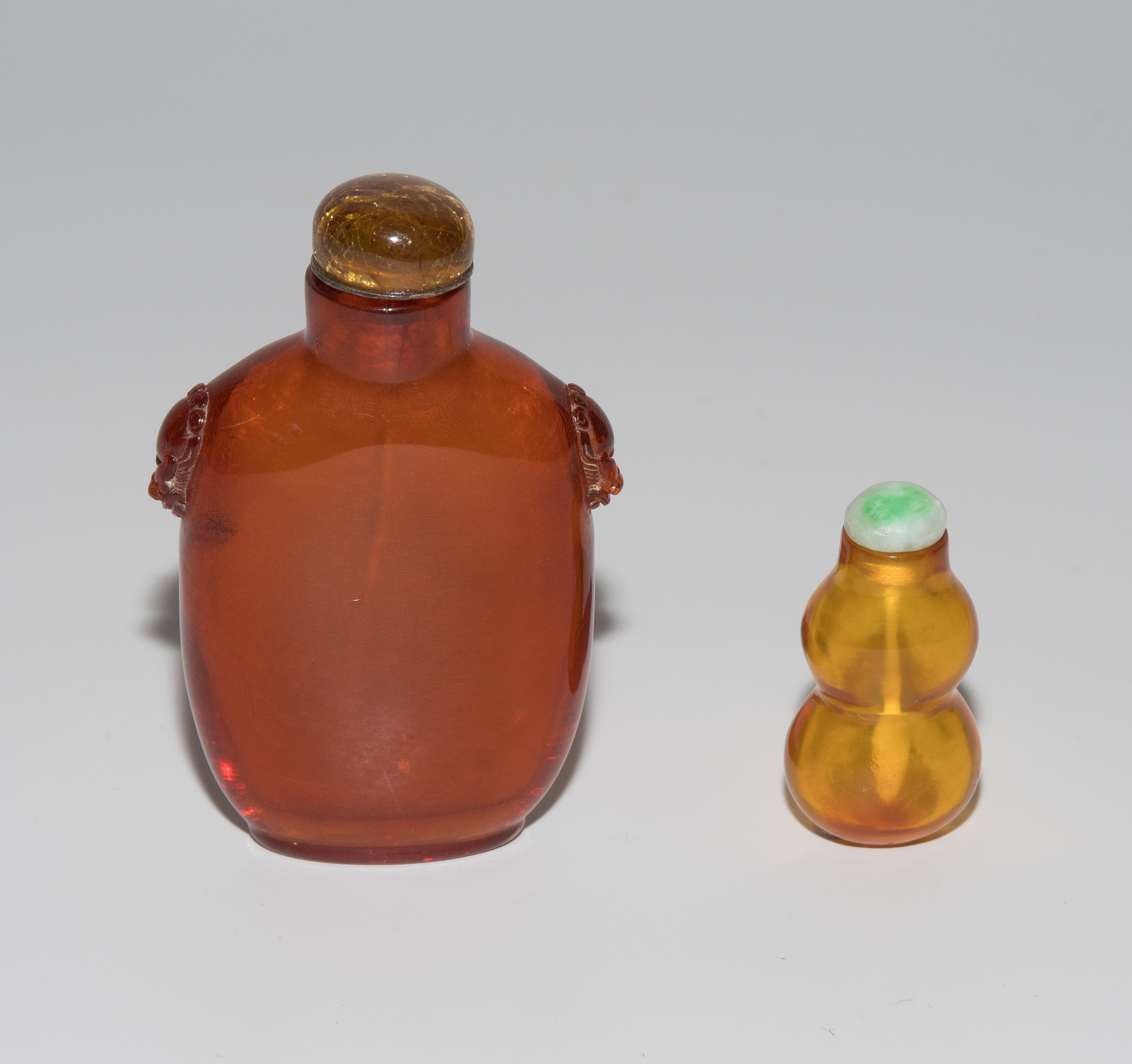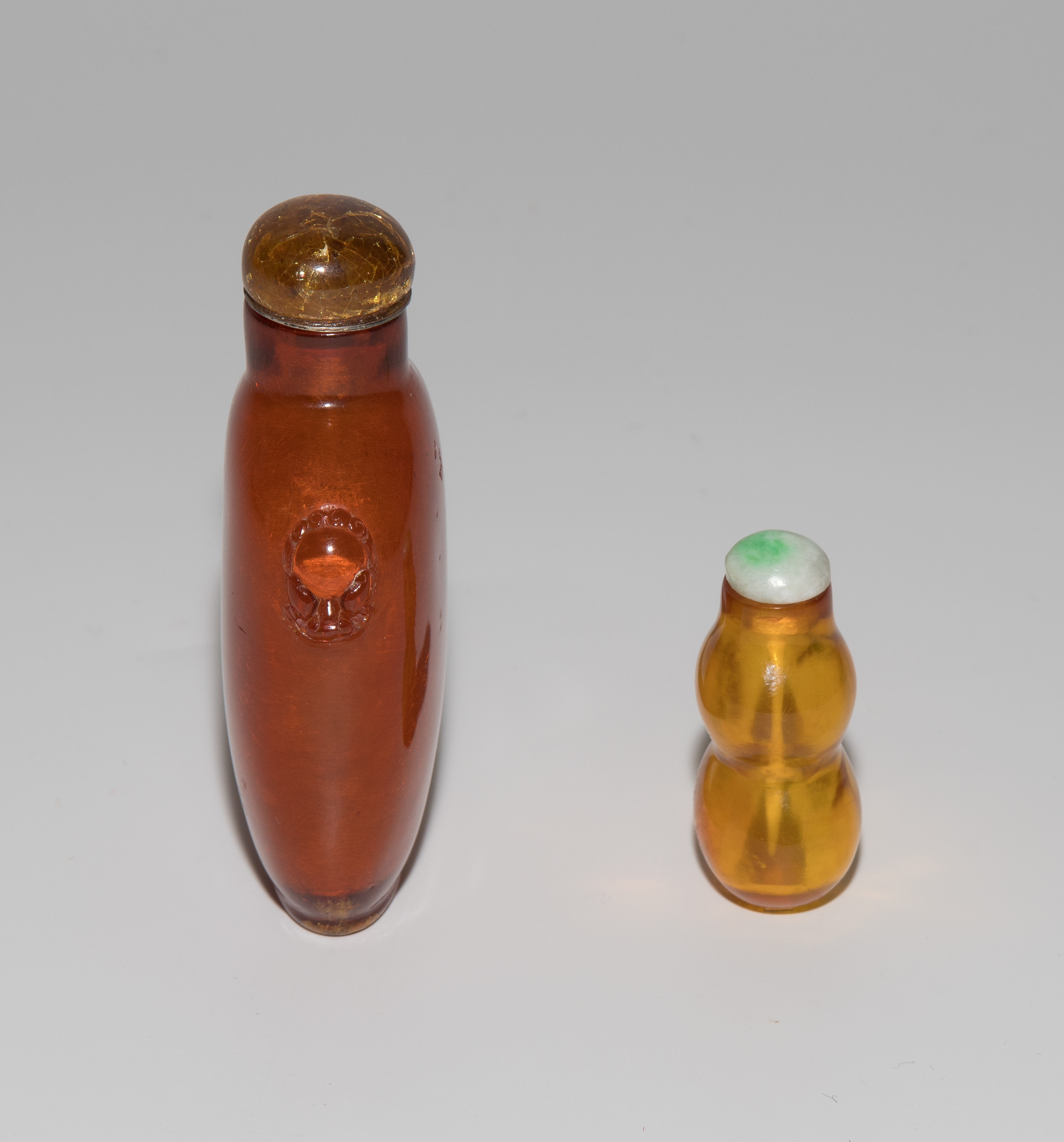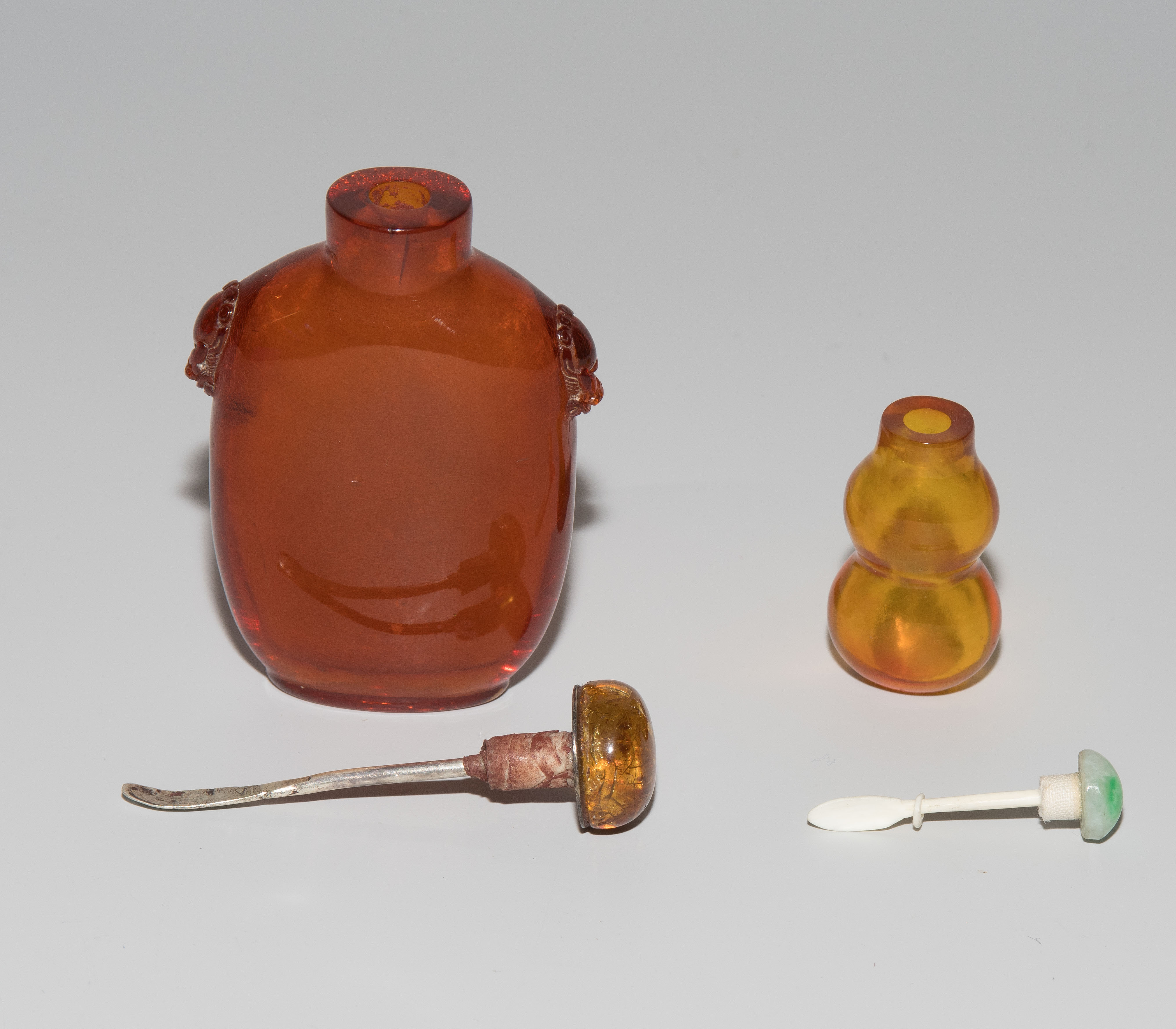 China, 20.Jh. Kalebassenform. Löffel aus Elfenbein mit beweglichem Ring. H 4 cm. / Seitlich reliefierte Makarakopfhenkel. H 7 cm.