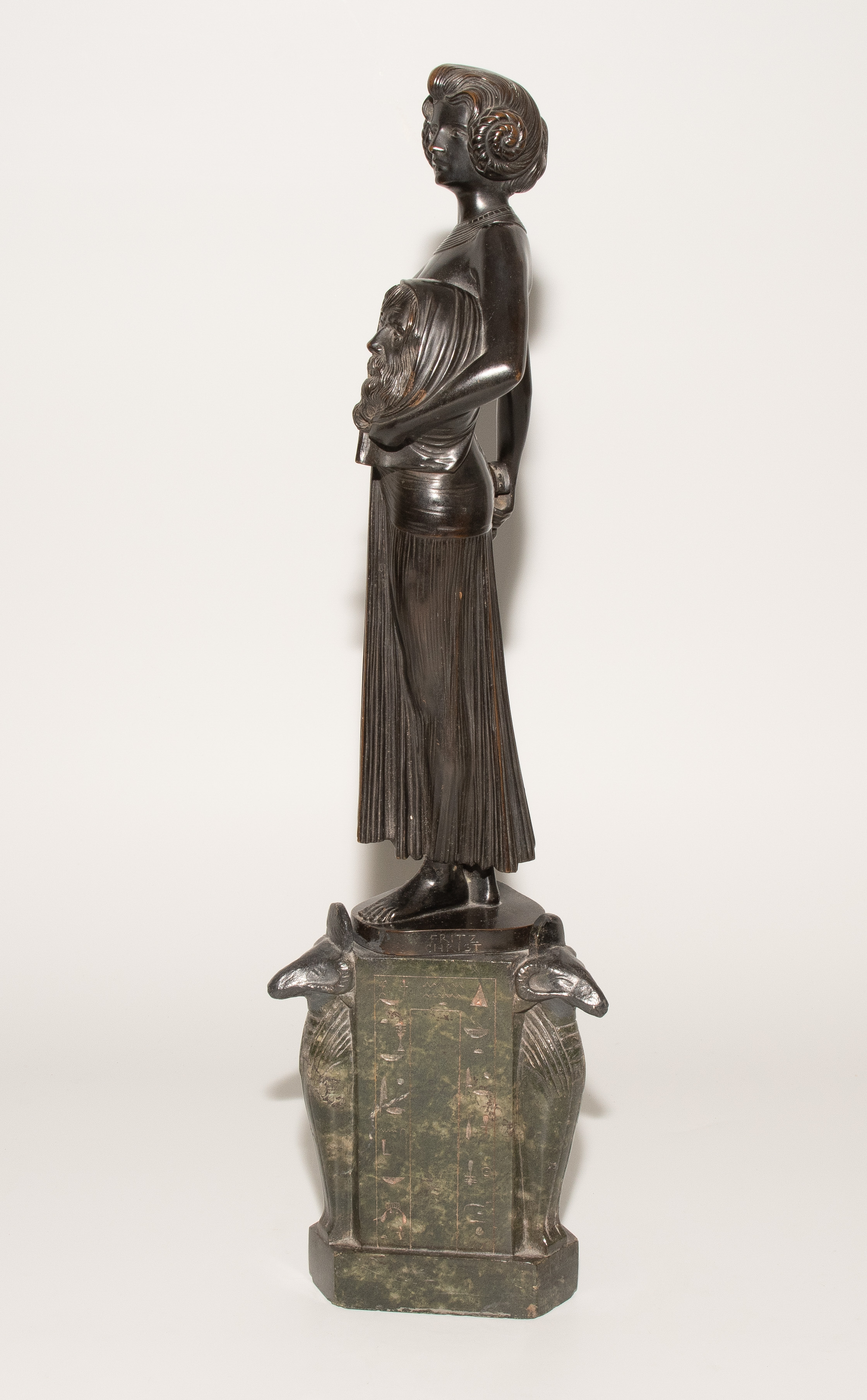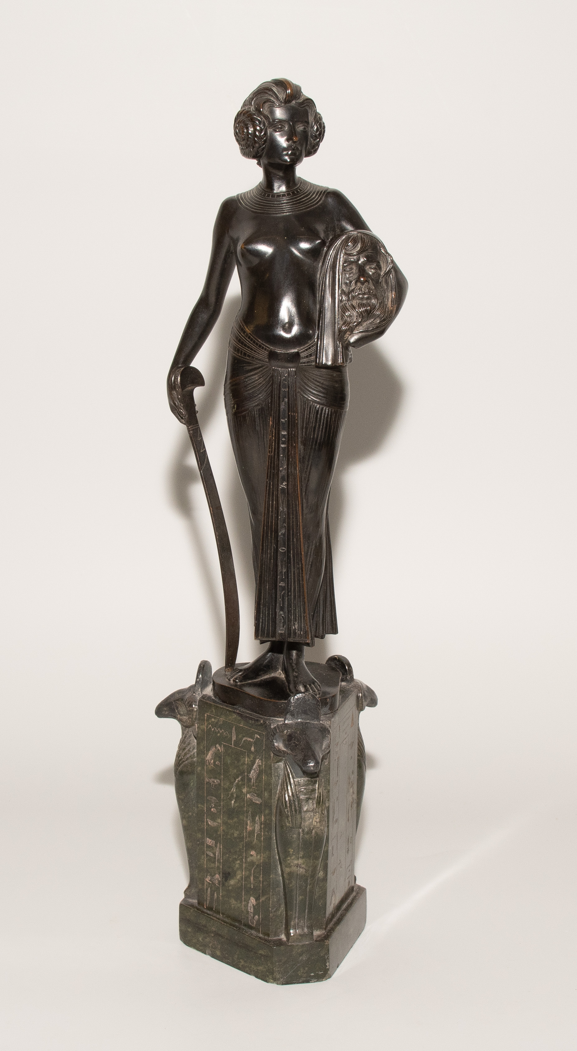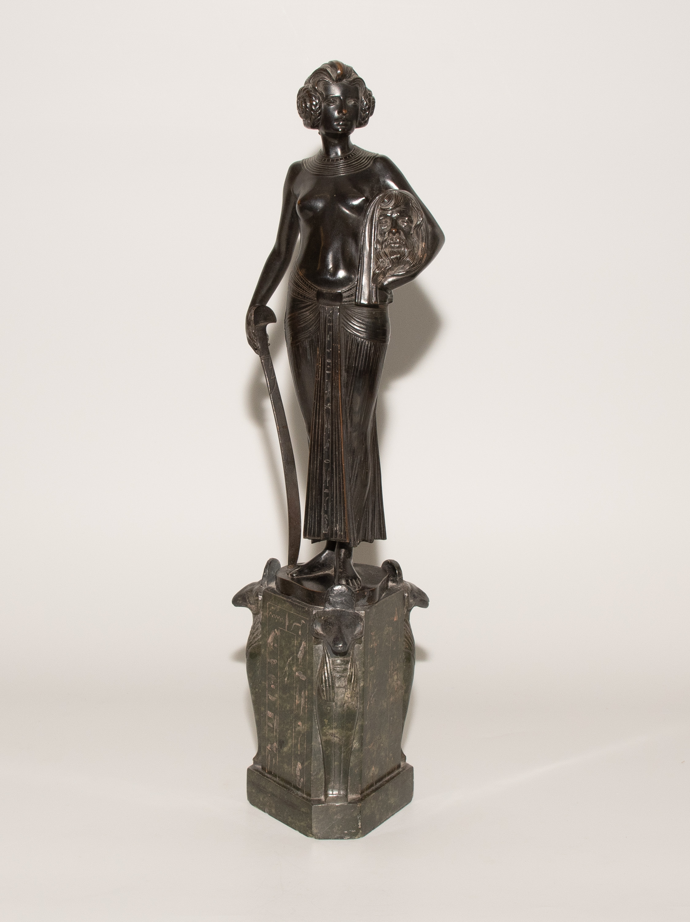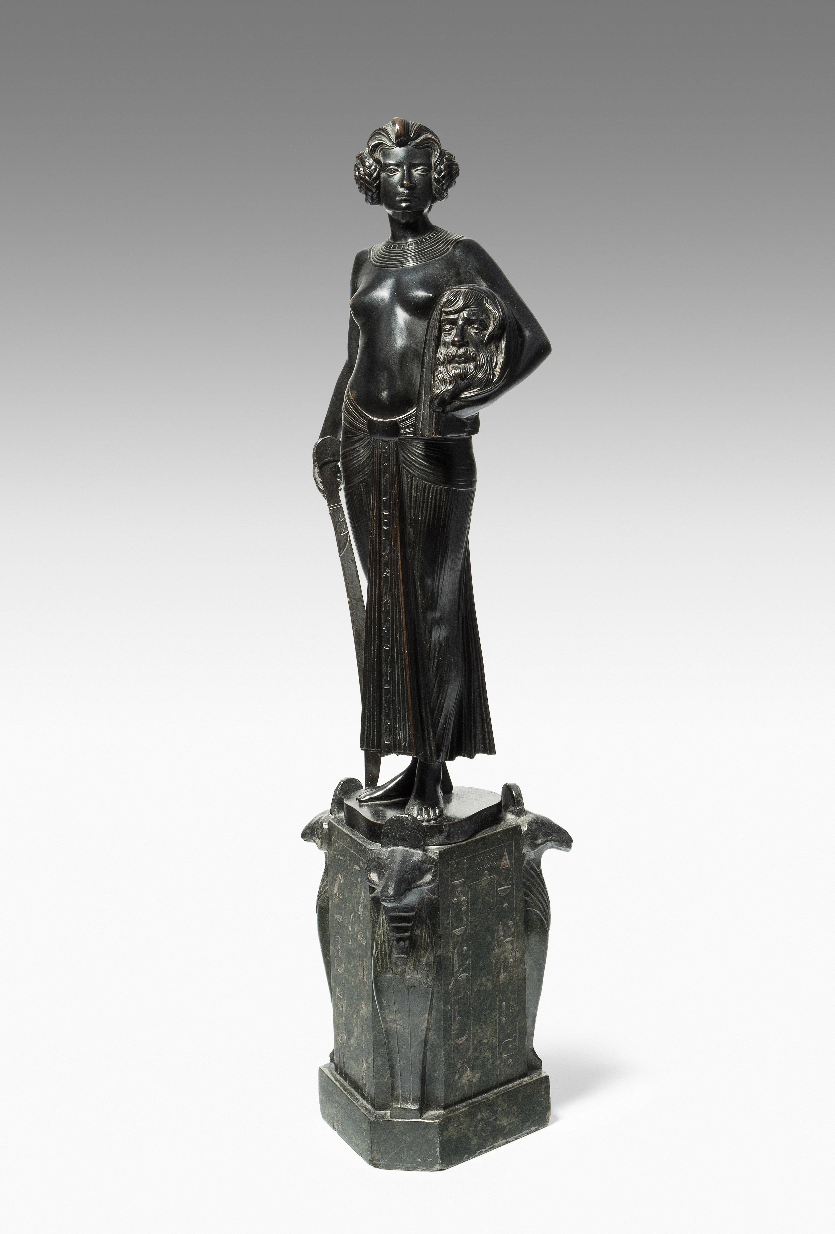 "Judith". Um 1900. Bronze, schwarzbraun patiniert, auf sechseckigem Steinsockel mit Hieroglyphen und Widdergottheit an den drei Schmalseiten. Auf der Bronze bezeichnet: FRITZ CHRIST. H (mit Sockel): 46 cm.
