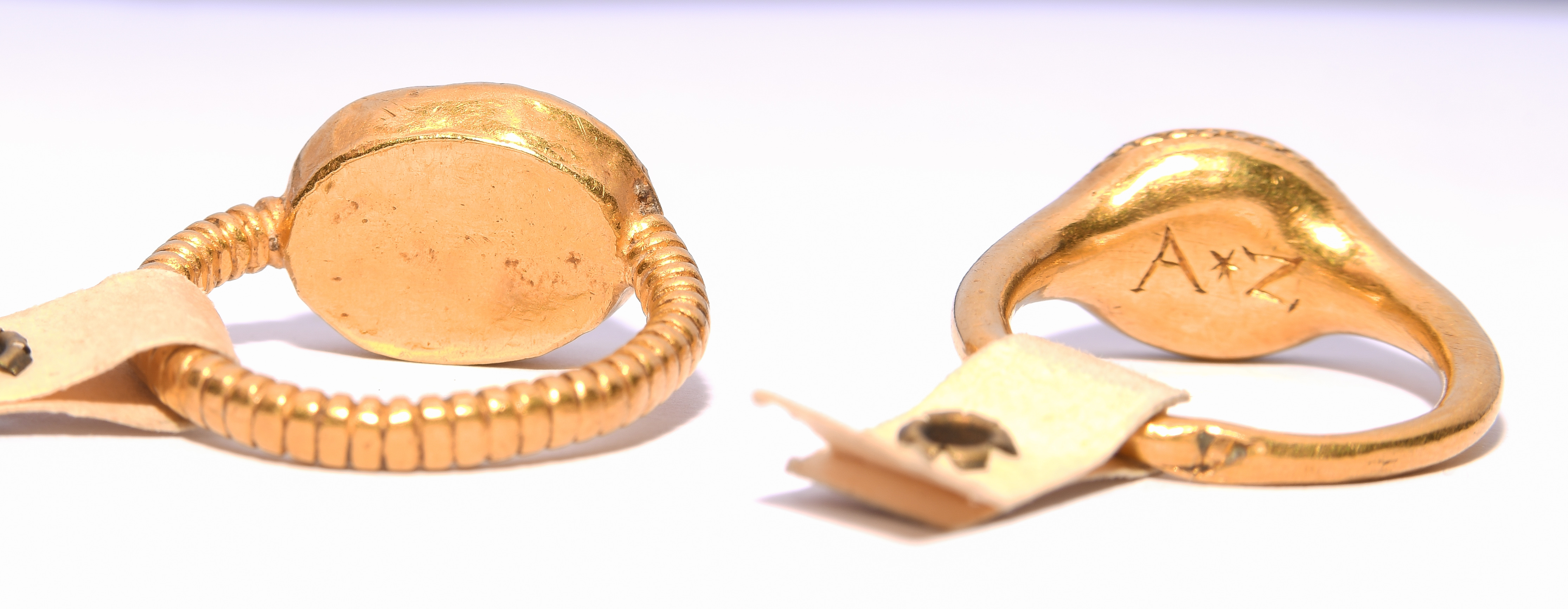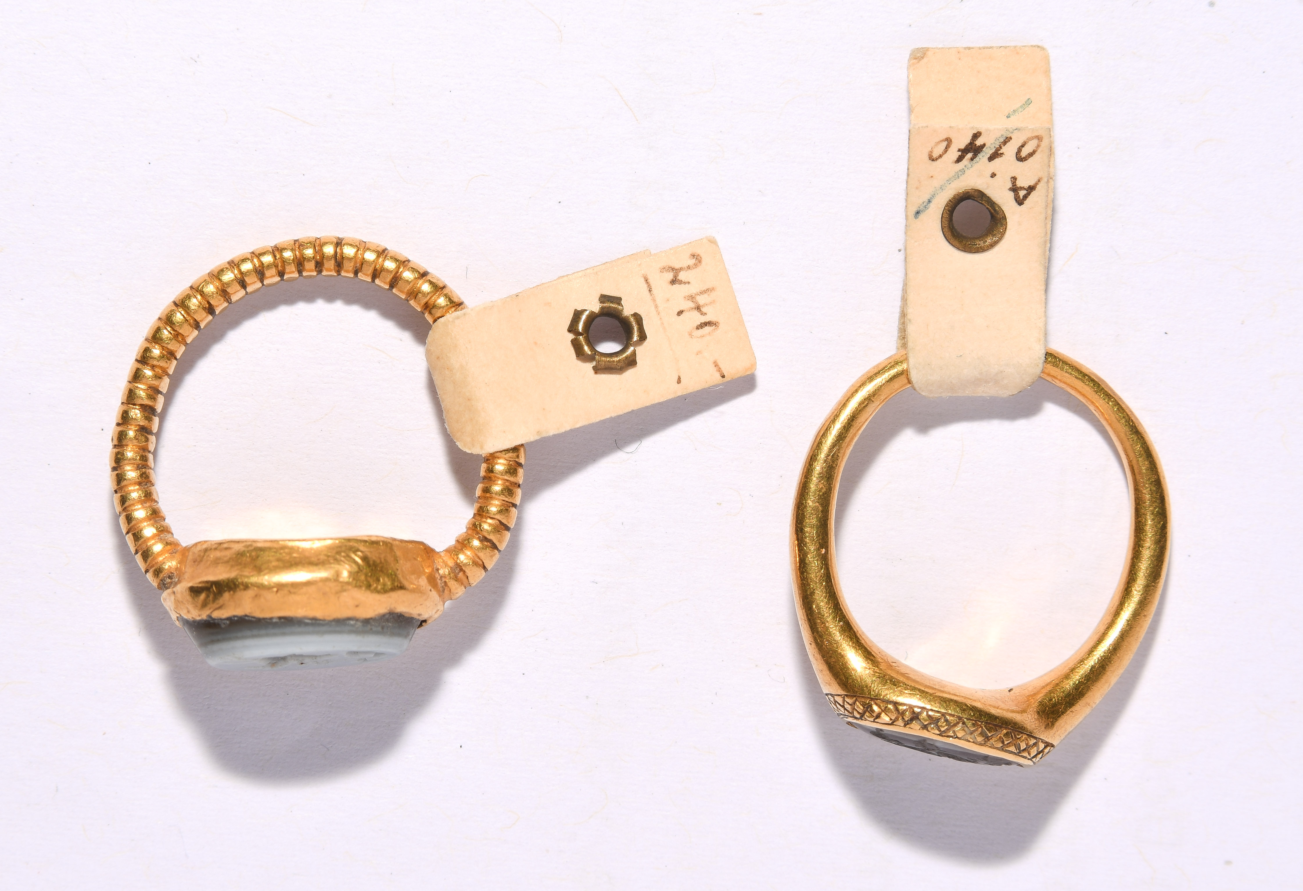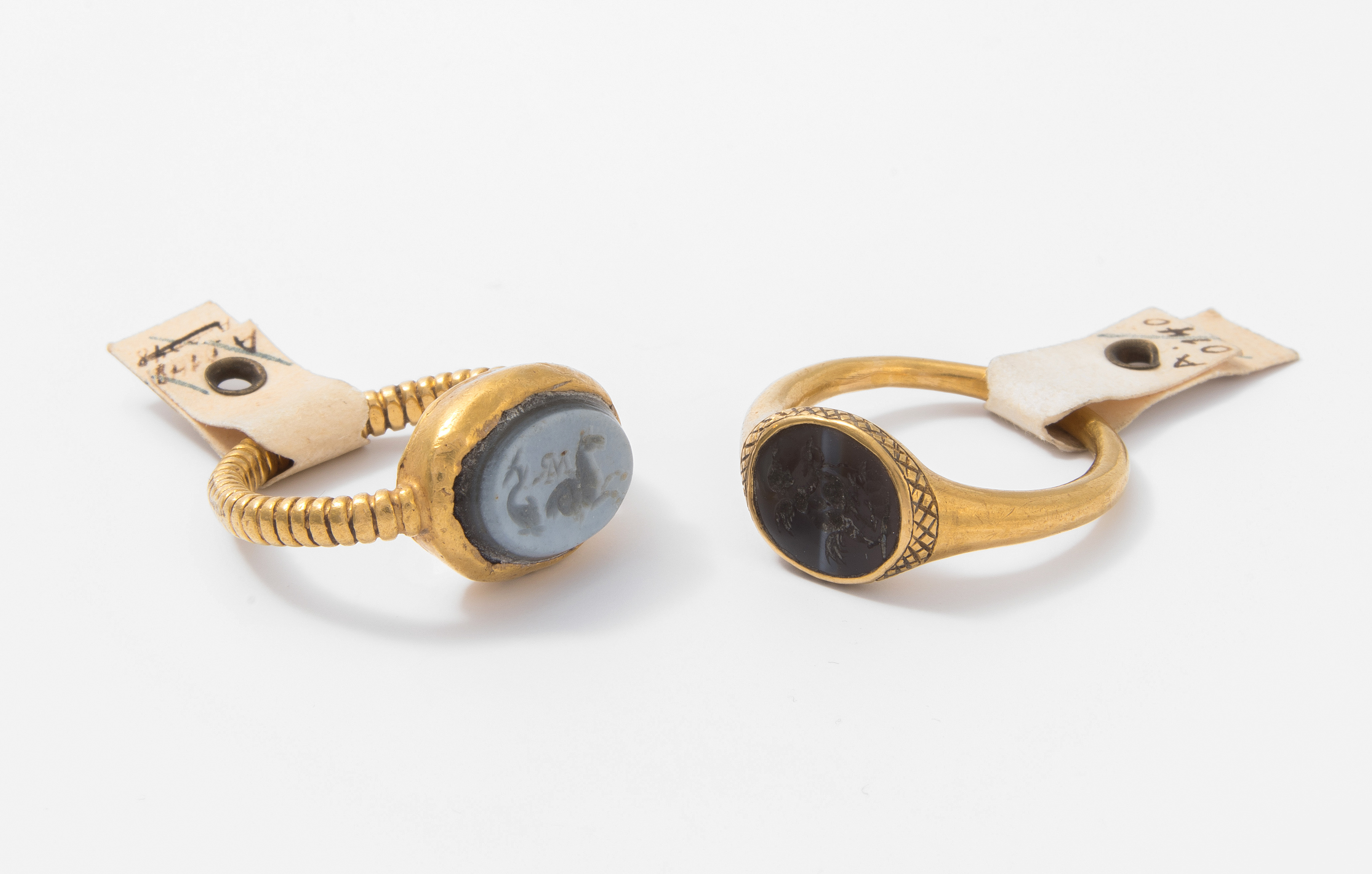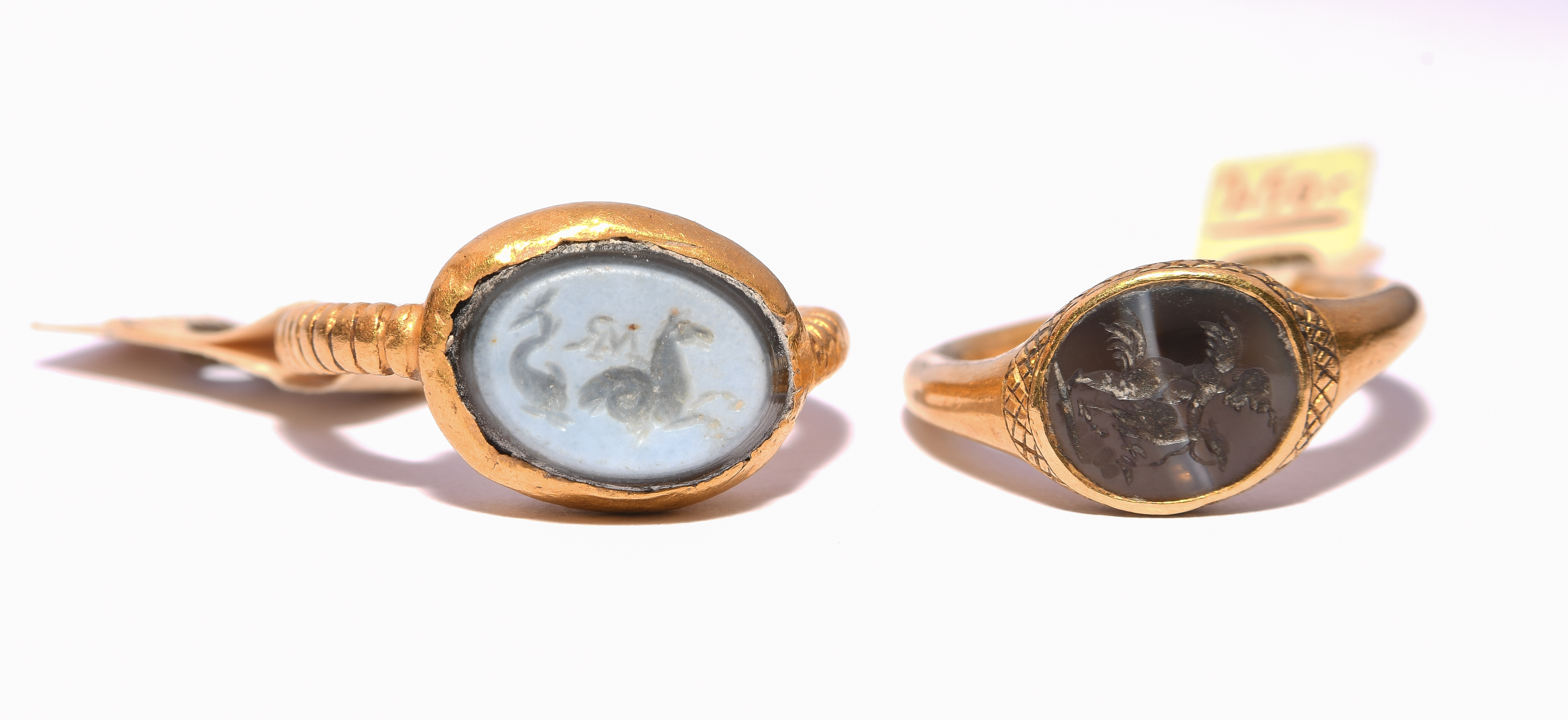 Feingold. Neuzeitlicher Goldring mit Rillen und Gemme aus Lagenachat. Vertieftes Siegelbild: Delphin und Pferd, im Zentrum ein Monogramm "MR". L 1,1 cm, ca. 6 g. / Neuzeitlicher Goldring mit Gemme aus Bandachat. Vertieftes Siegelbild: Eros. Rückseite mit Monogramm "A*Z". L 1 cm, ca. 3 g.