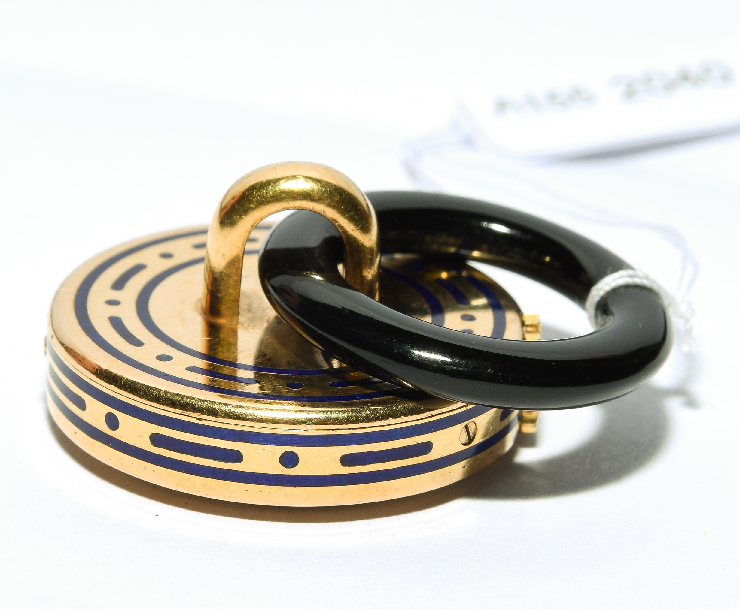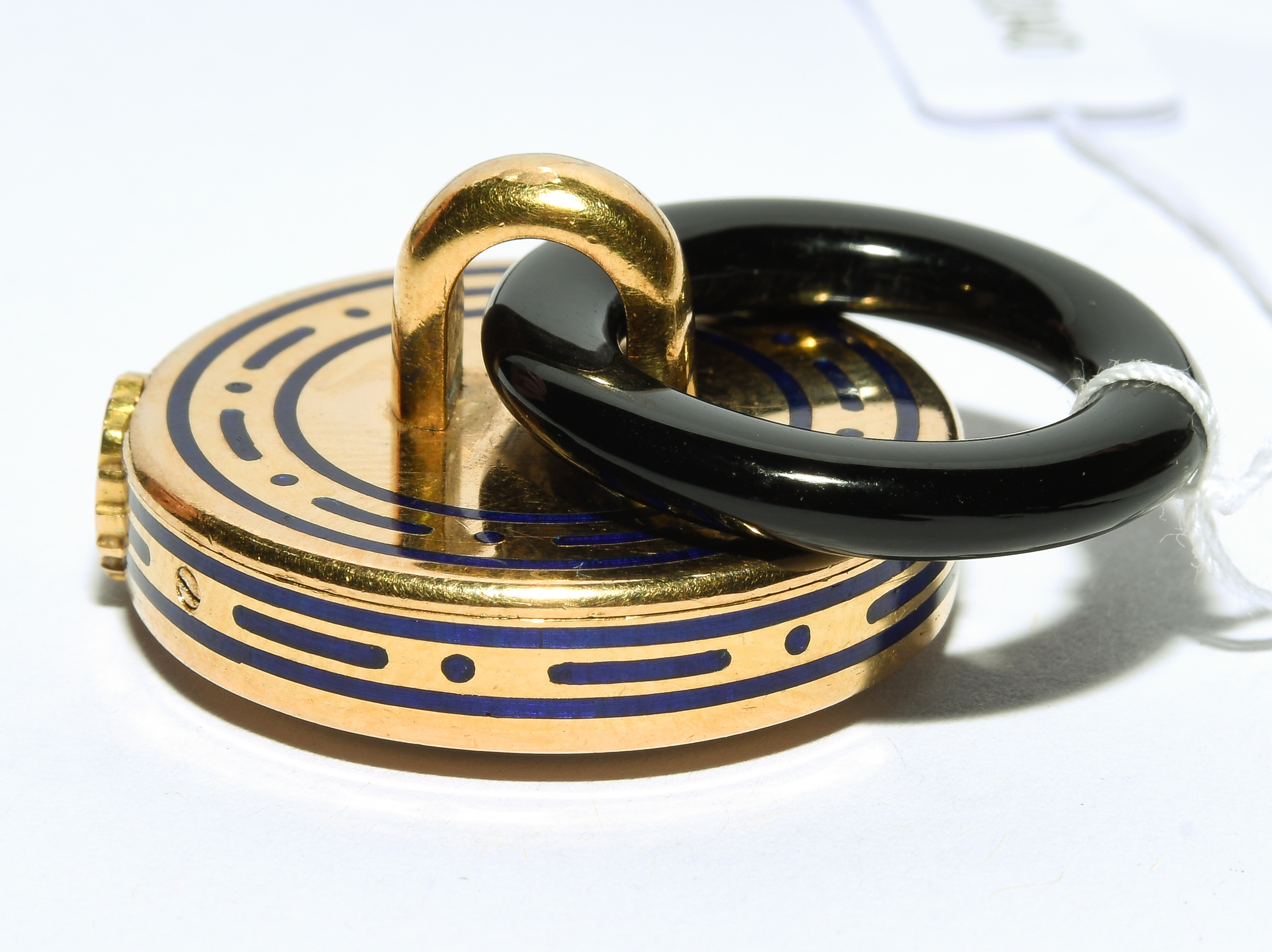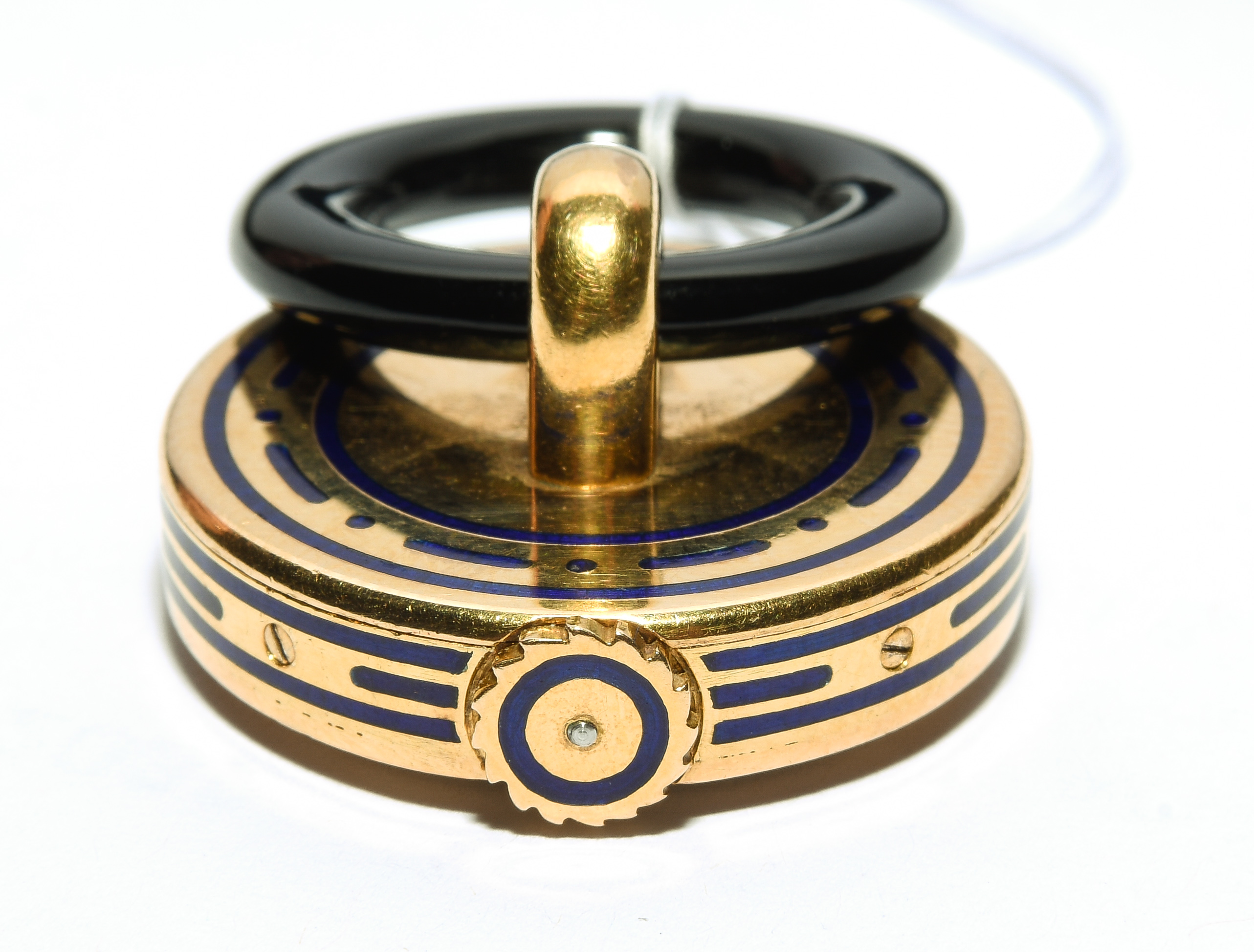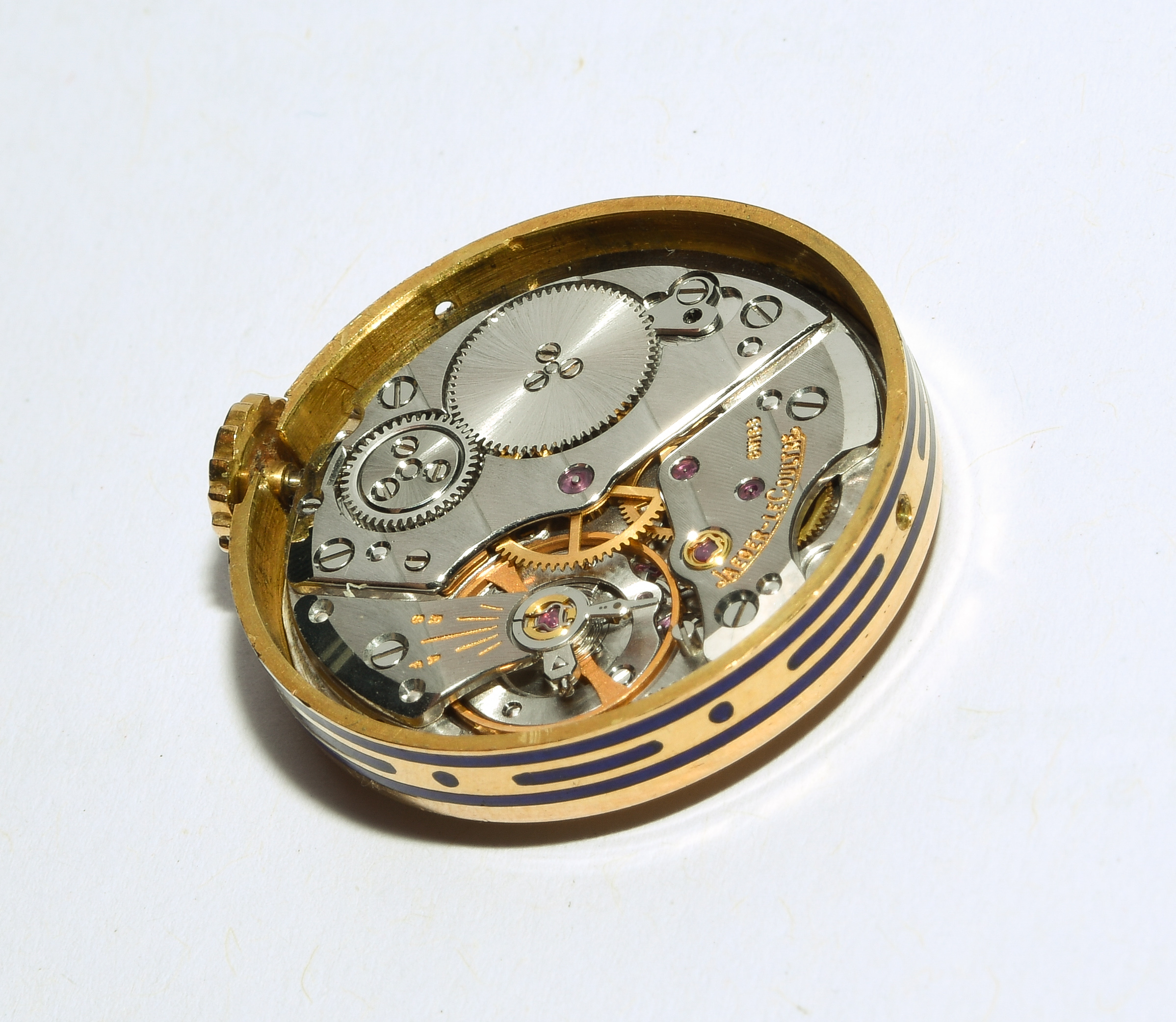750 Gelbgold. Jaeger LeCoultre Handaufzug, Werk Nr. 2209081. 22 cm. Cartier Zifferblatt. Gehäuse blau emailliert mit Onyxring. 16,8 g. Funktionstüchtig.