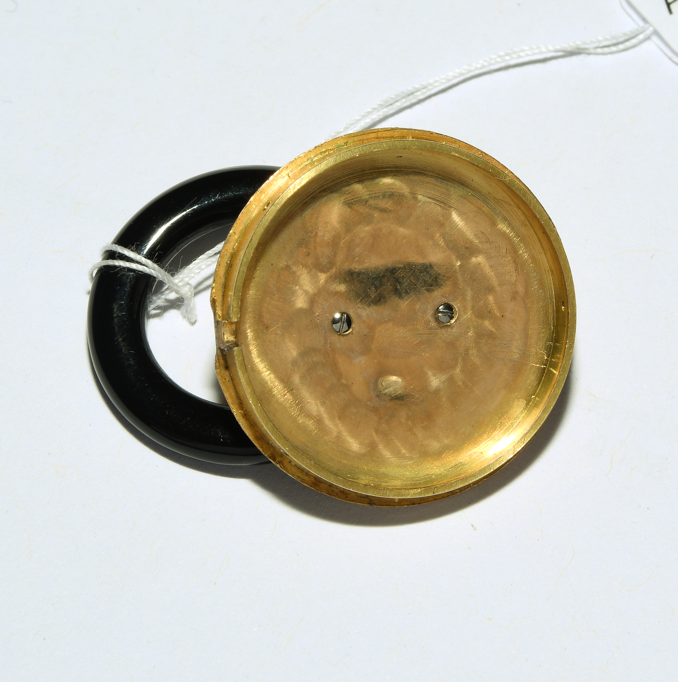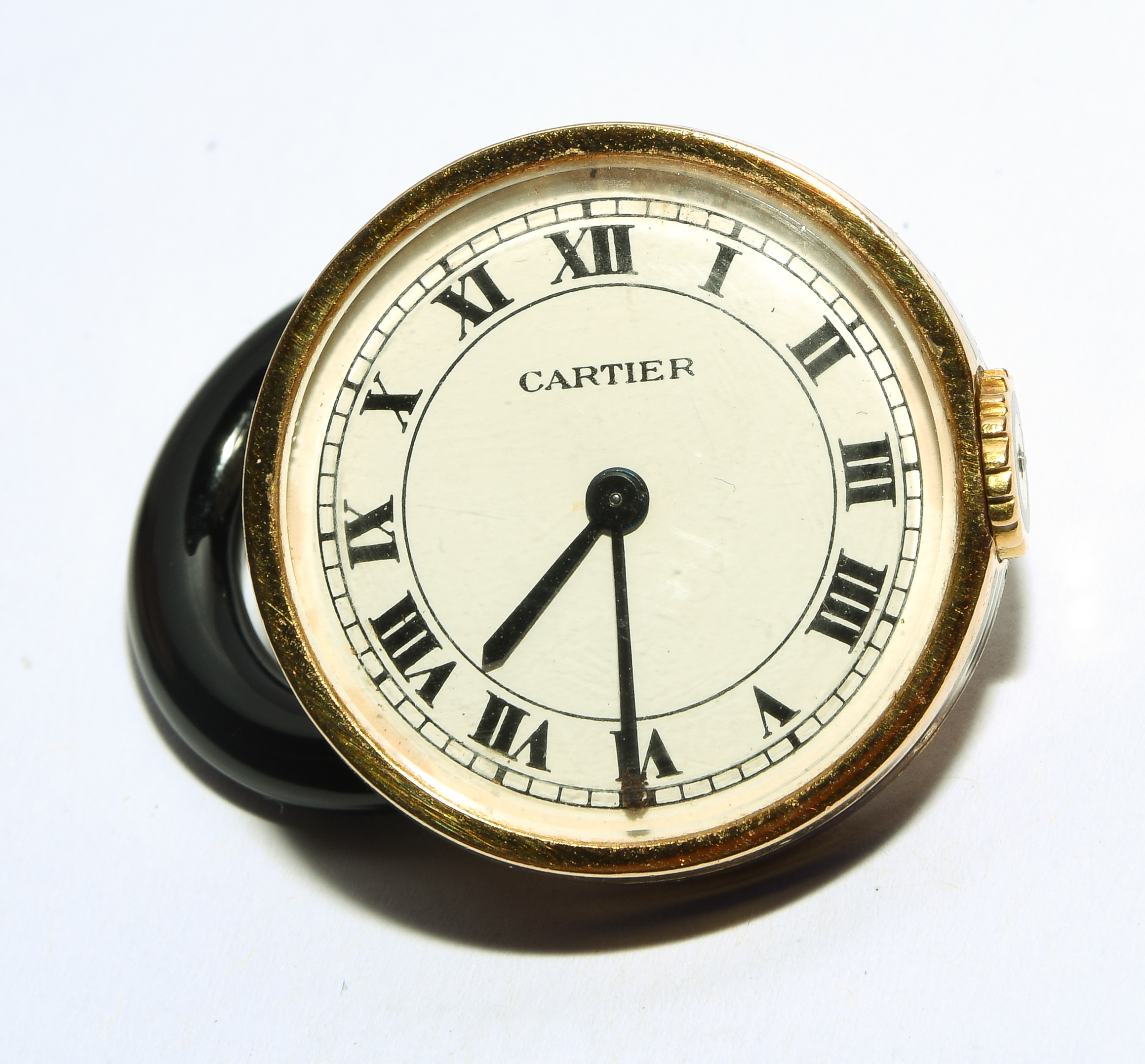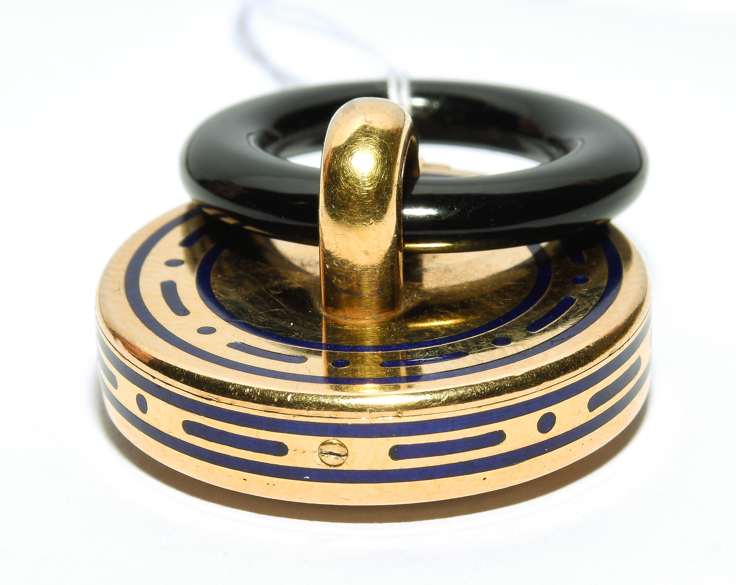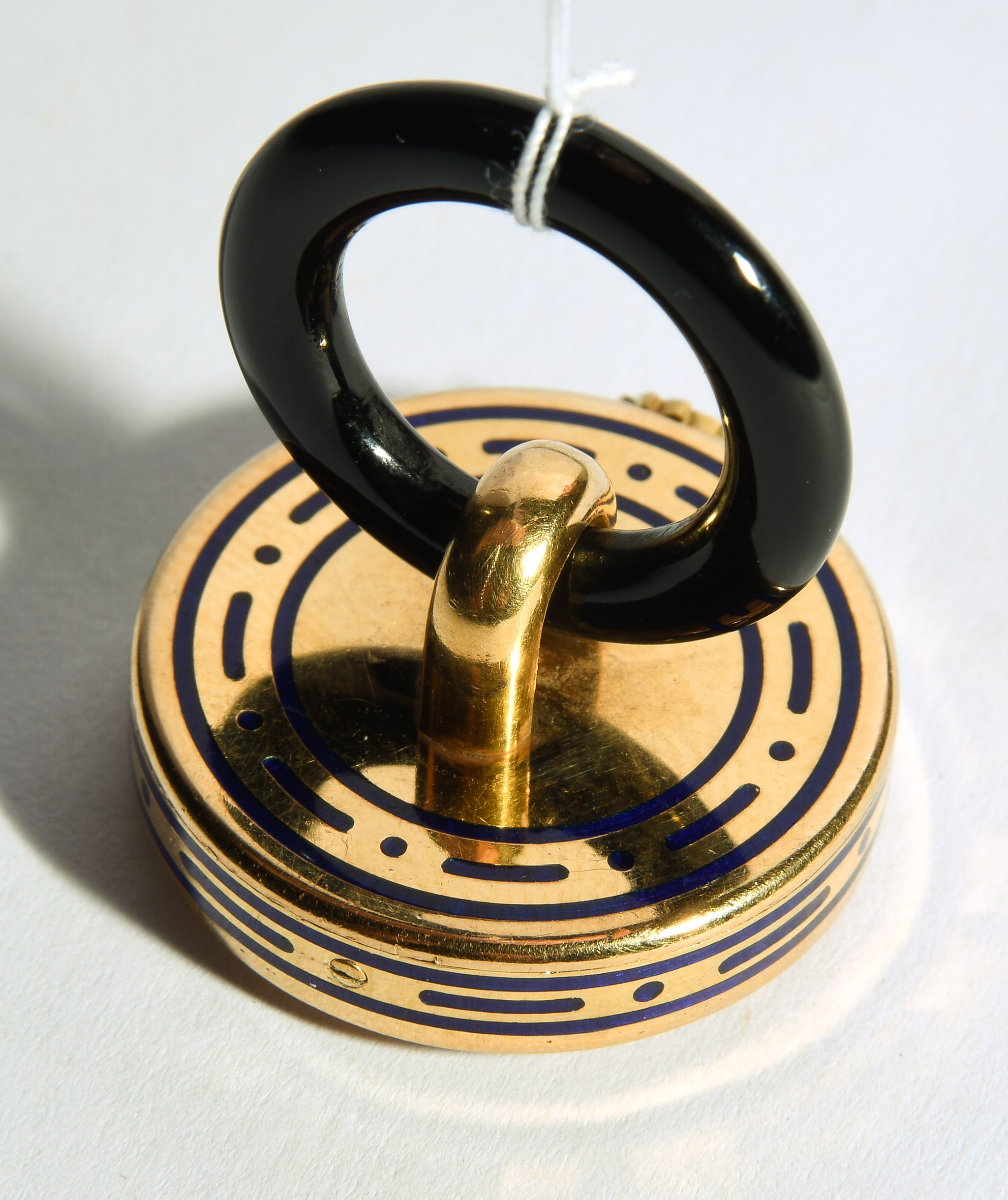 750 Gelbgold. Jaeger LeCoultre Handaufzug, Werk Nr. 2209081. 22 cm. Cartier Zifferblatt. Gehäuse blau emailliert mit Onyxring. 16,8 g. Funktionstüchtig.